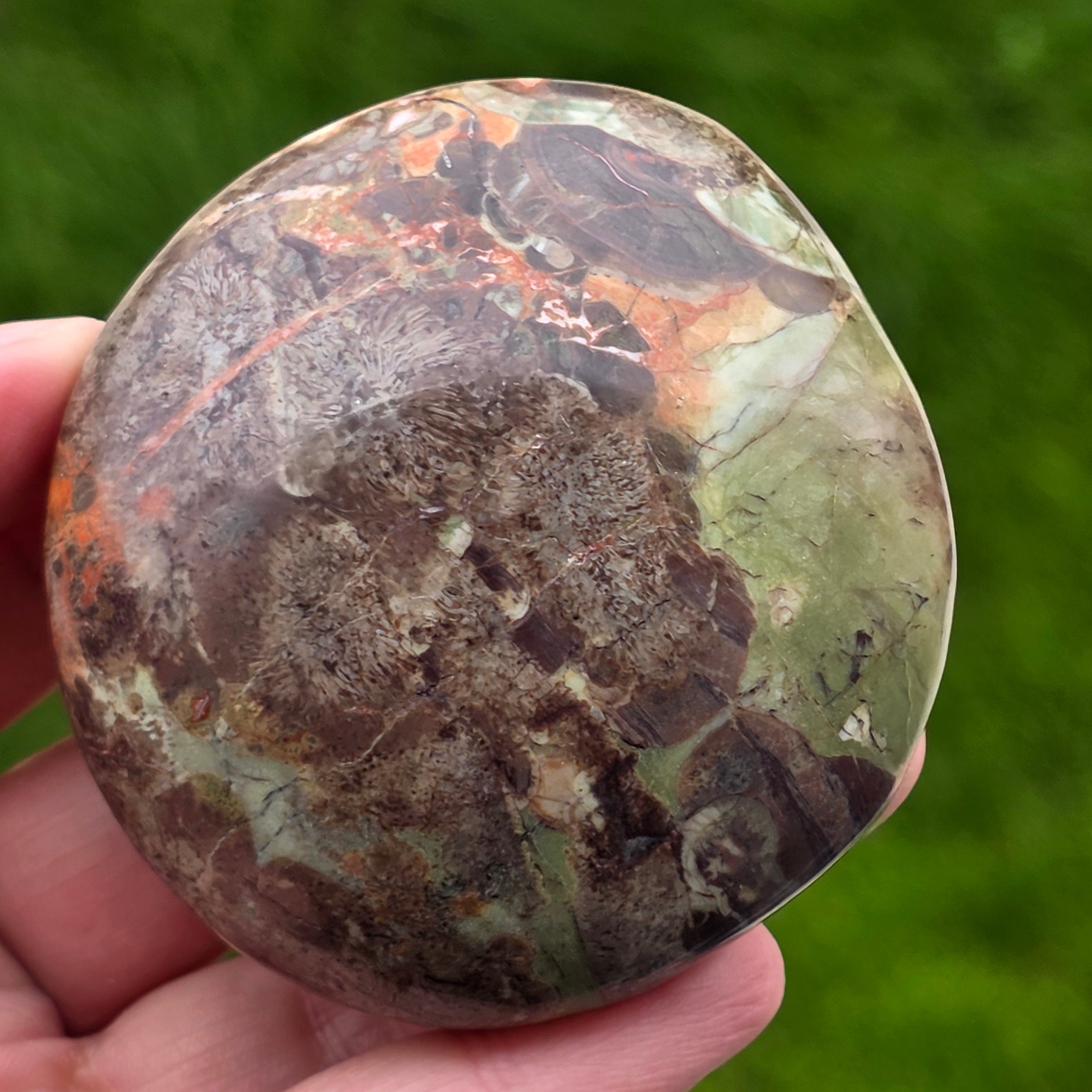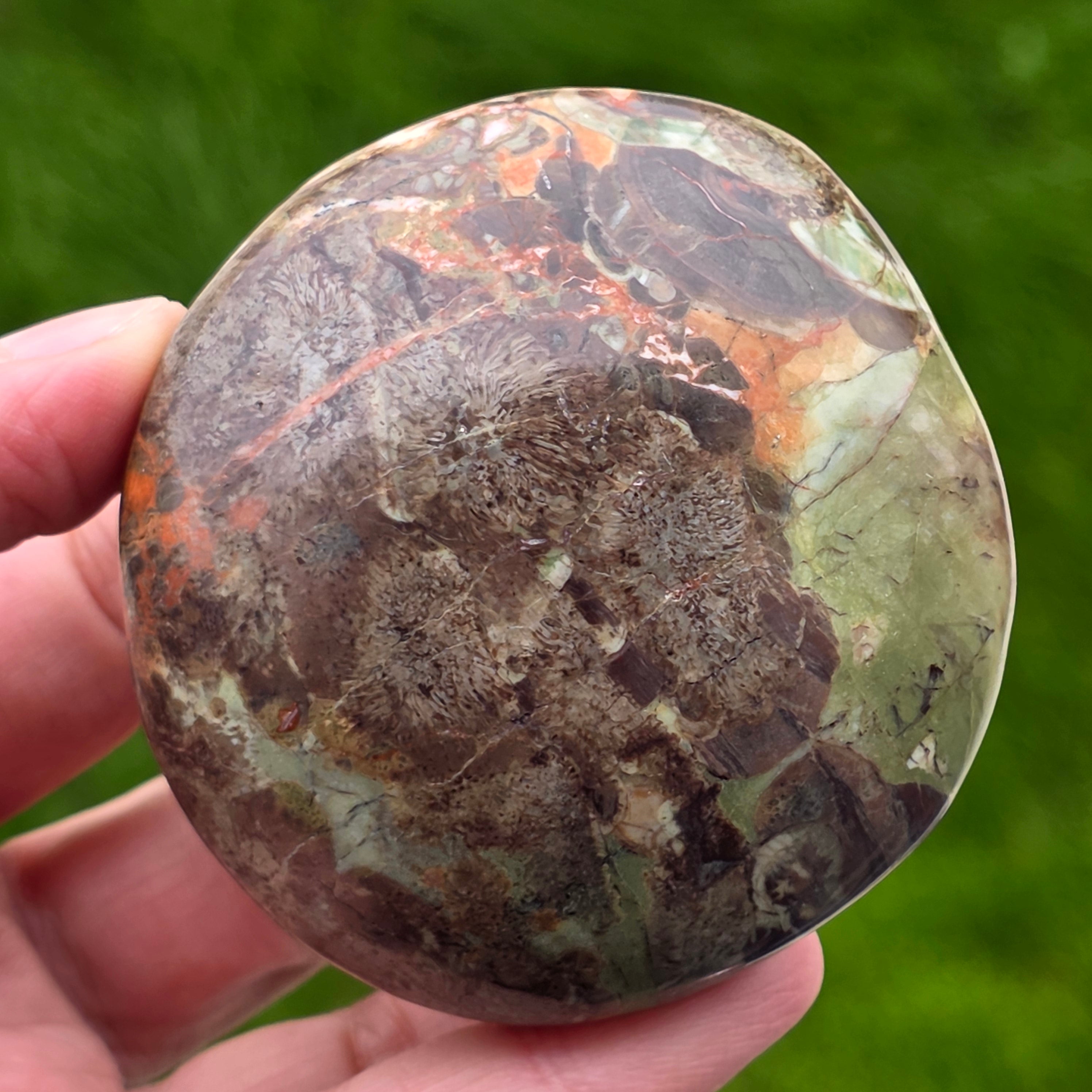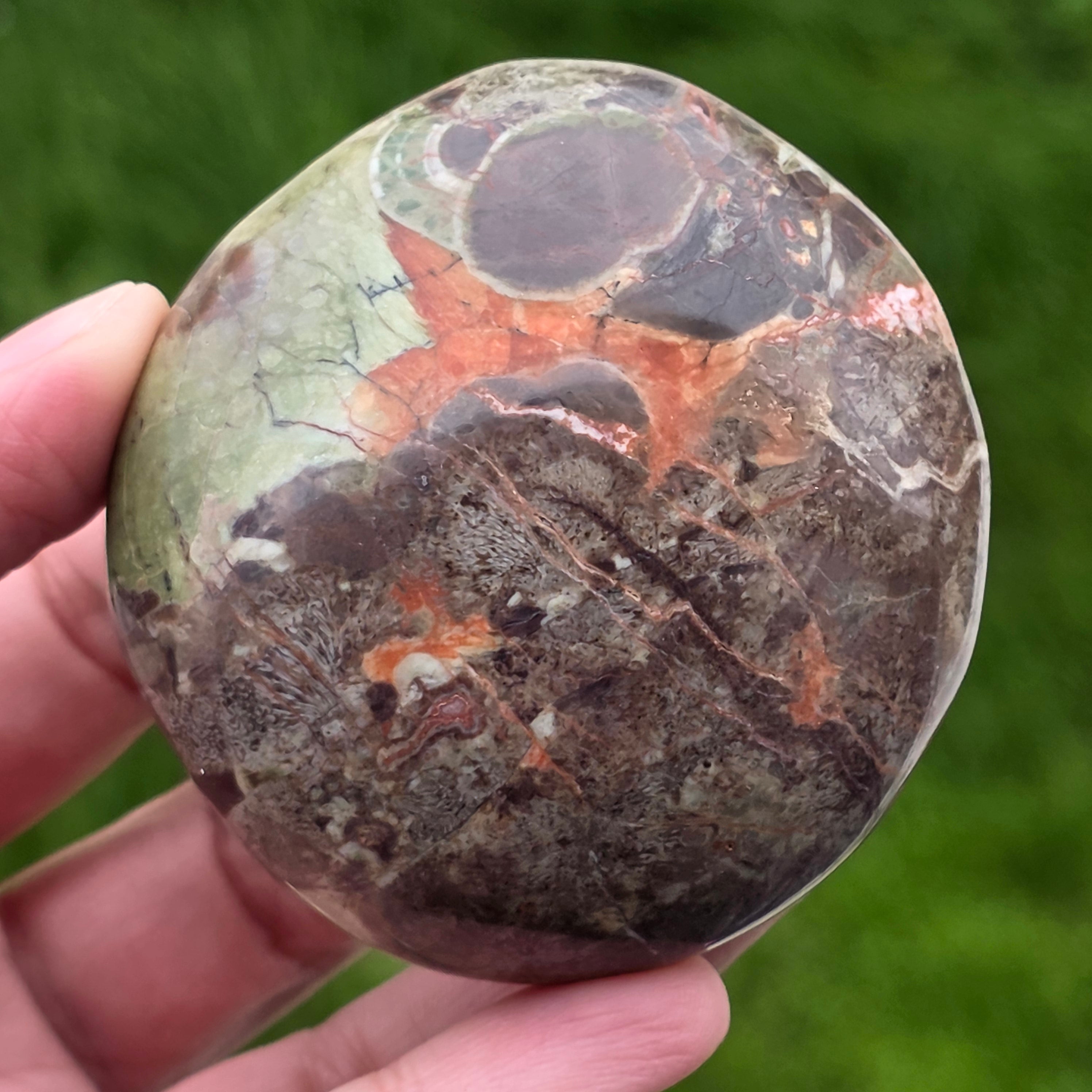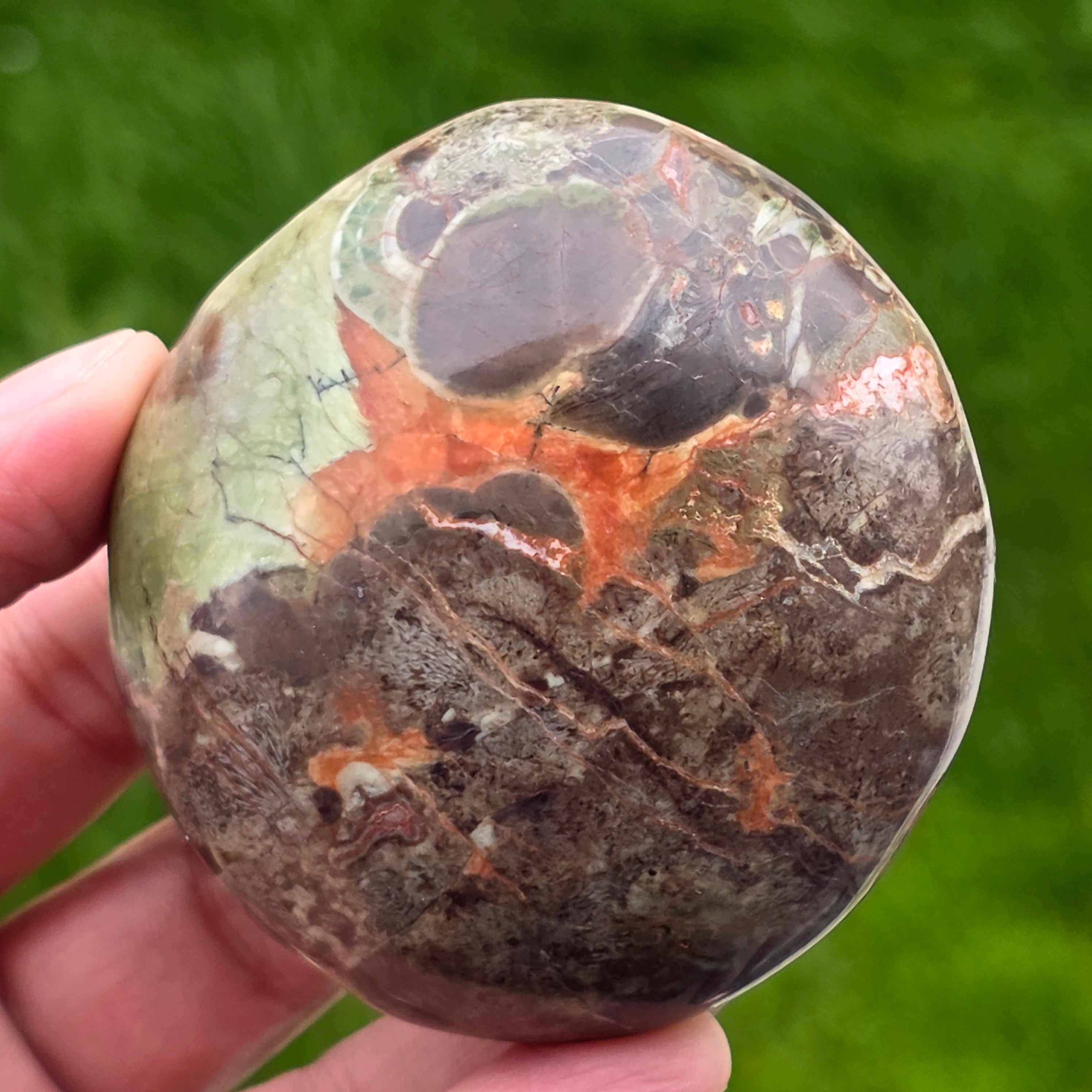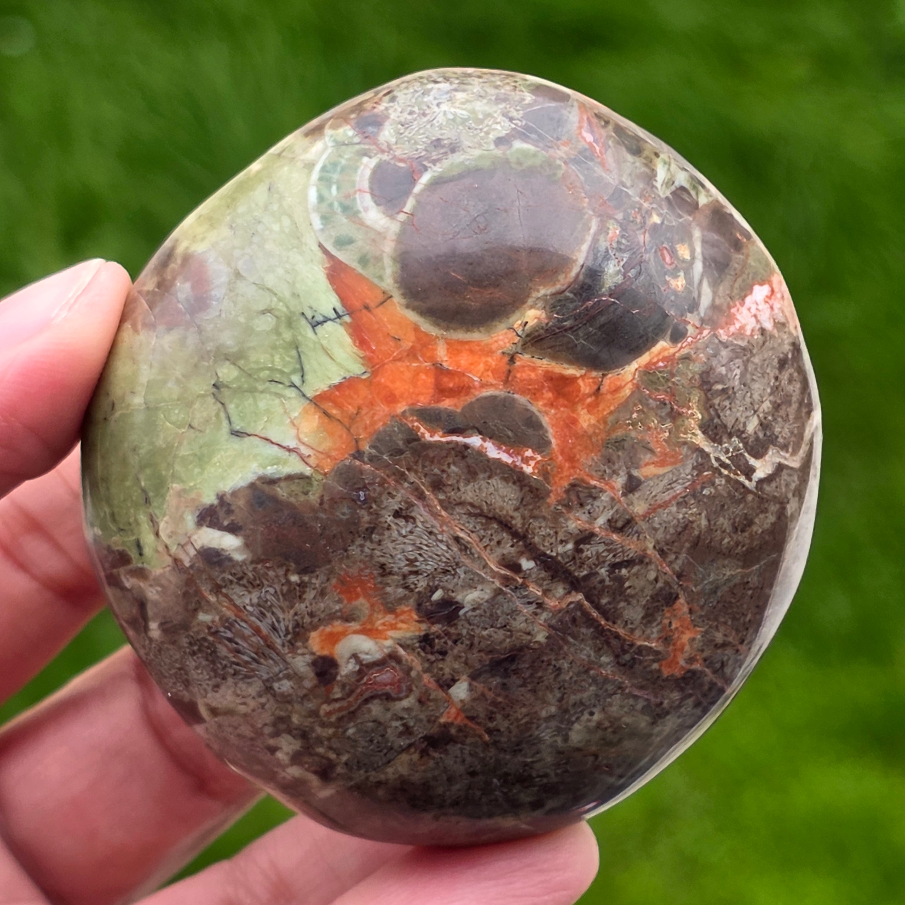 This carefully polished stone fits perfectly in the palm, wearing the silent energy of the mountains and the force of a firewood. Mountain riolite with warm brown shades, mineral green accents and volcanic orange irises reminds us of dense forests, wet soil and sky in flames.