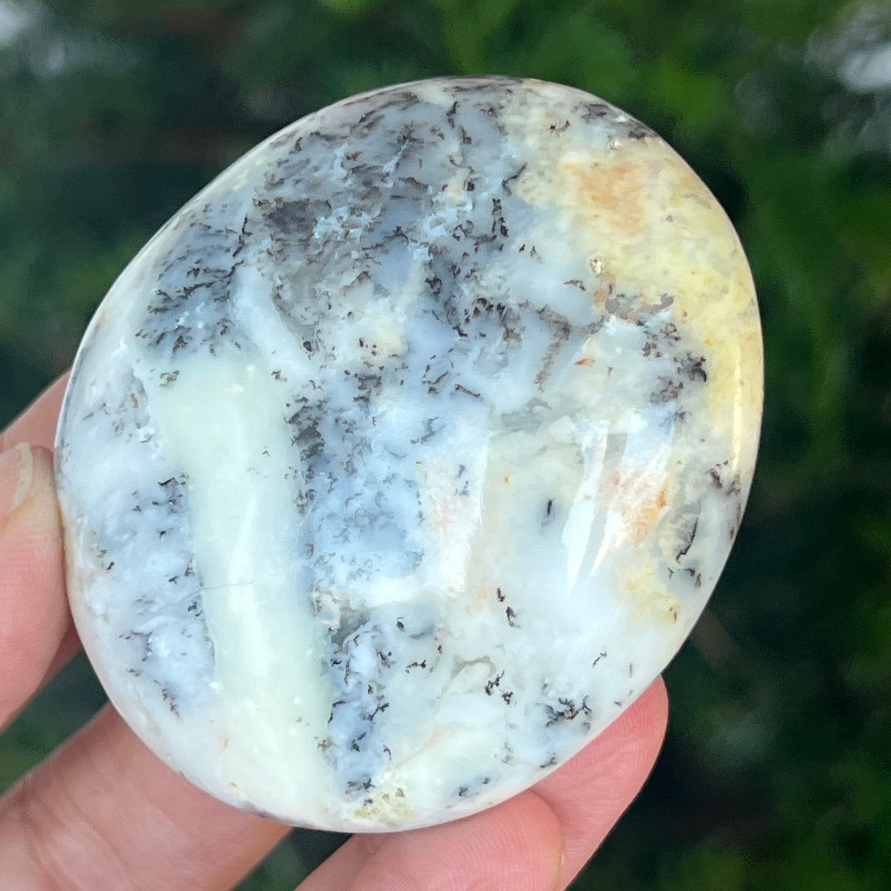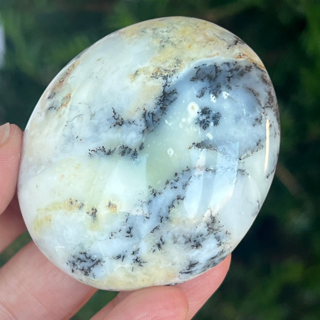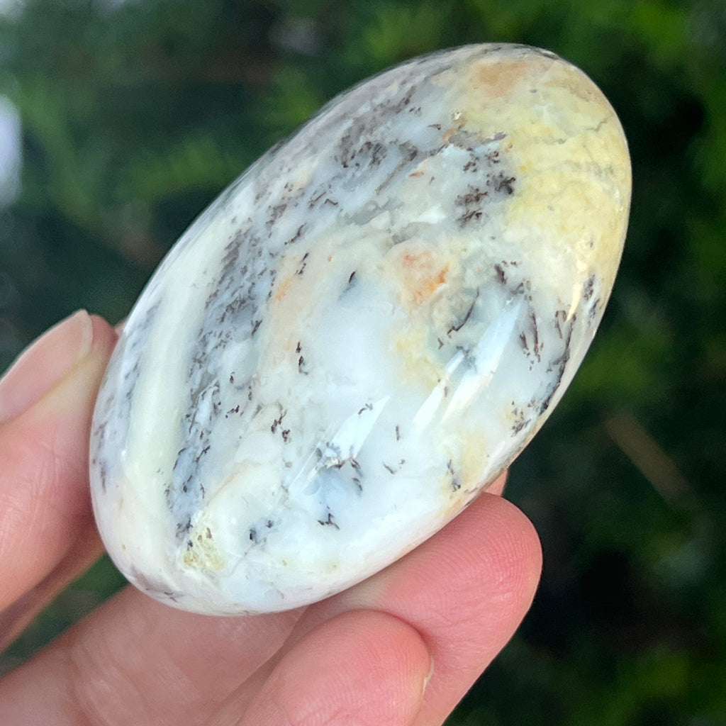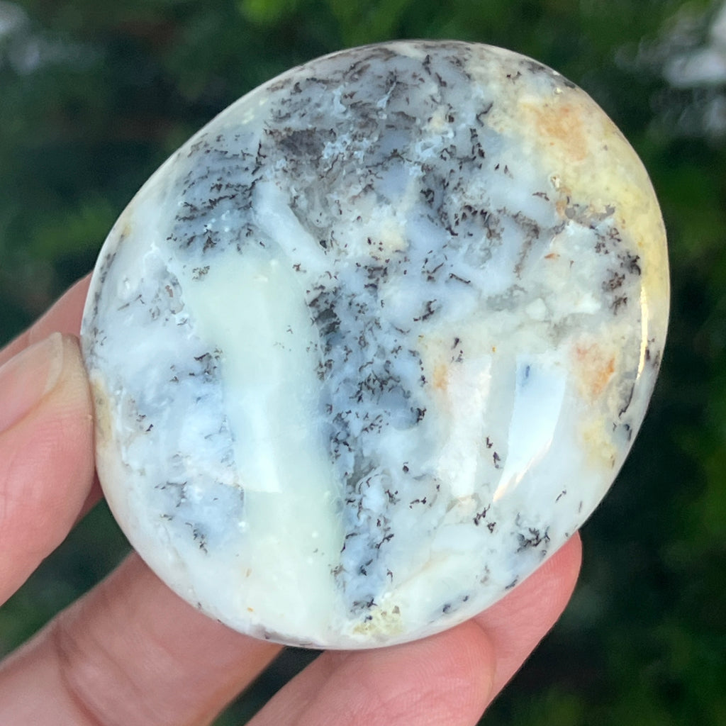 Acest palmstone din opal alb dendritic aduce o stare de pace și o ușoară expansiune a conștiinței. Ideal pentru meditație, pentru momente de reflecție sau pentru a fi păstrat ca piesă decorativă într-un spațiu sacru, el emană o frumusețe pură și organică, un echilibru între lumina albă și umbrele subtile ale naturii.