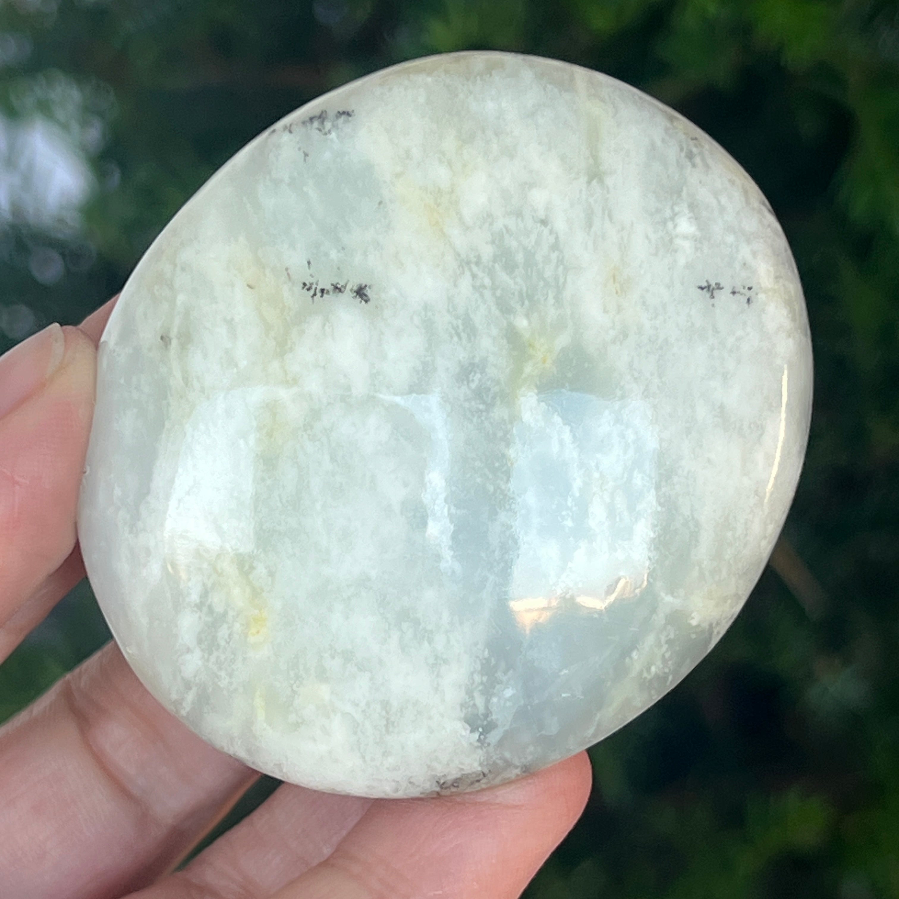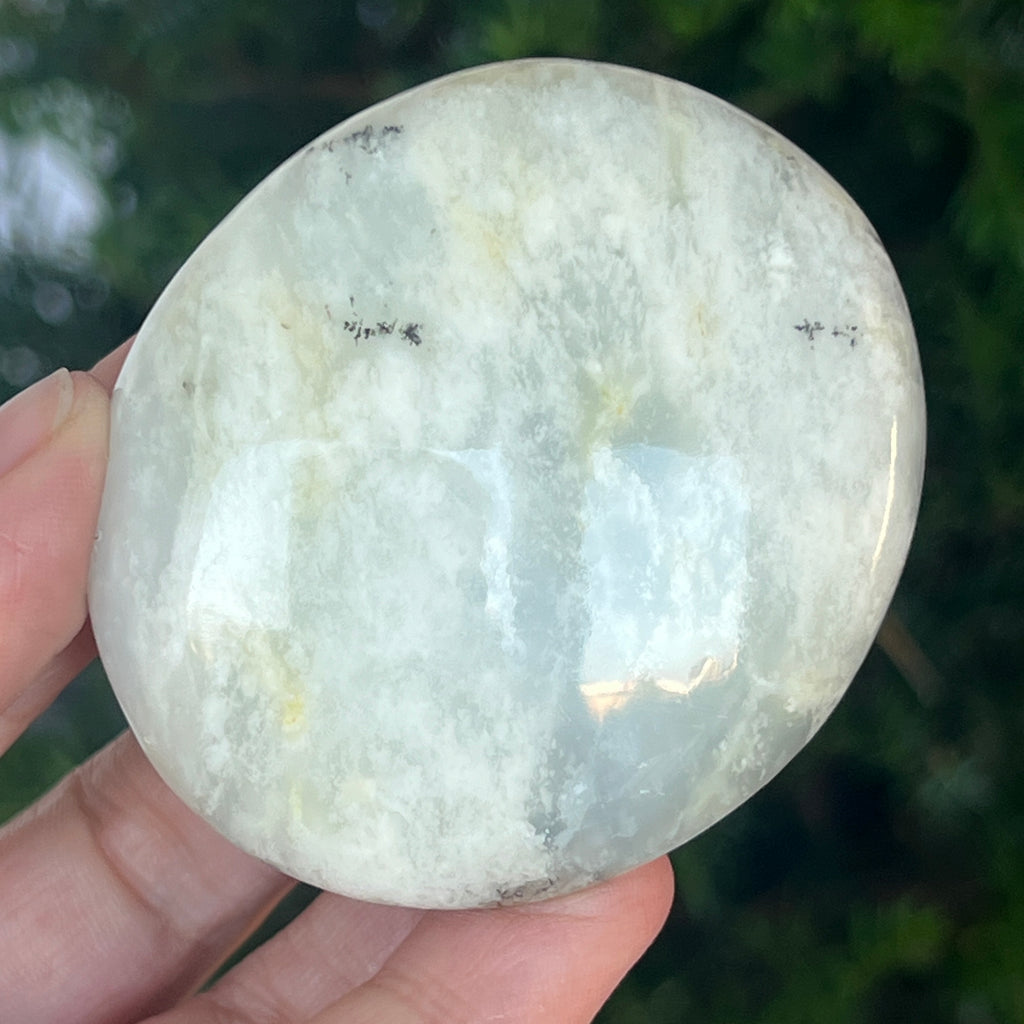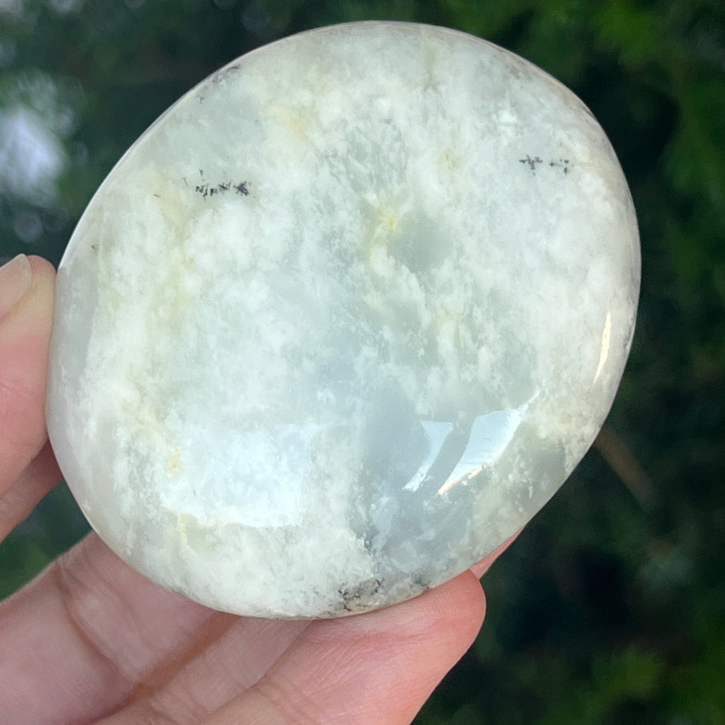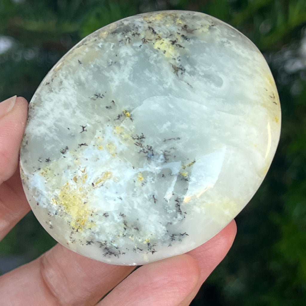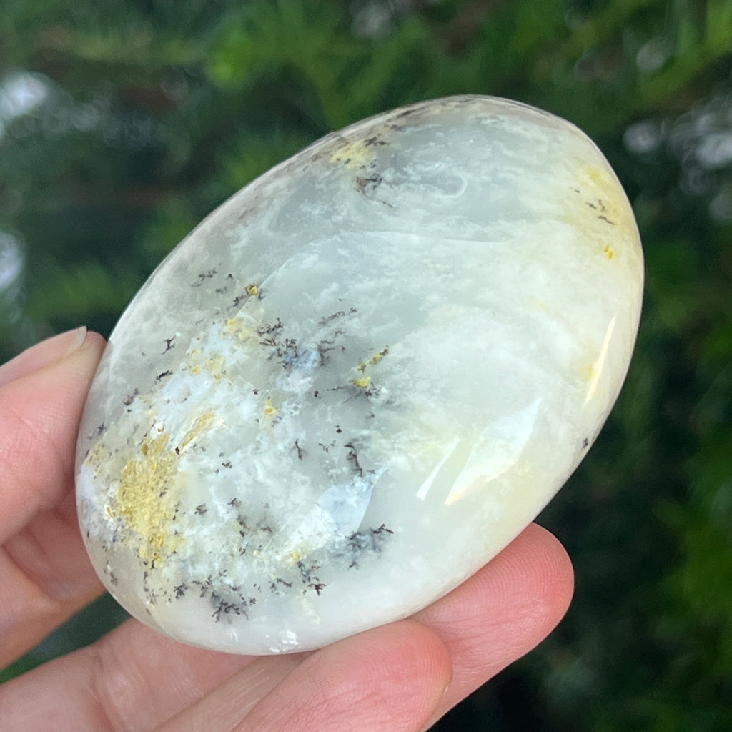 Acest palmstone din opal alb dendritic aduce o stare de pace și o ușoară expansiune a conștiinței. Ideal pentru meditație, pentru momente de reflecție sau pentru a fi păstrat ca piesă decorativă într-un spațiu sacru, el emană o frumusețe pură și organică, un echilibru între lumina albă și umbrele subtile ale naturii.