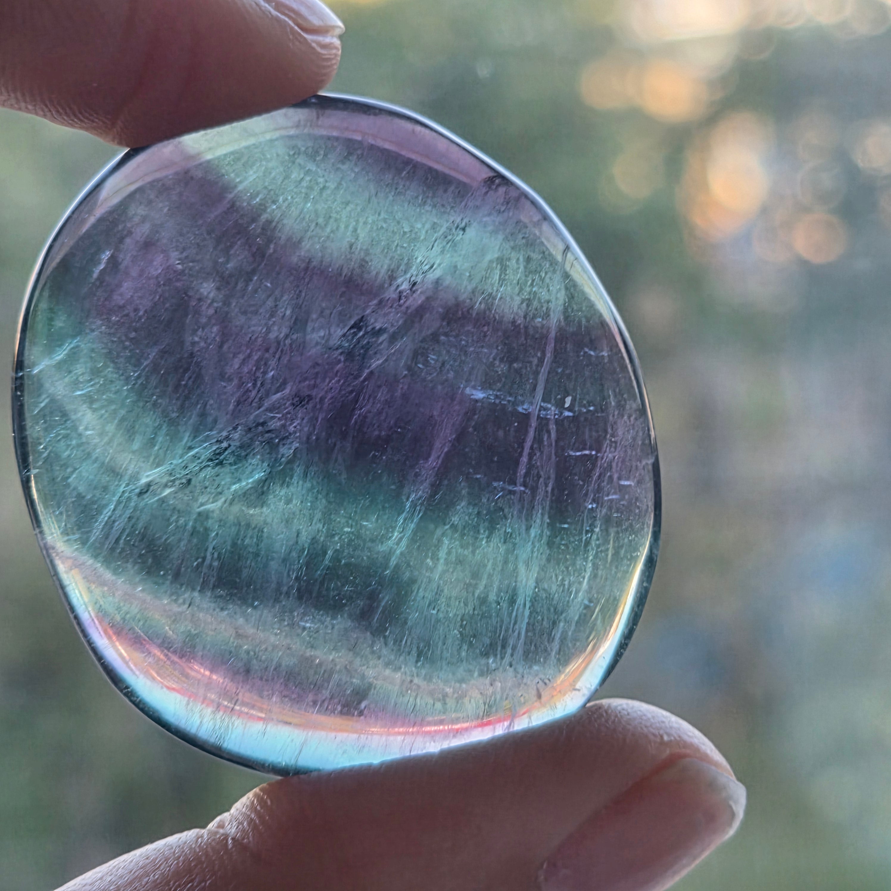 Rainbow fluorite palmstone, size: 4.5 cm