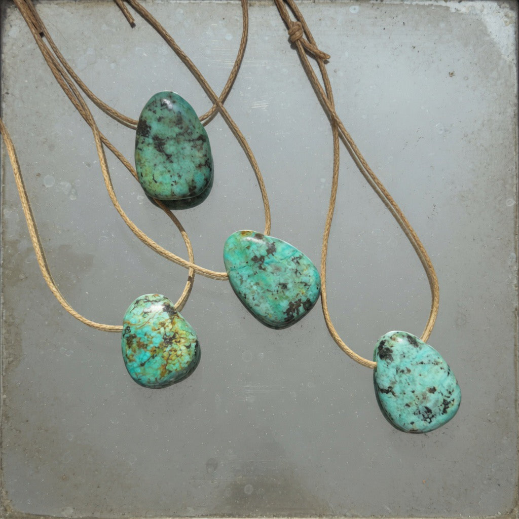 The African turquoise pendant carries the colors of the earth and sky, intertwined in an ancestral dance.
