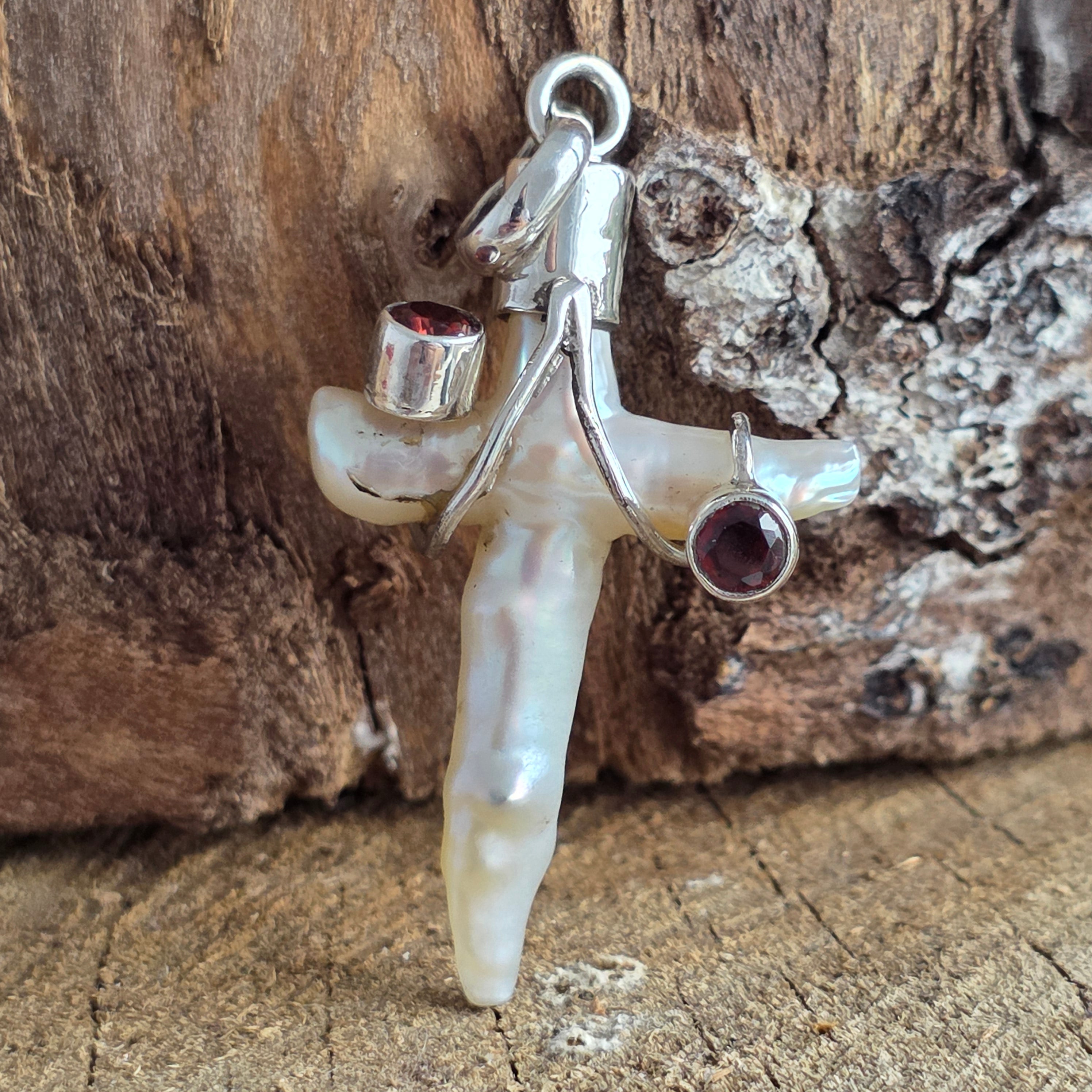 Un pandantiv cu design organic și expresiv, lucrat manual din sidef natural în formă de cruce neregulată, decorată cu două pietre de granat cu strălucire rubinie.