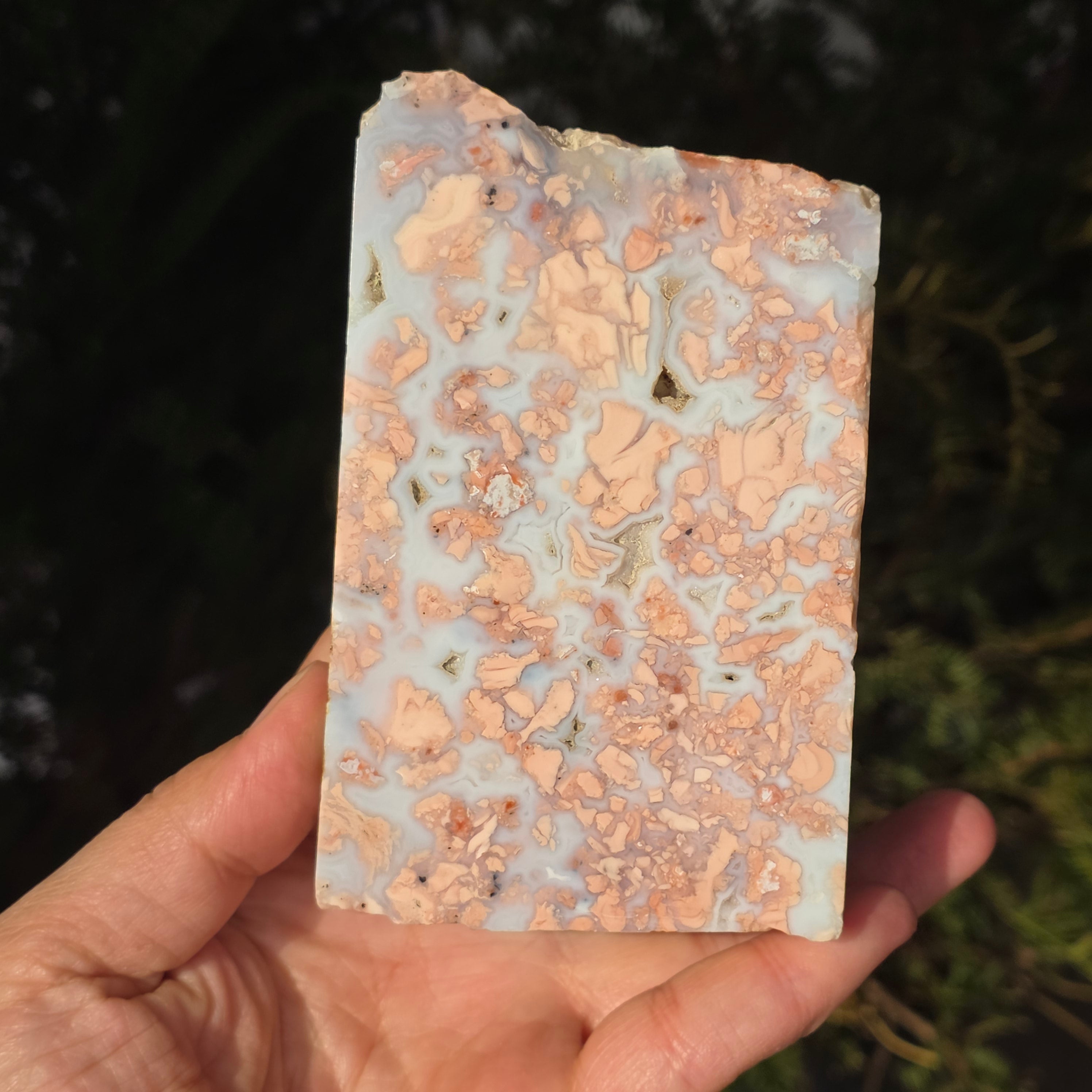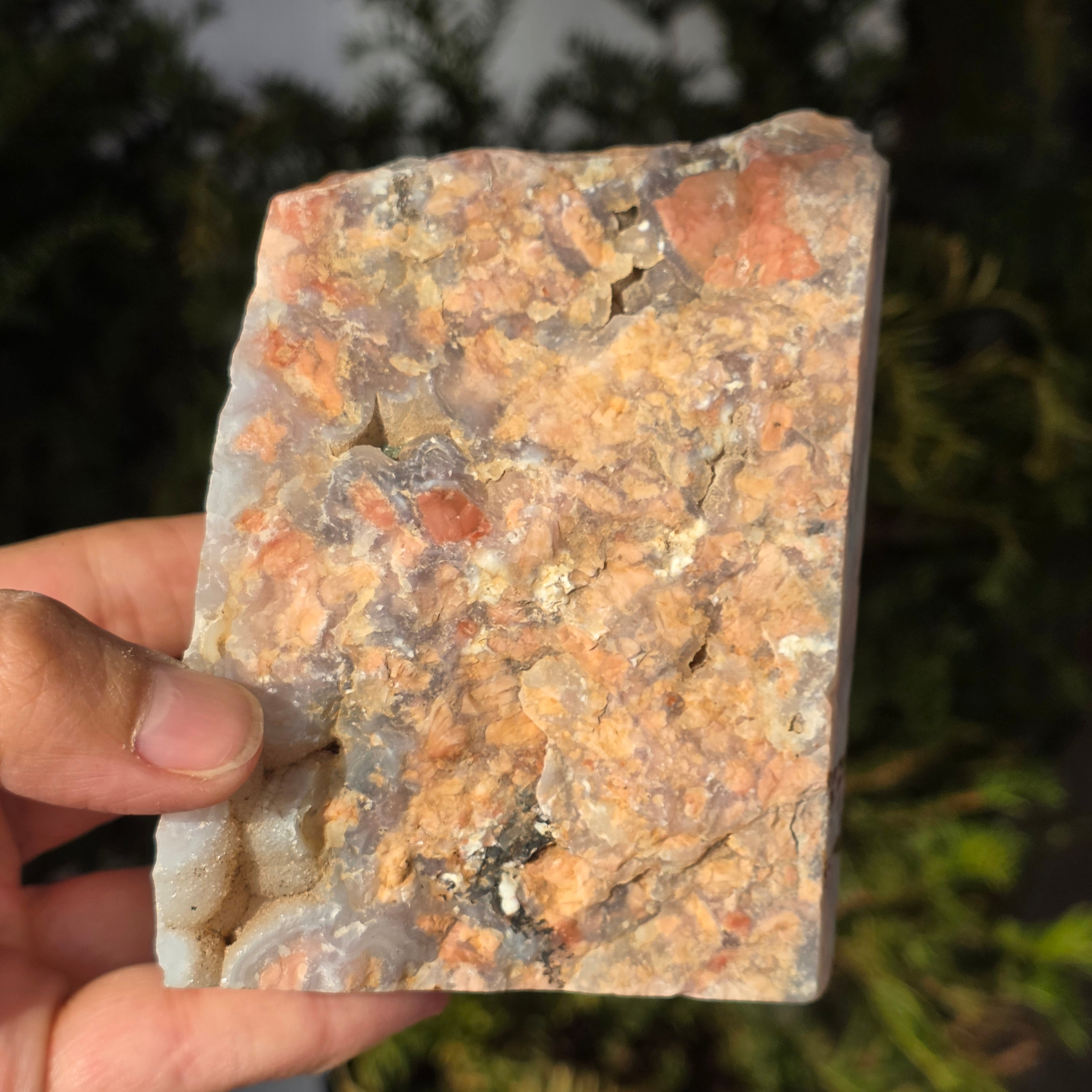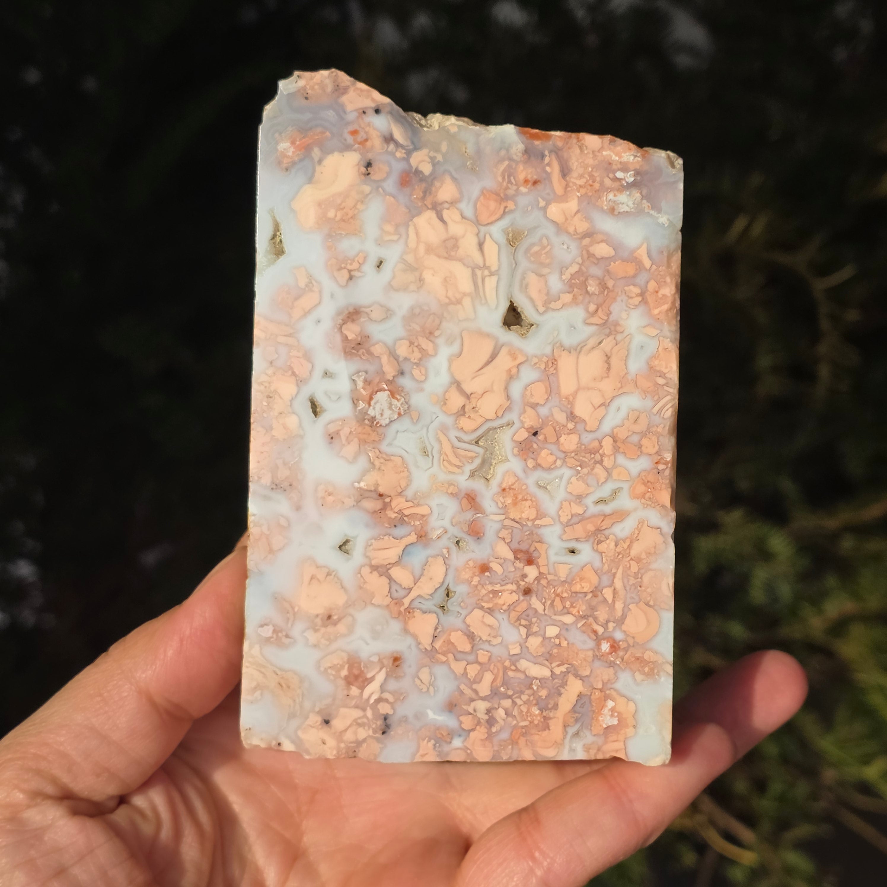 Peach agate is a variety of chalcedony, belonging to the microcrystalline quartz family (SiO₂). It forms in the cavities of volcanic rocks, where silica-rich solutions are deposited successively in fine layers, generating the characteristic structure of agate. Its delicate color, in shades of peach, pale pink, or cream, is determined by the presence of mineral impurities, especially iron oxides dispersed throughout the quartz. The internal structure may feature subtle bands or translucent areas, typical of agates.