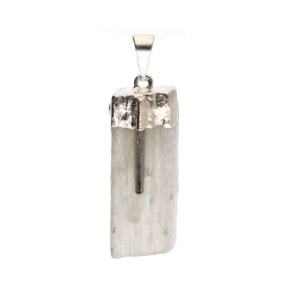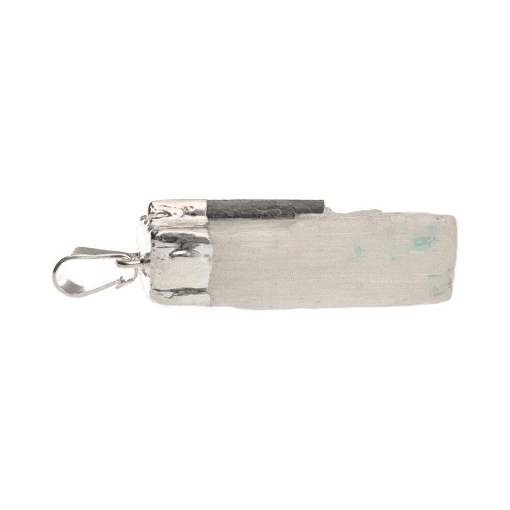 The pendant from the selenite with tourmaline, blossomed with silver, combines the pure light of the selenite with the protective energy of the black tourmaline, amplified by the brightness of the silver.