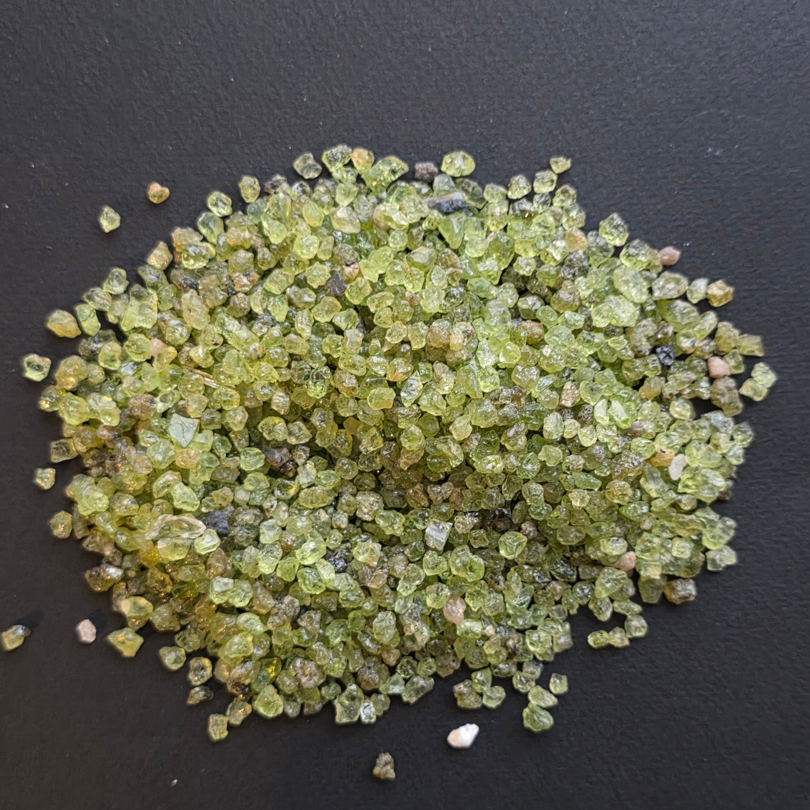Peridotul, una dintre puținele pietre care există doar în tonuri naturale de verde, își dezvăluie în aceste chipsuri fine toată luminozitatea și prospețimea sa caracteristică. Fragmentele mici, delicate, par stropi de lumină filtrată prin frunze în plină vară: nuanțe de verde crud, verde măsliniu și reflexe calde, ușor aurii, specifice peridotului autentic.