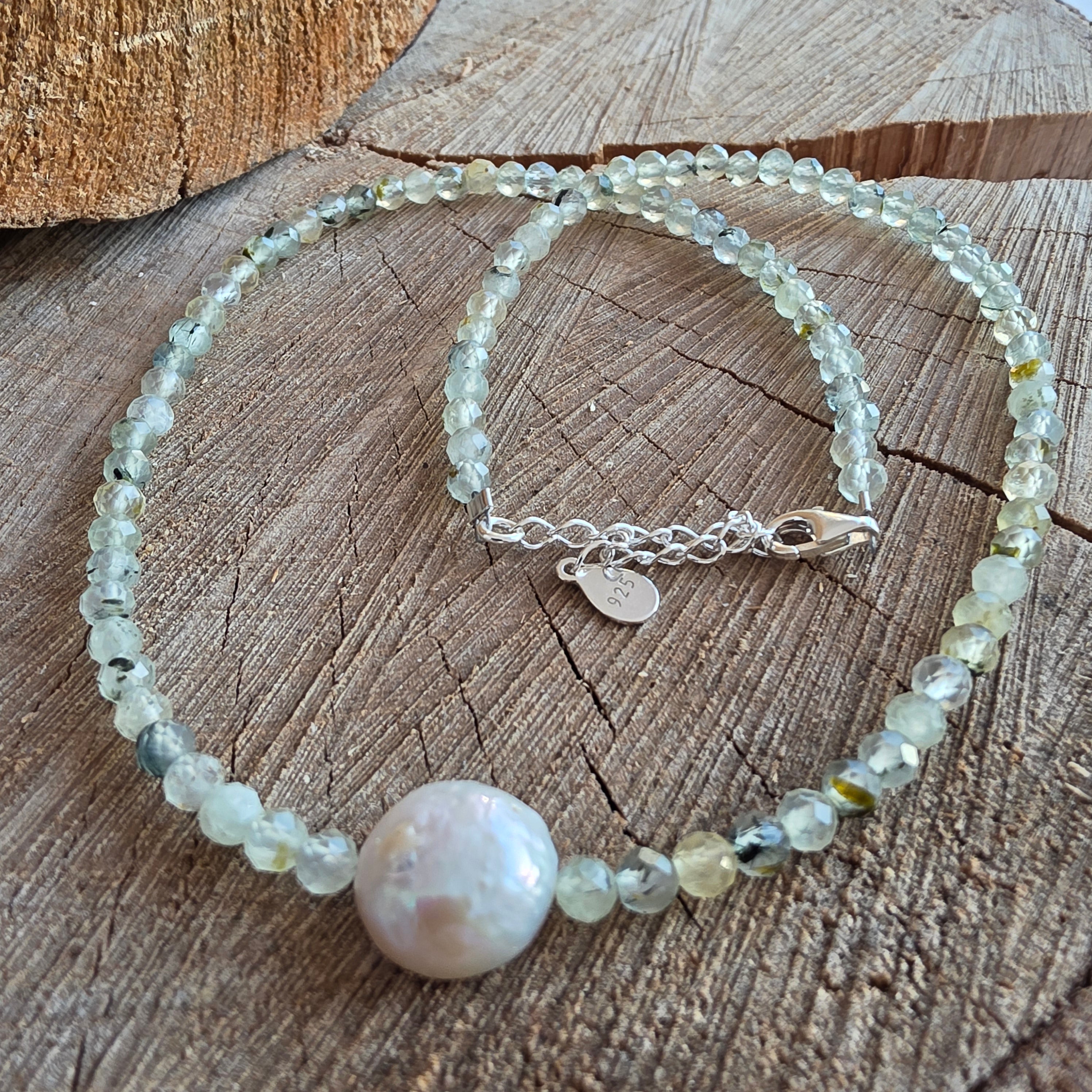 A delicate and luminous necklace, made of 4 mm faceted prehnite beads, arranged subtly in a calm and balanced rhythm. At the center of the design, a natural pearl of approximately 1 cm becomes the point of serenity and refinement, adding a touch of timeless elegance to the jewelry.
