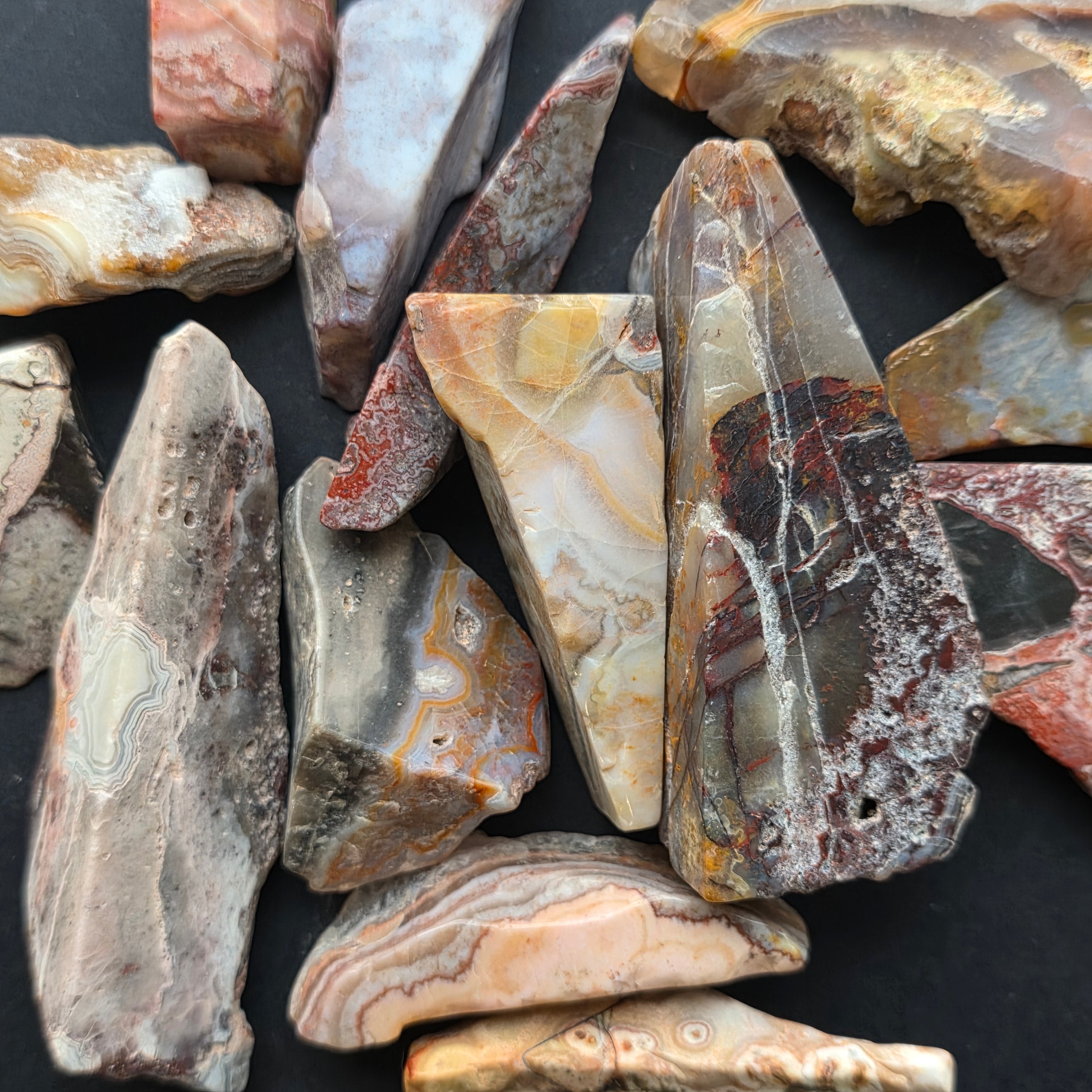 Agatul Crazy din Mexic este una dintre cele mai vibrante și spectaculoase varietăți de agat, celebru pentru liniile sale ondulate și jocurile nebunești de culori ce par desenate de o mână liberă, fără reguli. În această felie naturală, mică dar extrem de expresivă, se dezvăluie întreaga poveste a pietrei: straturi pământii, nuanțe calde de caramel, roșu aprins, portocaliu, gri și crem, amestecate în modele spiralate care par să pulseze cu viață.