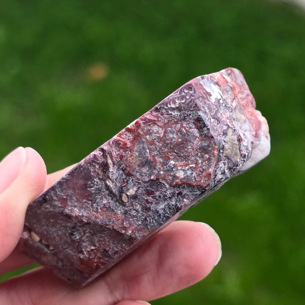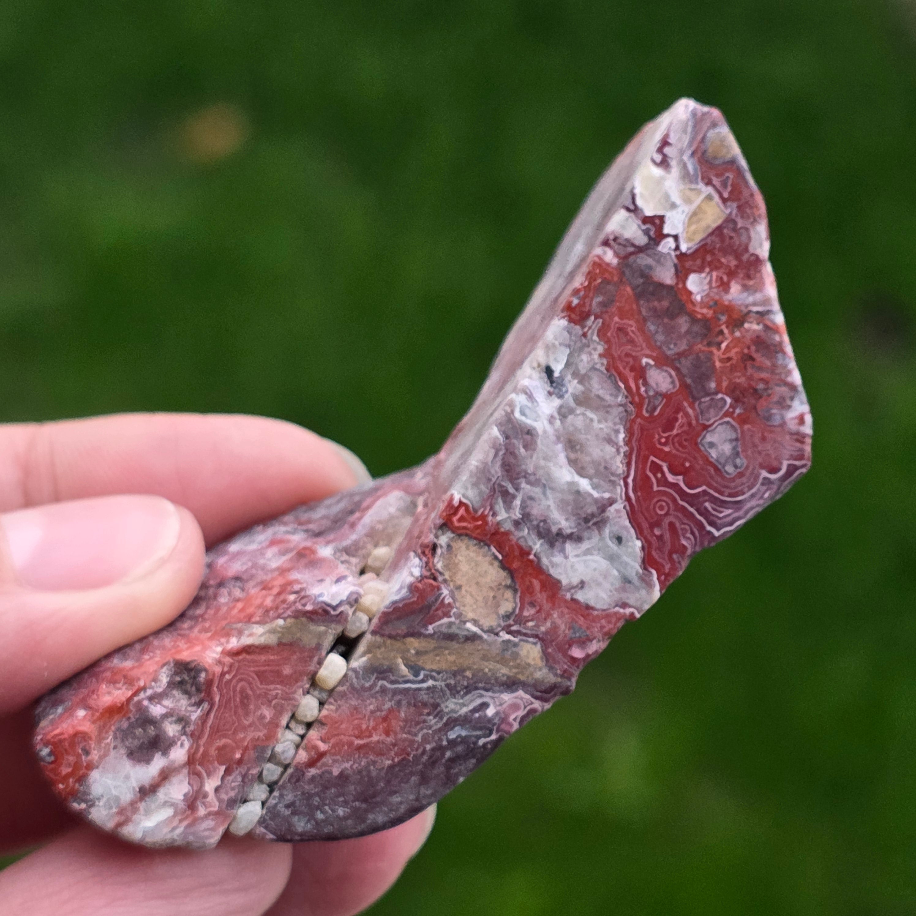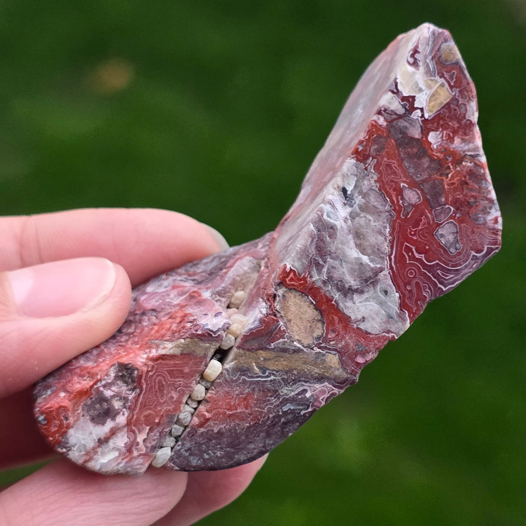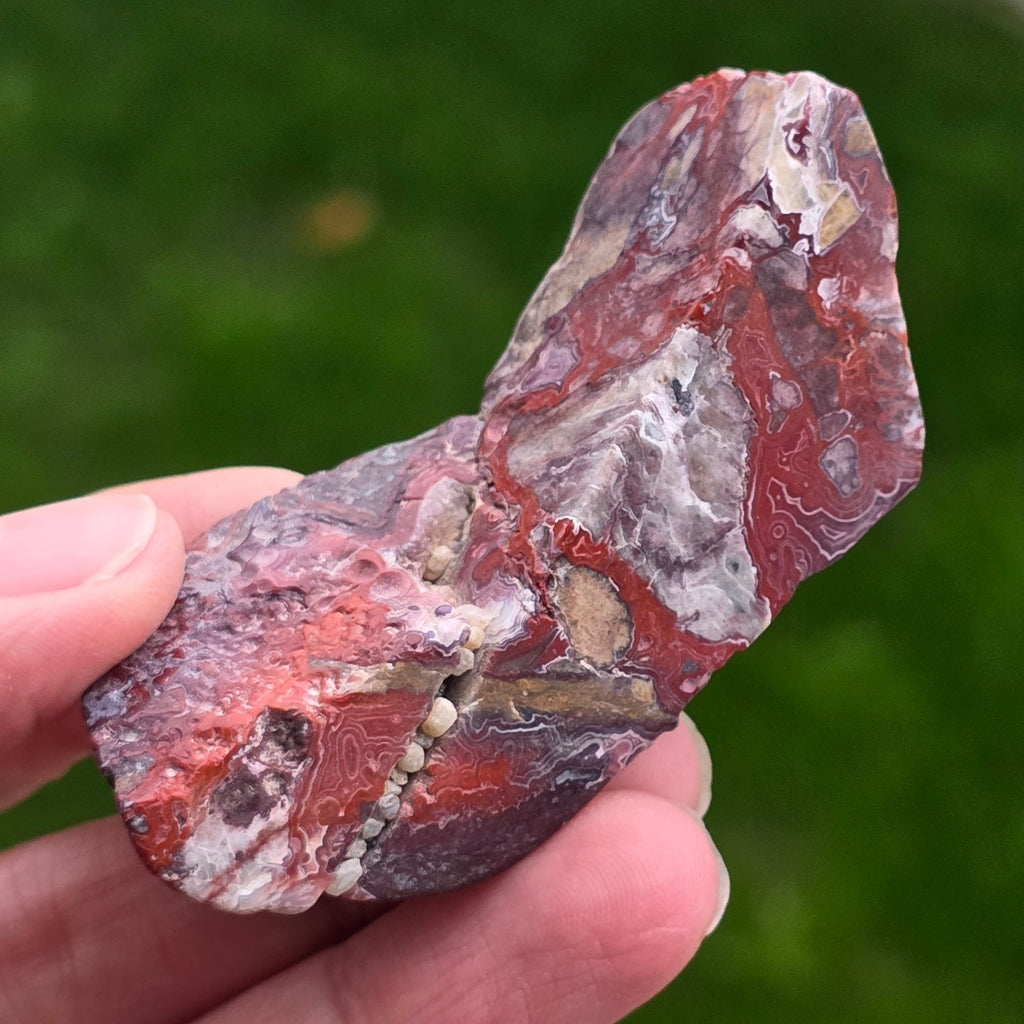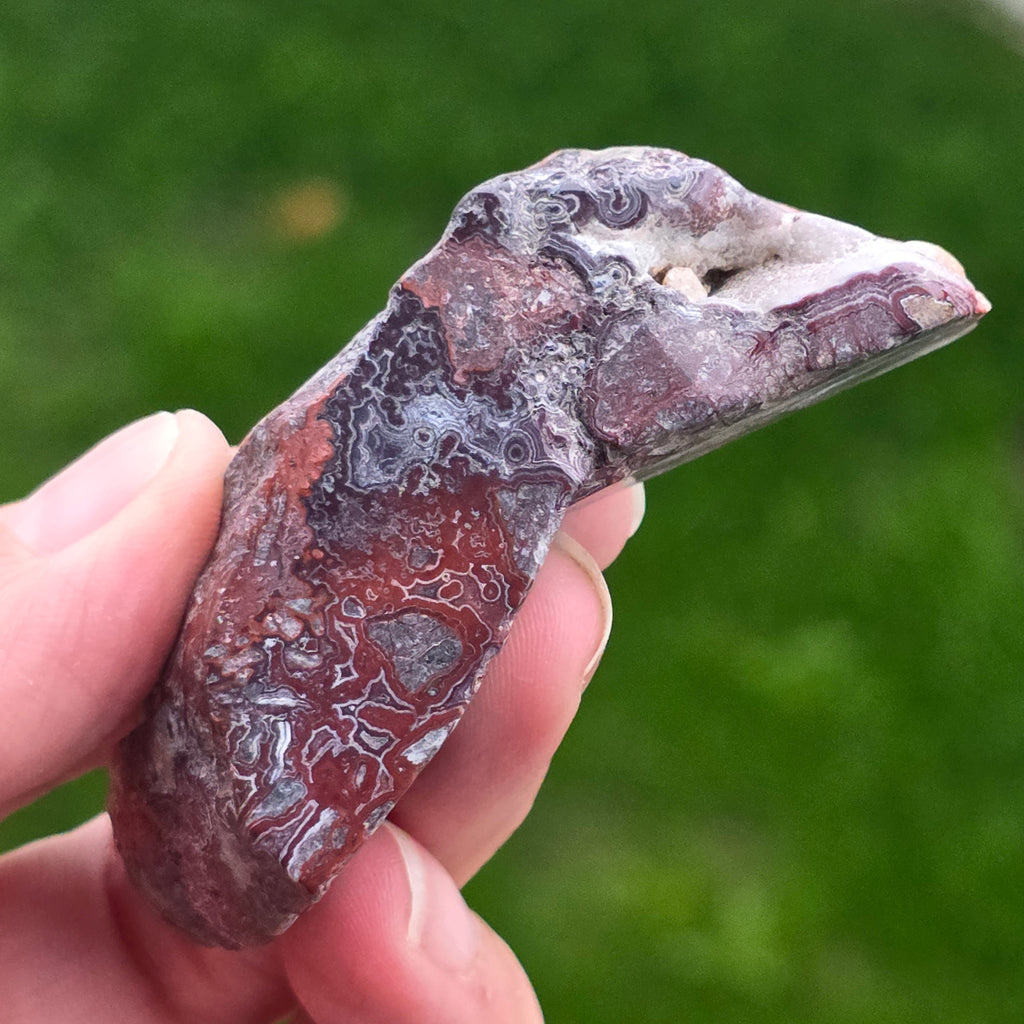 Agatul Crazy din Mexic este una dintre cele mai vibrante și spectaculoase varietăți de agat, celebru pentru liniile sale ondulate și jocurile nebunești de culori ce par desenate de o mână liberă, fără reguli. În această felie naturală, mică dar extrem de expresivă, se dezvăluie întreaga poveste a pietrei: straturi pământii, nuanțe calde de caramel, roșu aprins, portocaliu, gri și crem, amestecate în modele spiralate care par să pulseze cu viață.