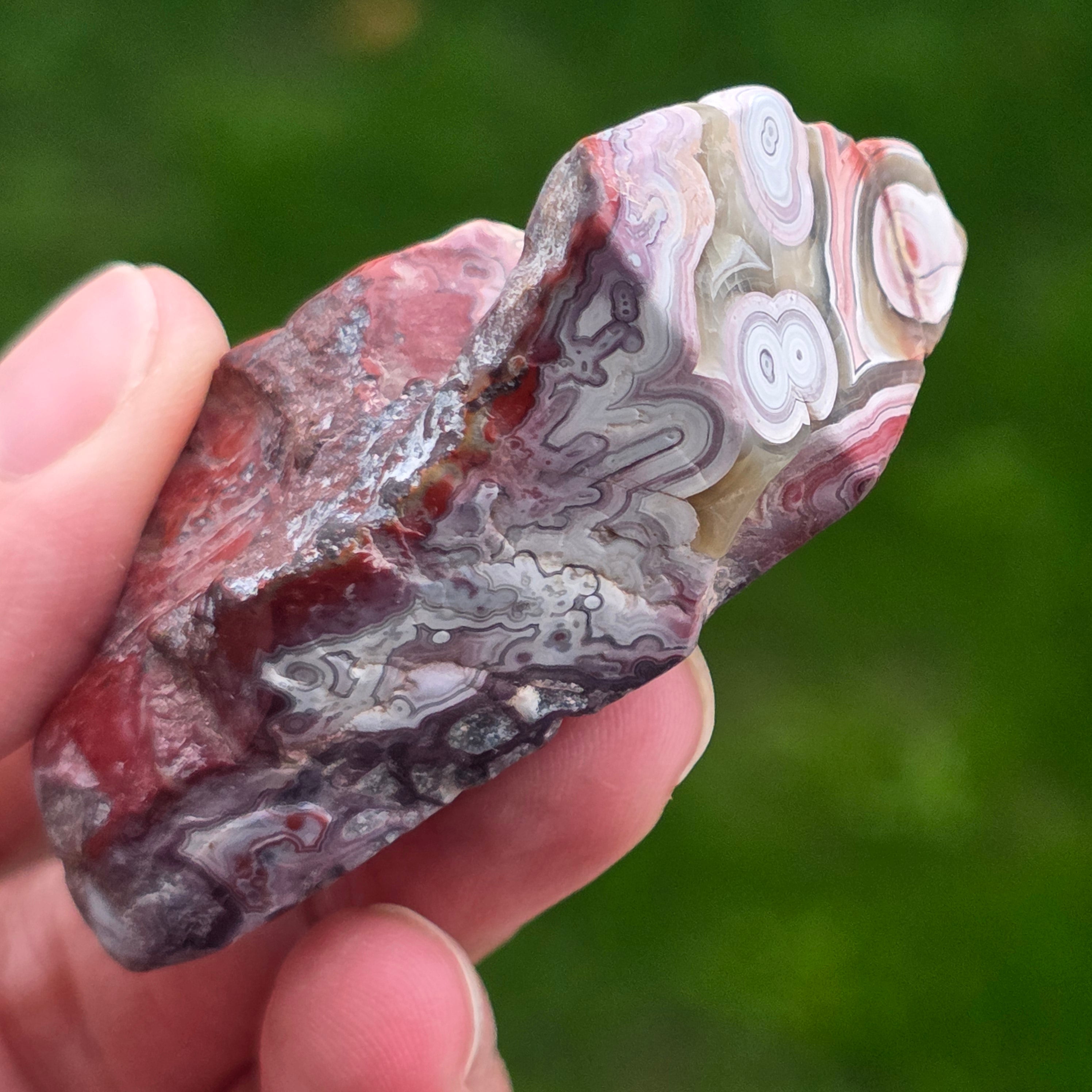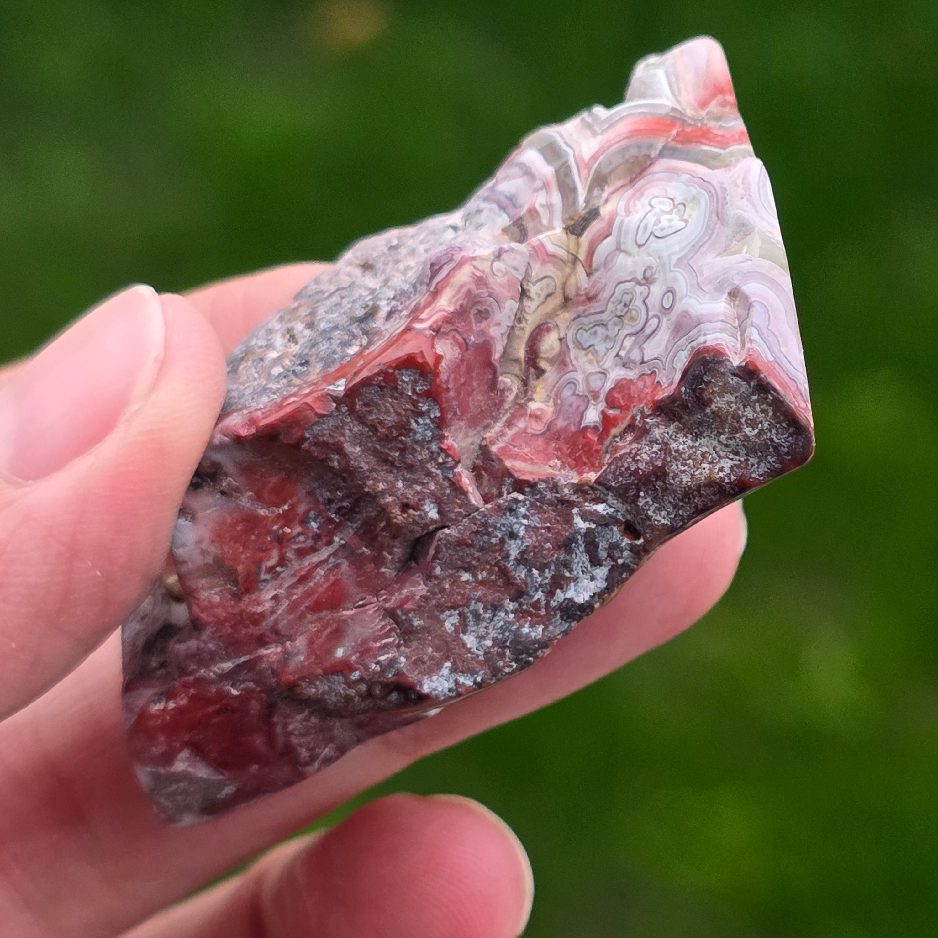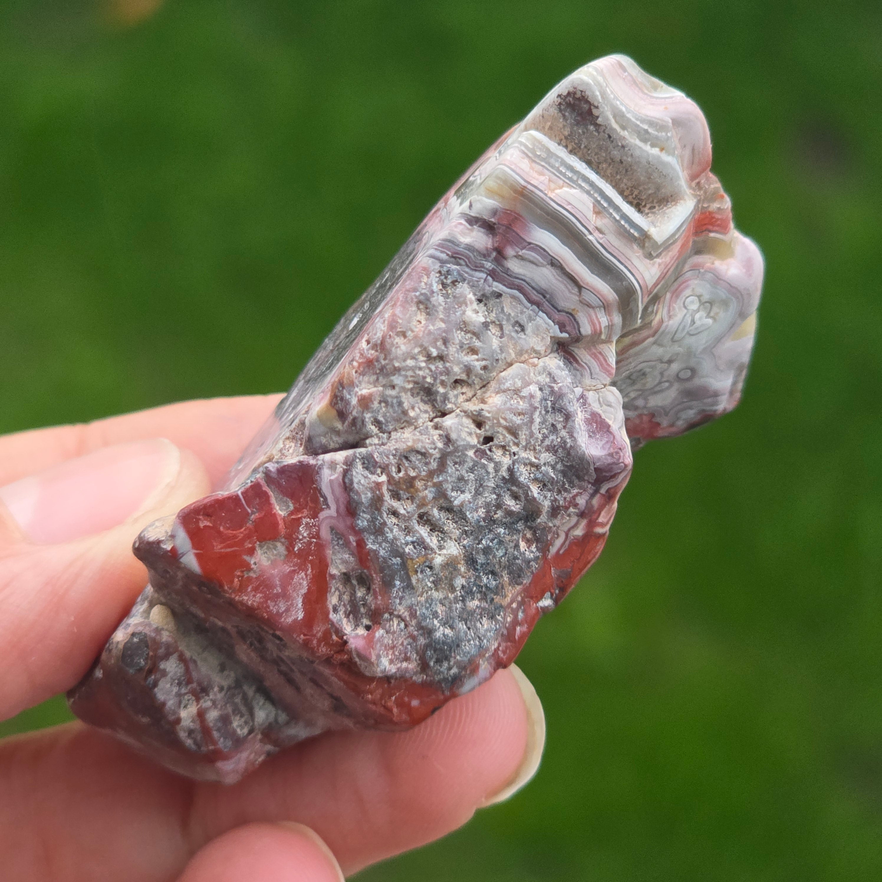 Agatul Crazy din Mexic este una dintre cele mai vibrante și spectaculoase varietăți de agat, celebru pentru liniile sale ondulate și jocurile nebunești de culori ce par desenate de o mână liberă, fără reguli. În această felie naturală, mică dar extrem de expresivă, se dezvăluie întreaga poveste a pietrei: straturi pământii, nuanțe calde de caramel, roșu aprins, portocaliu, gri și crem, amestecate în modele spiralate care par să pulseze cu viață.