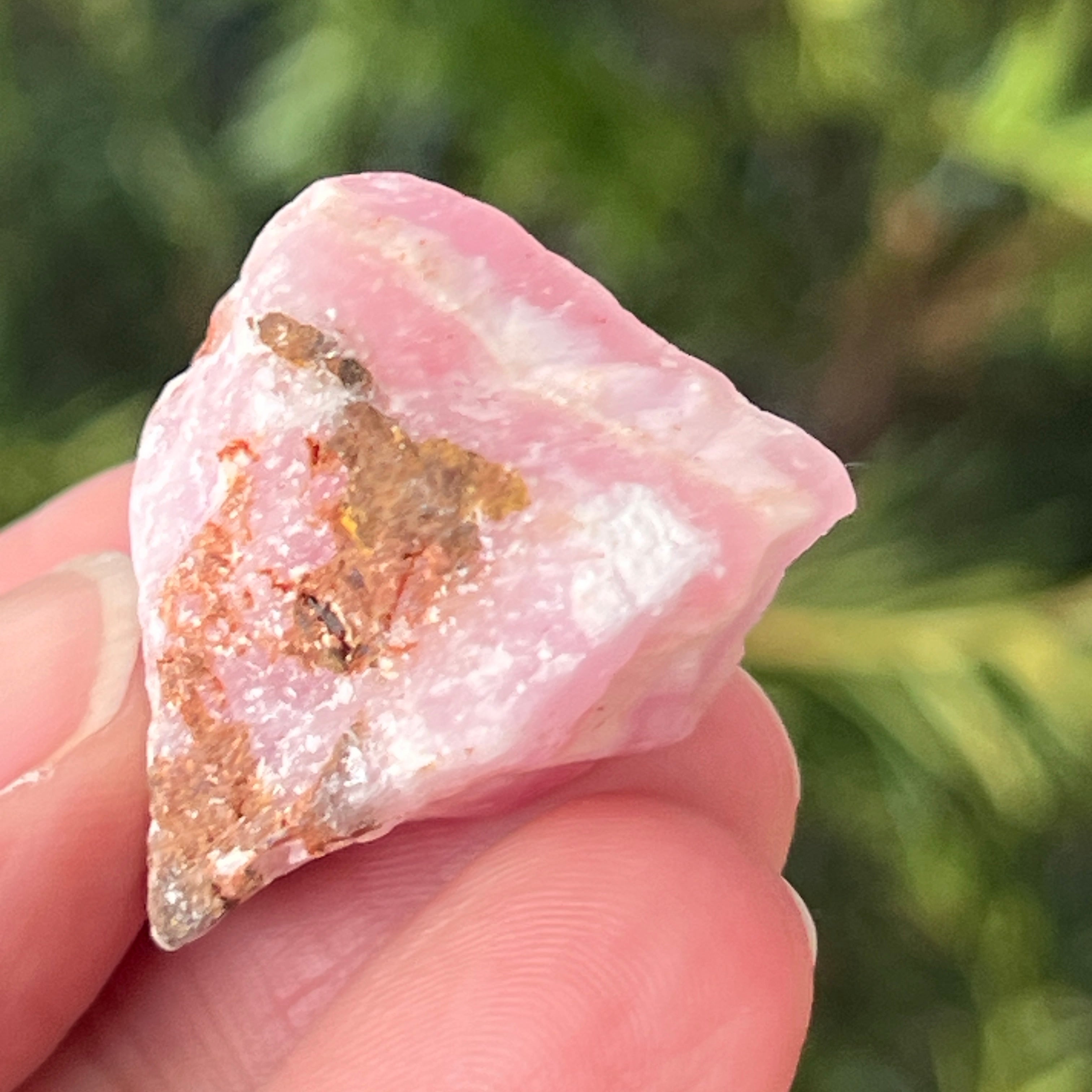 Pink aragonite is a less common semi-precious stone. It is made up of calcium carbonate and has a pink-orange color due to iron impurities.