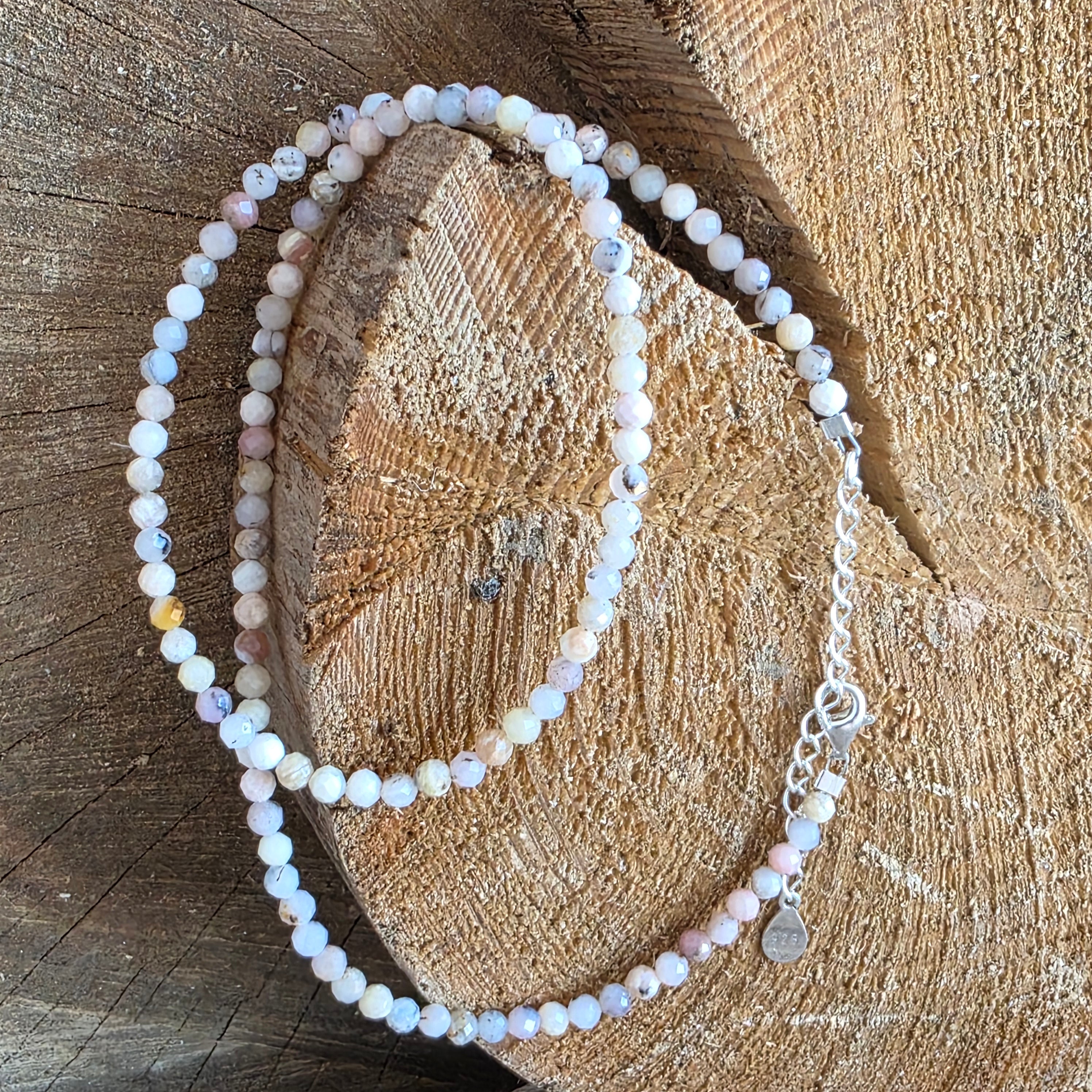A delicate and luminous necklace, made from 3 mm faceted pink opal beads, forming a fine and harmonious line around the neck. The soft milky pink tones, with subtle reflections and a slightly translucent texture, give the jewelry a warm and refined air. The subtle faceting adds depth and a gentle sparkle, without overpowering, maintaining an elegant visual balance.