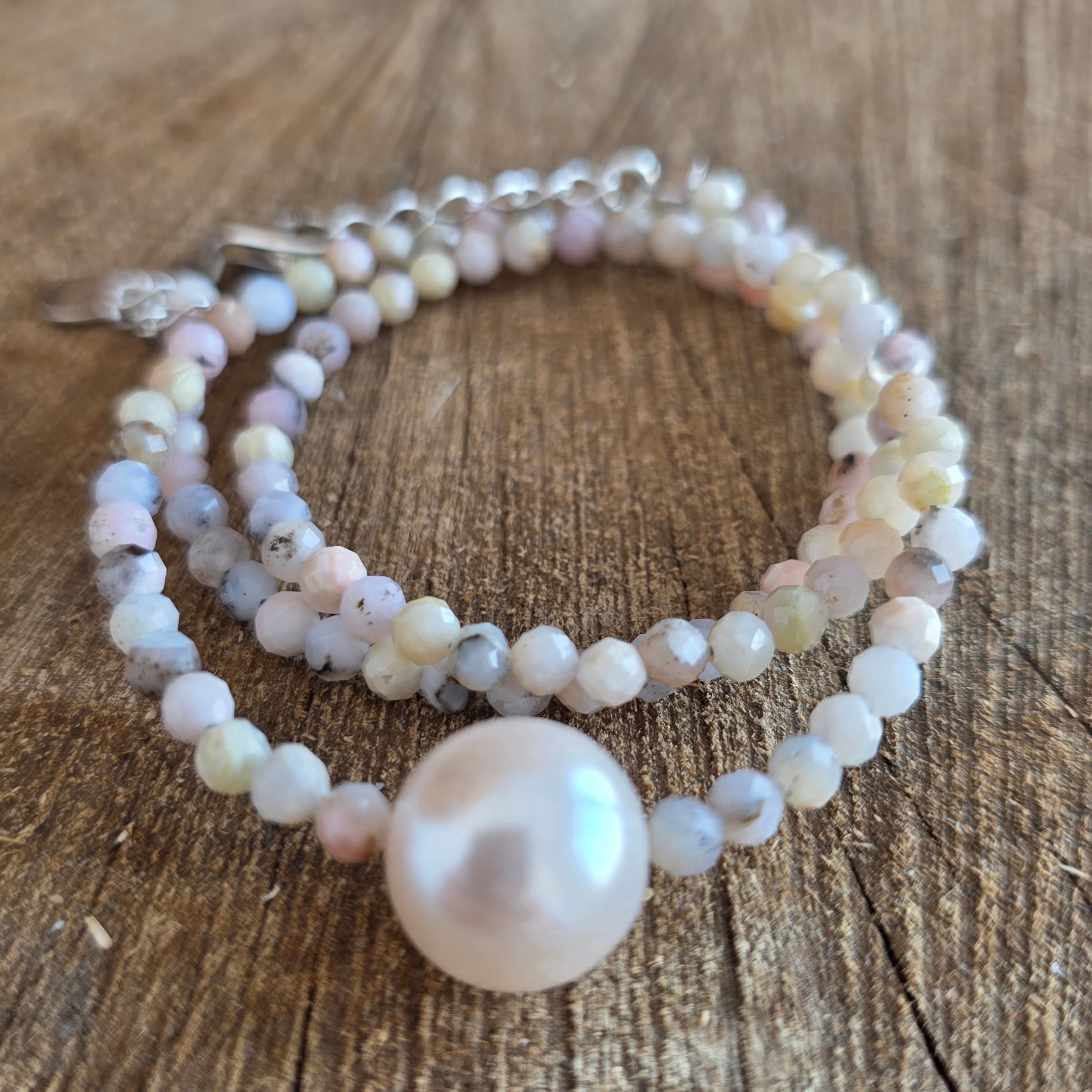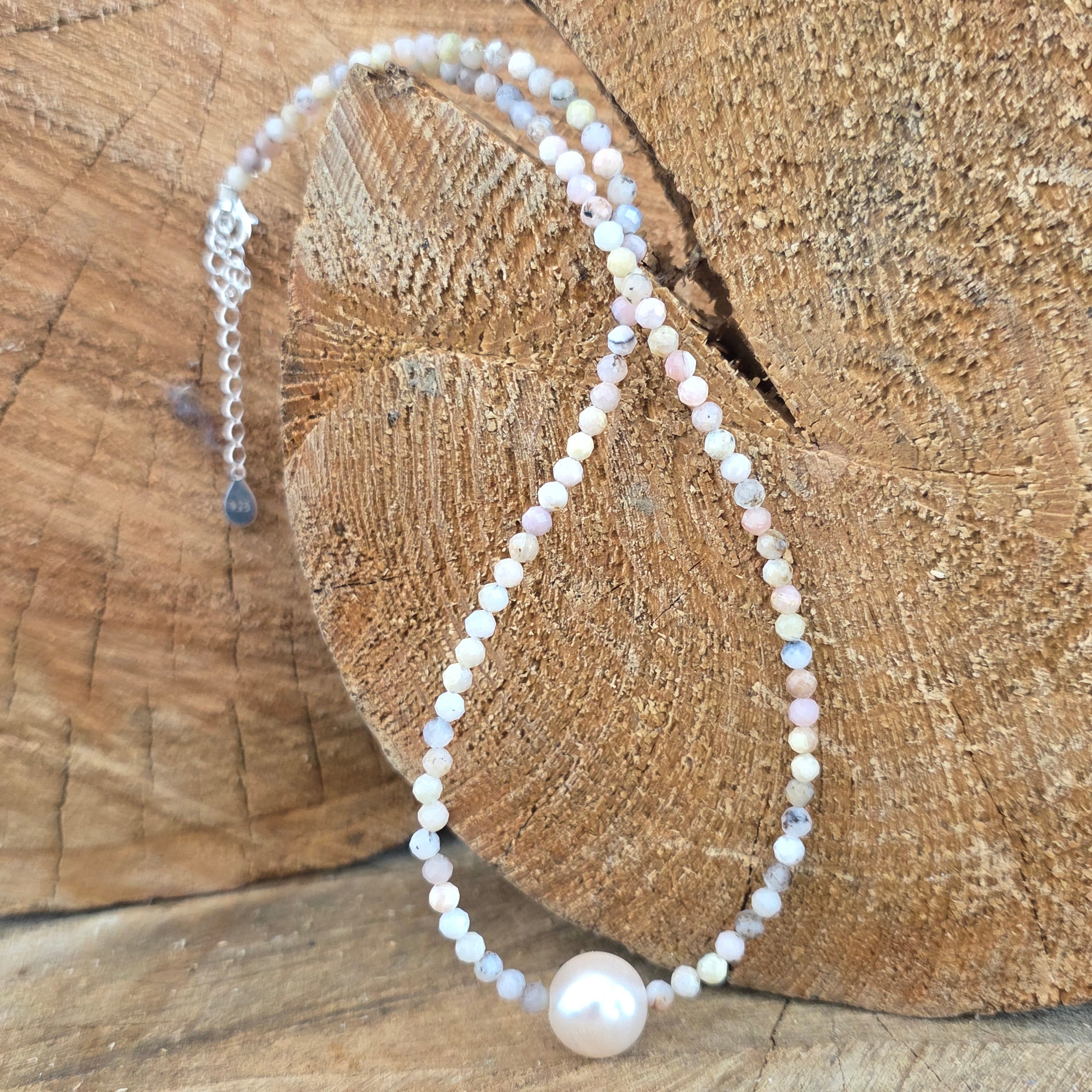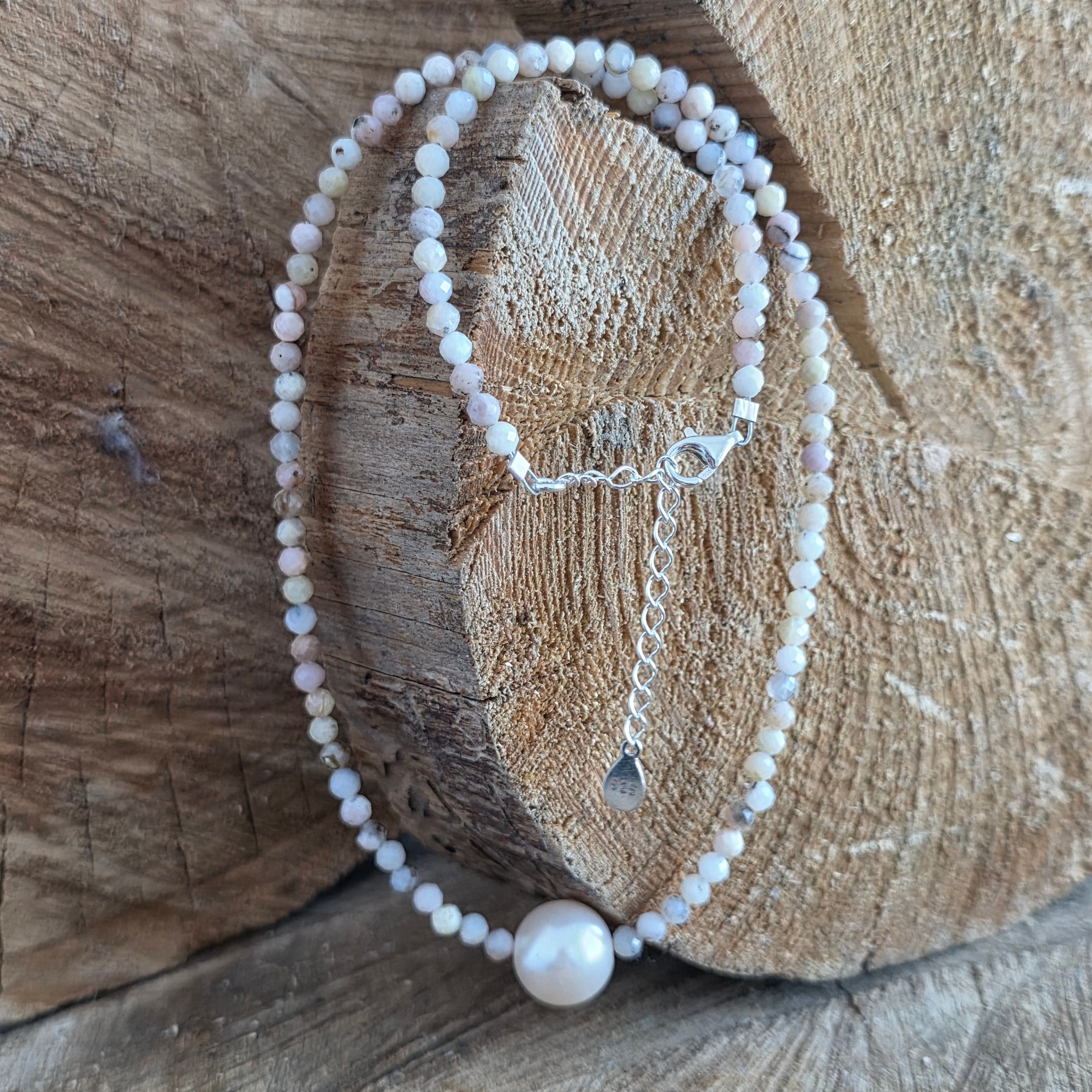 A delicate and luminous necklace, made from 3 mm faceted pink opal beads, forming a fine and harmonious line around the neck. The soft milky pink tones, with subtle reflections and a slightly translucent texture, give the jewelry a warm and refined air. The subtle faceting adds depth and a gentle sparkle, without overpowering, maintaining an elegant visual balance.