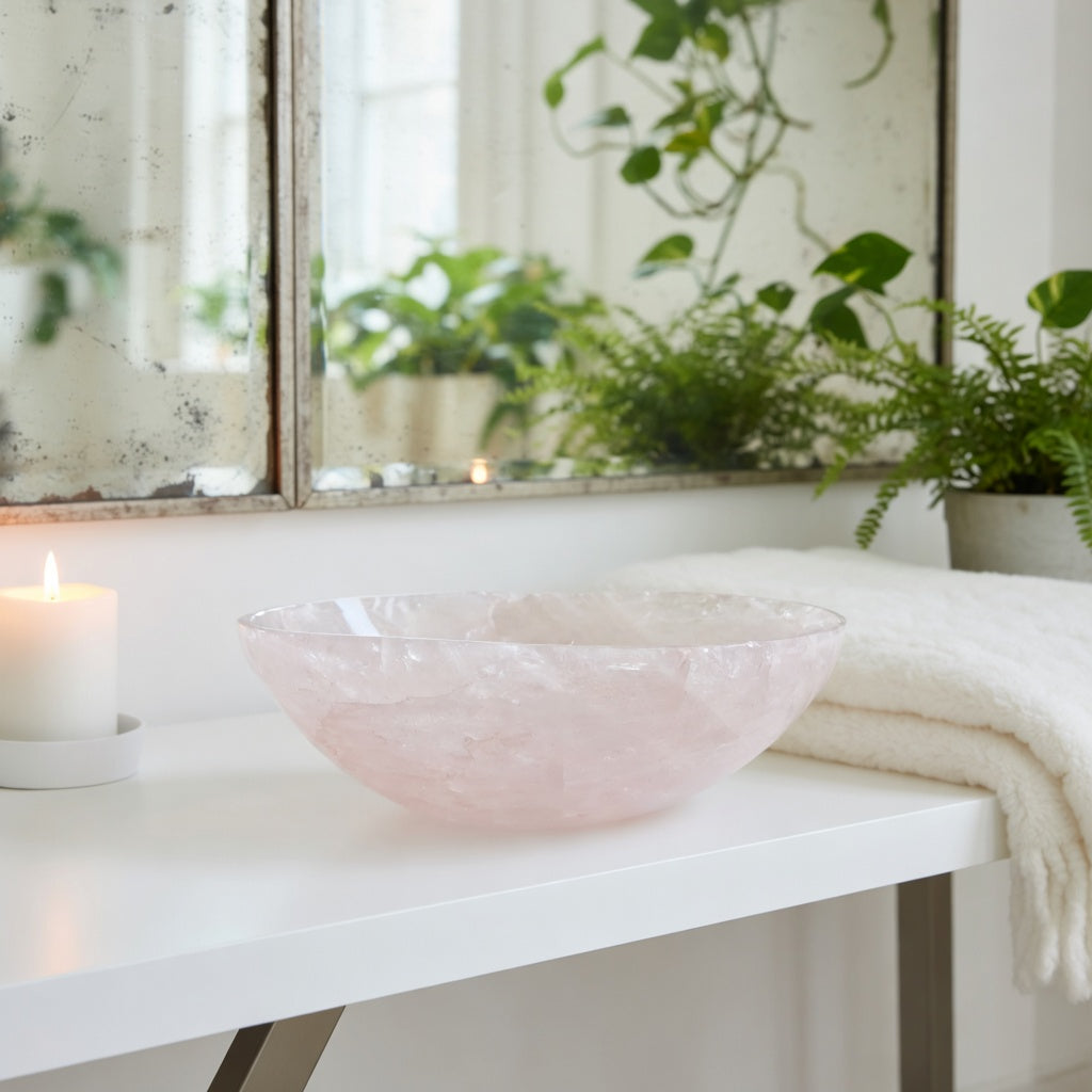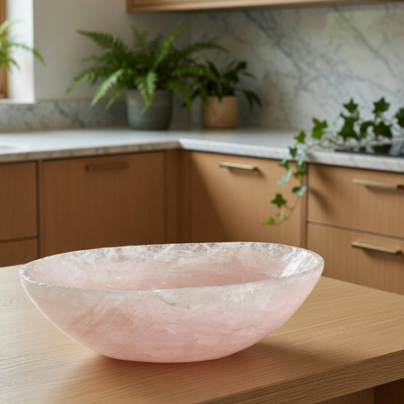 The rose quartz bowl is a decorative piece made from a variety of quartz with a well-defined crystalline structure, appreciated for its slightly milky transparency and natural shades of pink, generated by fine inclusions of titanium or manganese. This mineral is known for its massiveness, which allows it to be crafted into balanced sculptural forms and high-quality finishes.
