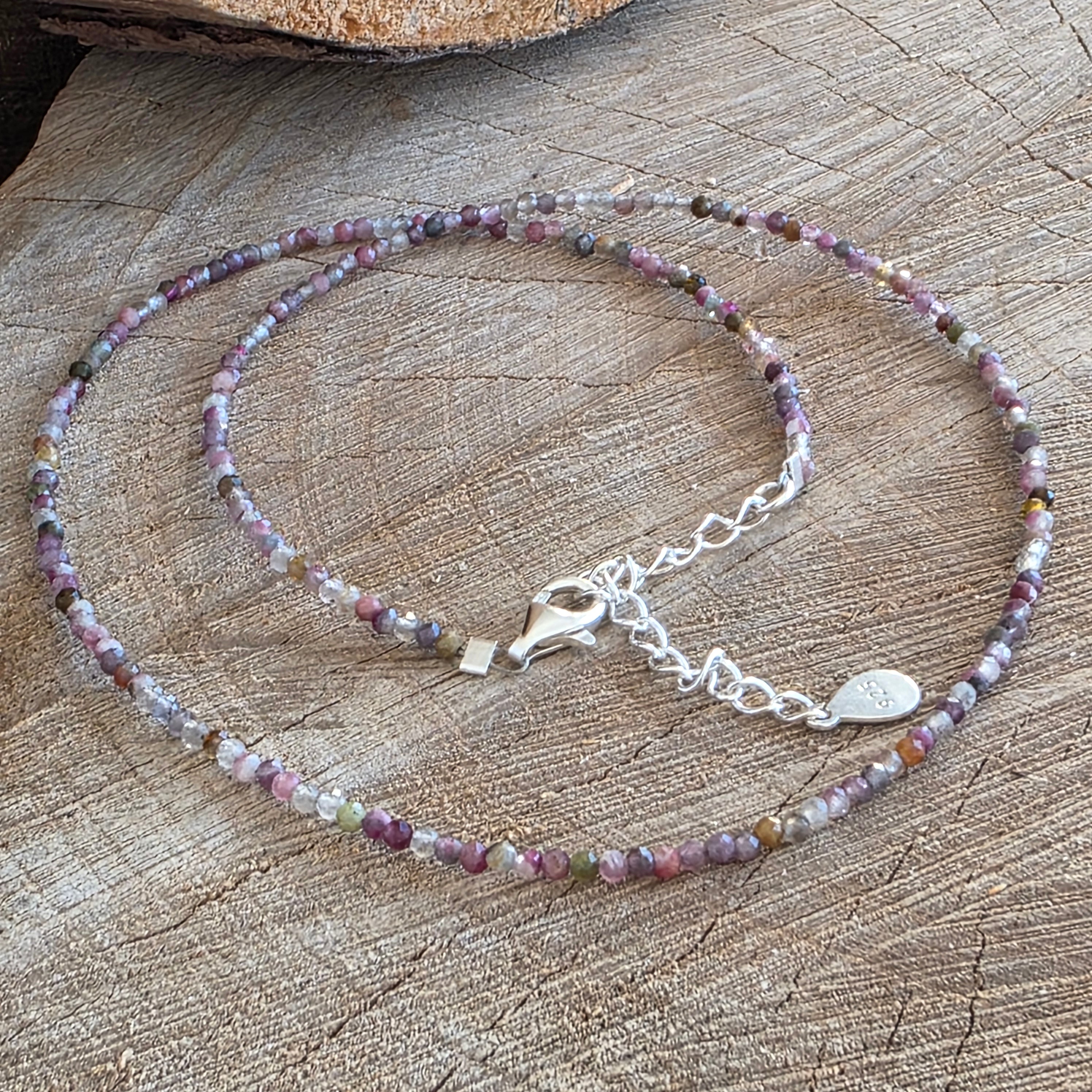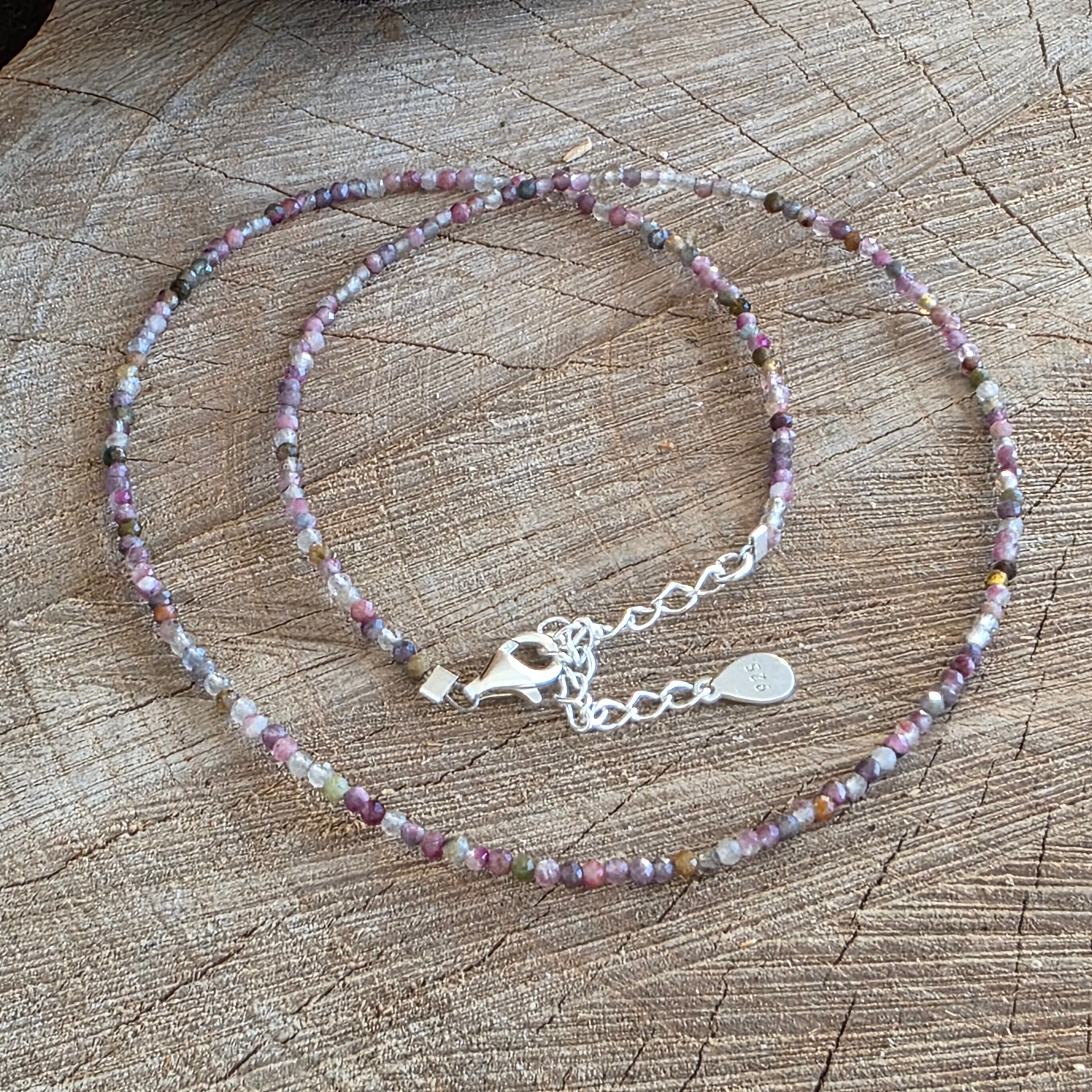 A delicate and expressive necklace made of 2 mm faceted pink tourmaline beads, forming a fine, elegant, and harmonious line around the neck. The natural shades of pink, from soft tones to deeper accents, create a subtle play of color, while the faceting adds gentle reflections without visually overwhelming the piece. It is an airy, feminine, and balanced design that highlights the authentic beauty of the stone.