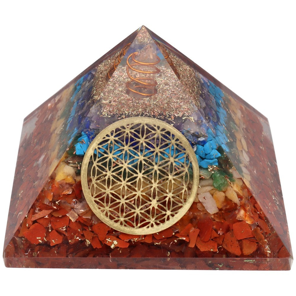 Piramida 7 chakre în rășină, cu simbolul sacru Flower of Life, reunește armonia celor șapte pietre semiprețioase asociate centrilor energetici ai corpului.