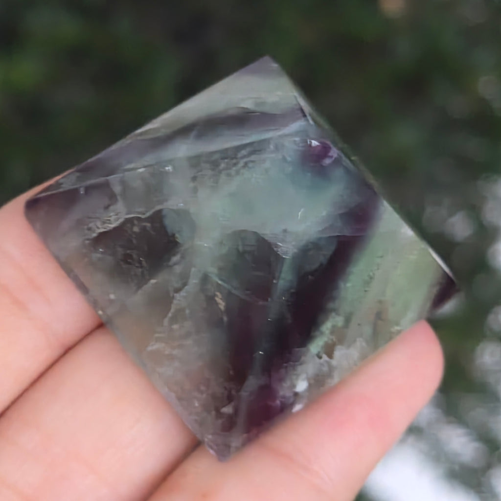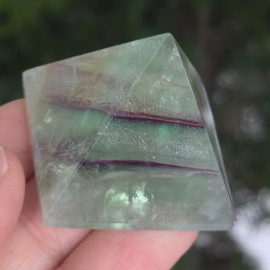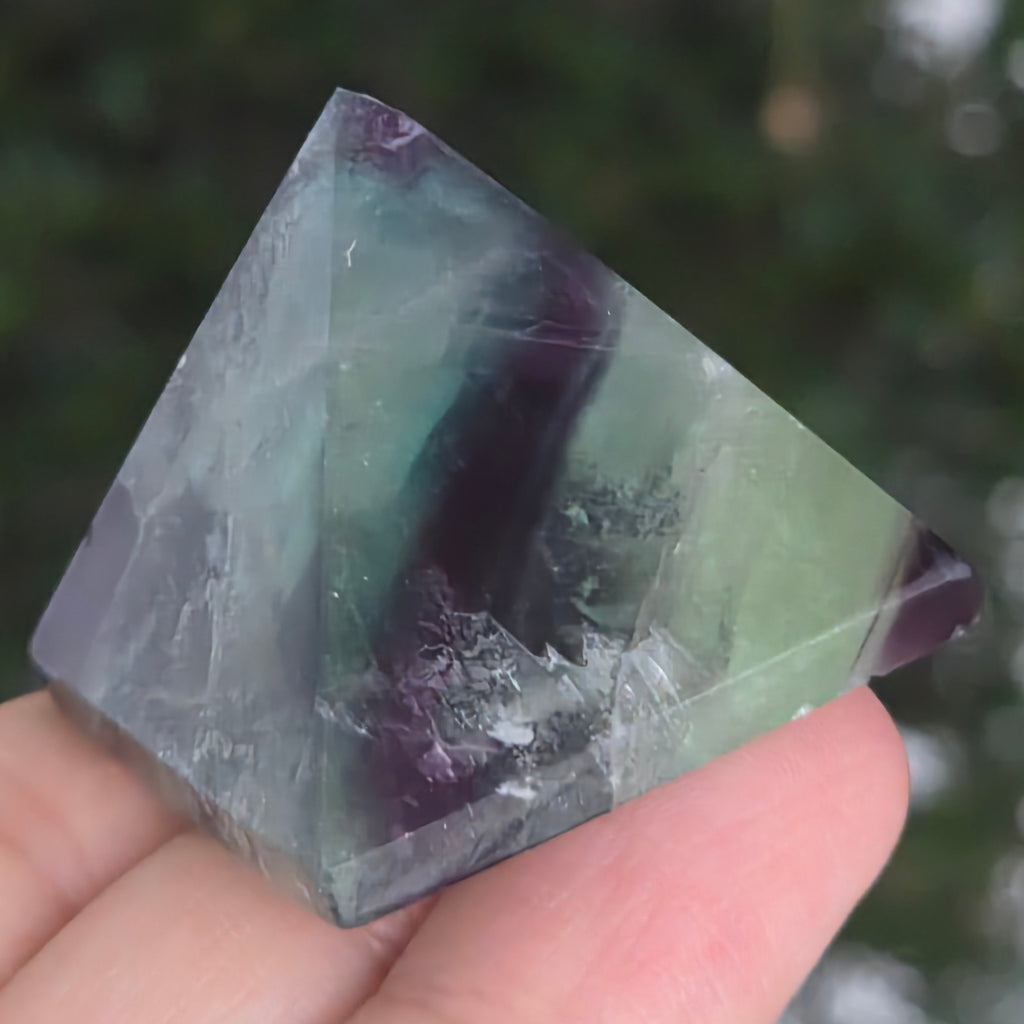 O piramidă ce pare să fi prins în ea lumina unui spectru viu de culori. Această piesă din fluorit curcubeu natural, dezvăluie straturi transparente de violet, verde, turcoaz și uneori nuanțe fine de albastru sau roz, dispuse ca valurile unei lumi cristaline. Suprafața perfect șlefuită emană un luciu fin, hipnotic, care aduce echilibru și inspirație în spațiul în care este așezată.