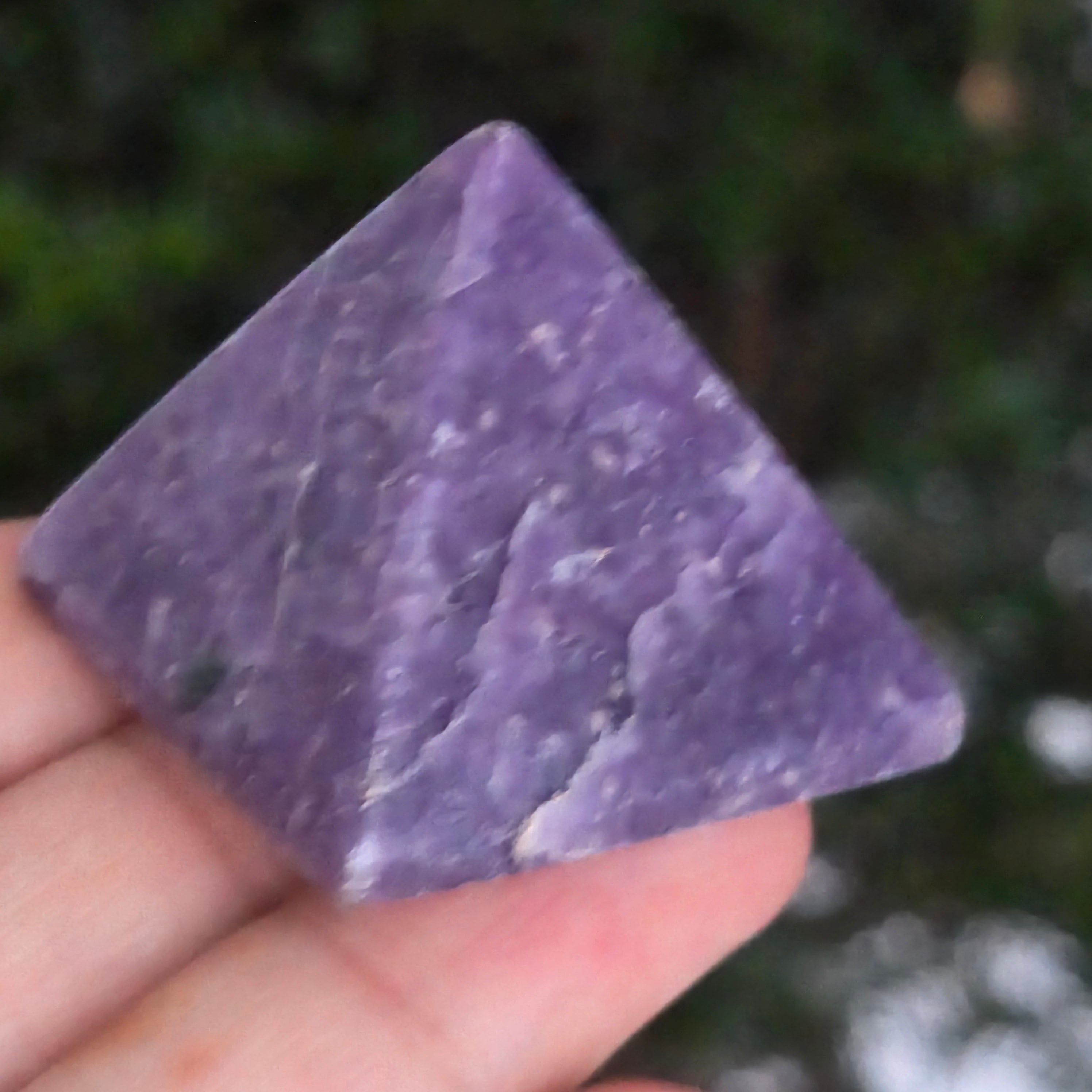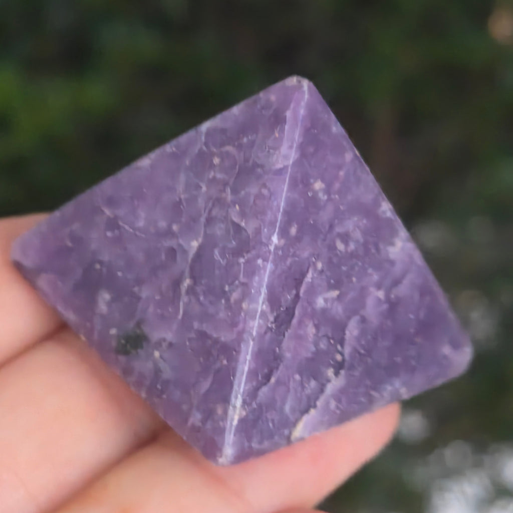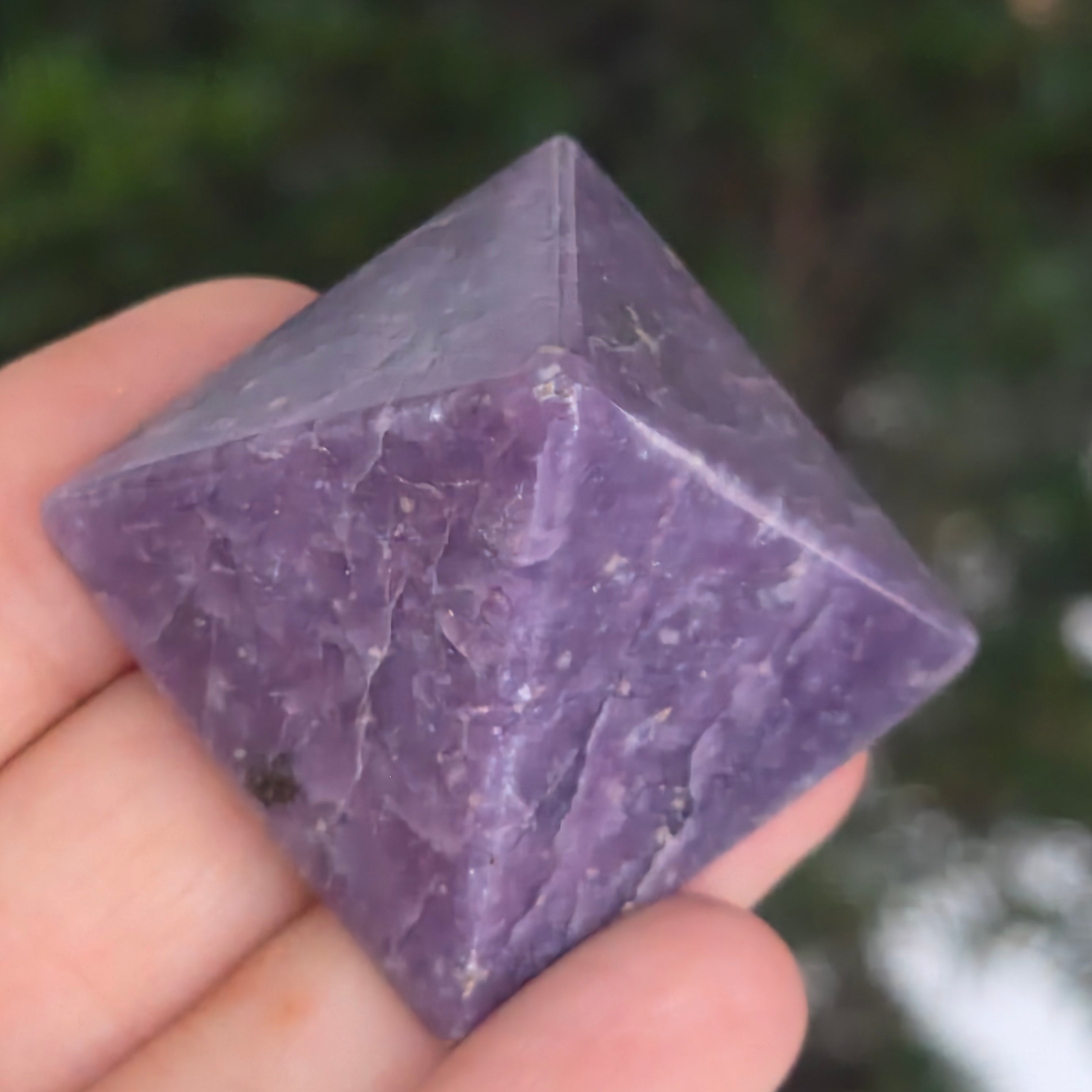 O piramidă ce pare modelată din lumina amurgului. Această piesă din lepidolit natural, strălucește în tonuri de violet pudrat, lavandă și gri sidefat, cu reflexe subtile de argint ce dansează pe suprafața perfect șlefuită. Textura sa mătăsoasă emană calm și delicatețe, invitând la relaxare și la introspecție.