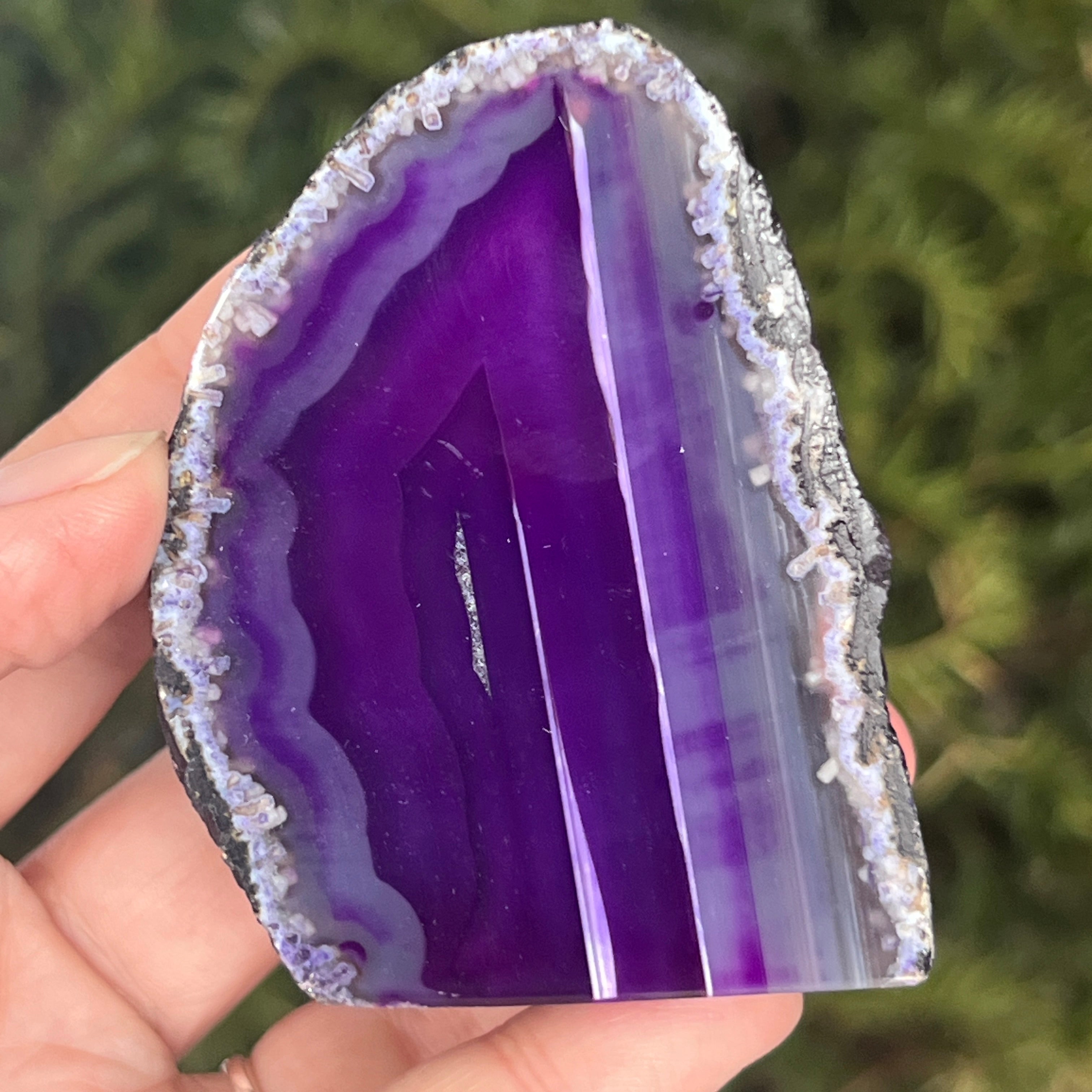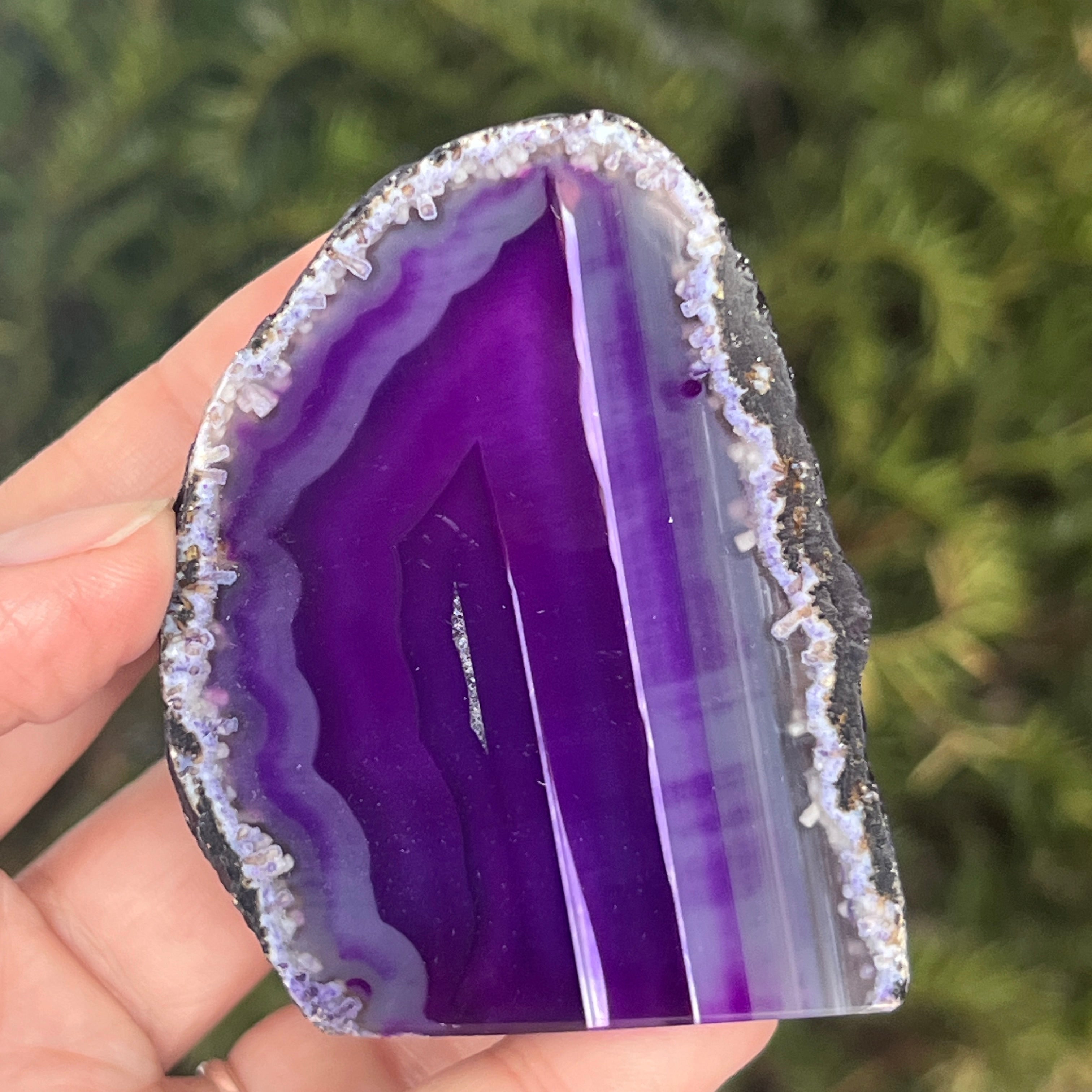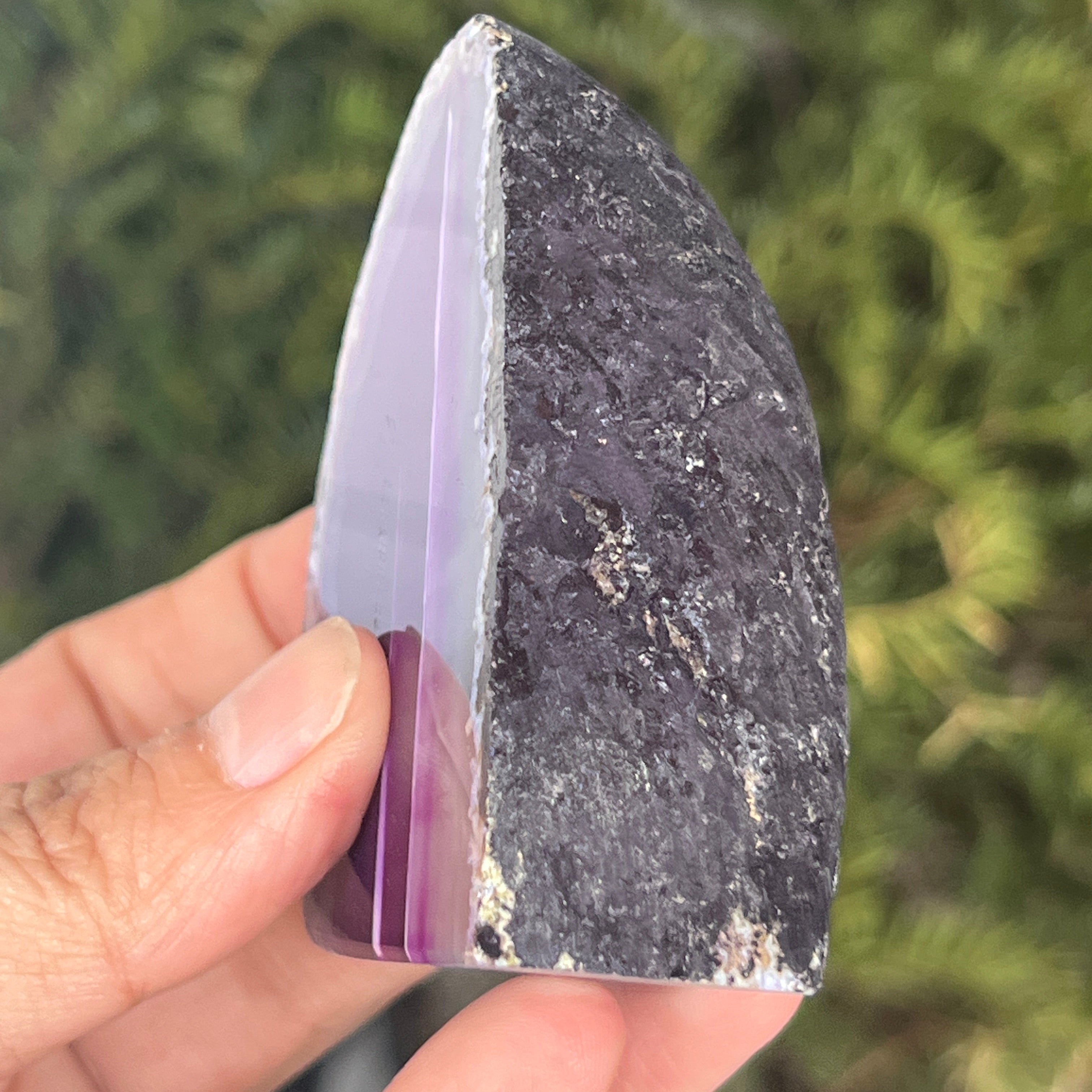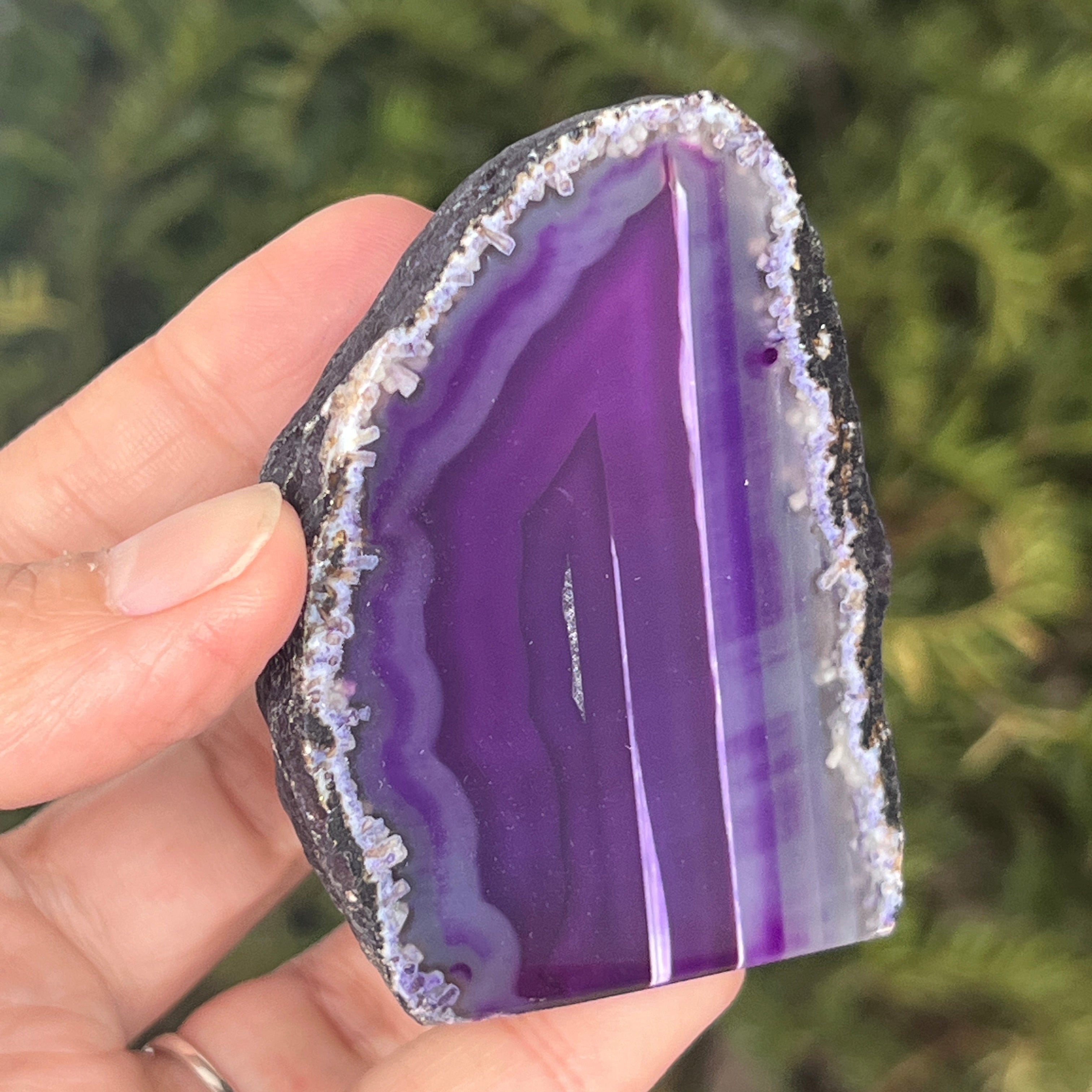 Purple agate is a variety of chalcedony, a microcrystalline form of quartz characterized by its layered structure formed in cavities of volcanic rocks. The purple color highlights the mineral's delicate bands and creates spectacular contrasts. It is valued both for its unique aesthetics and for the symbolism associated with calm, intuition, and mental clarity.