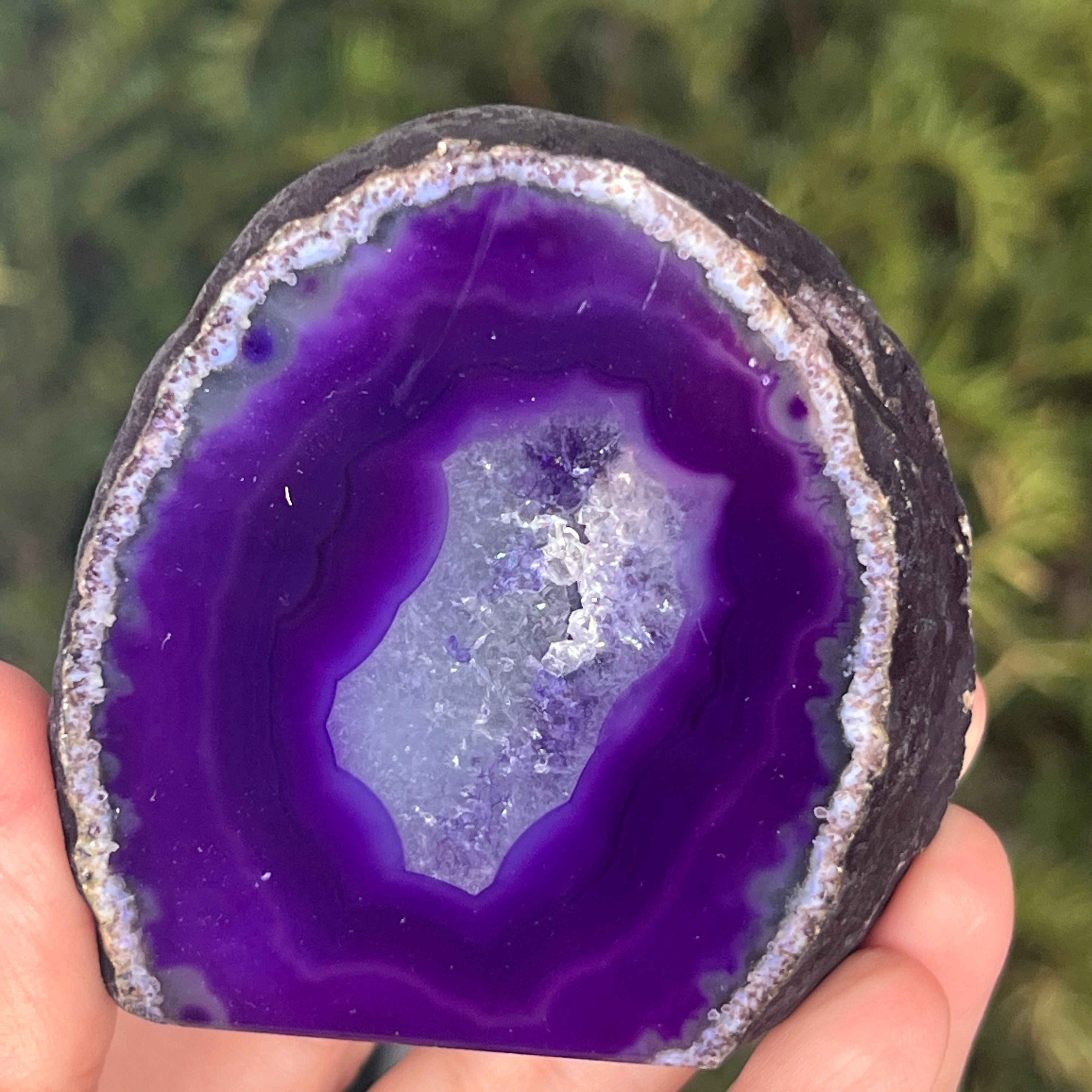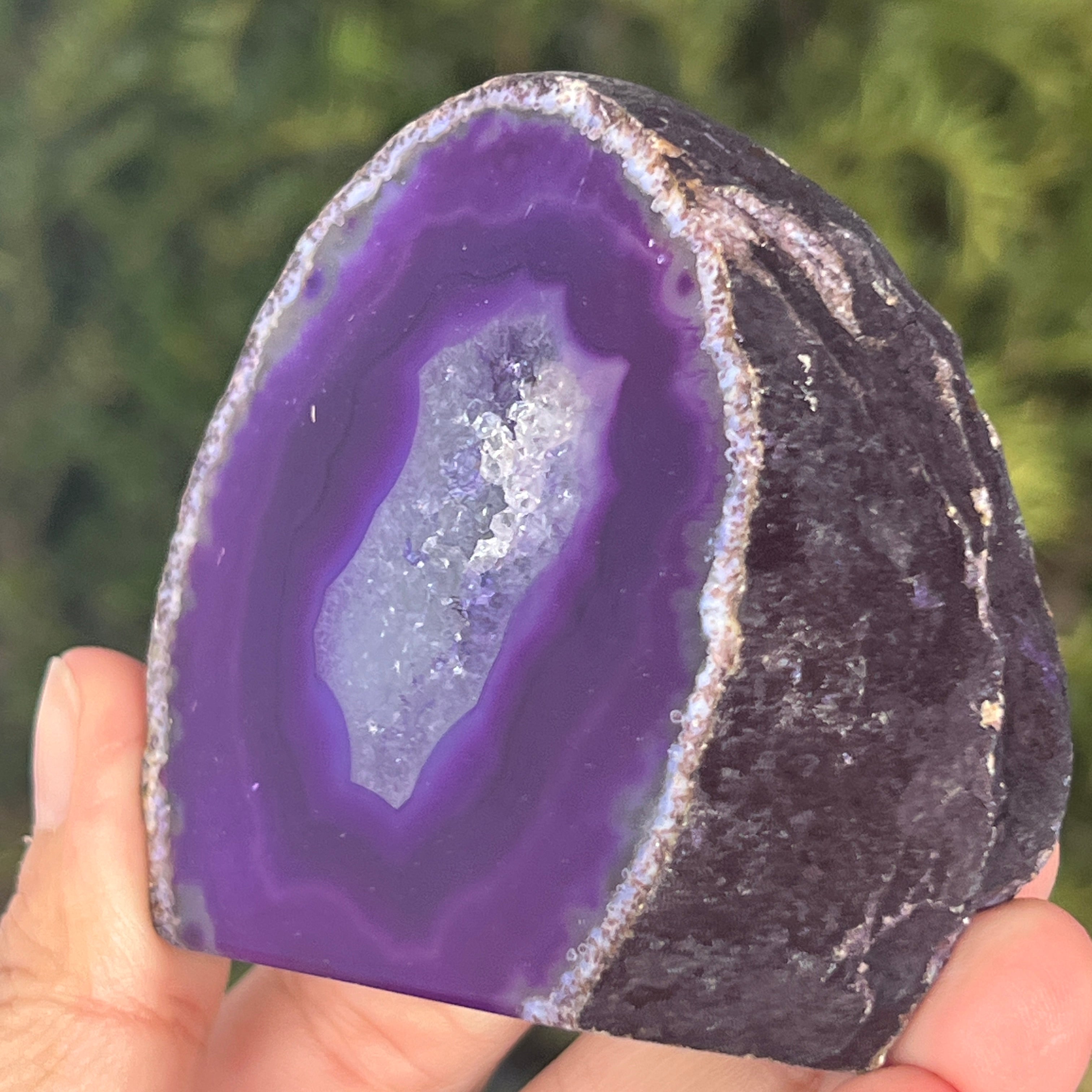 Purple agate is a variety of chalcedony, a microcrystalline form of quartz characterized by its layered structure formed in cavities of volcanic rocks. The violet color highlights the delicate bands of the mineral and creates spectacular contrasts. It is appreciated both for its unique aesthetics and for the symbolism related to calm, intuition, and mental clarity.