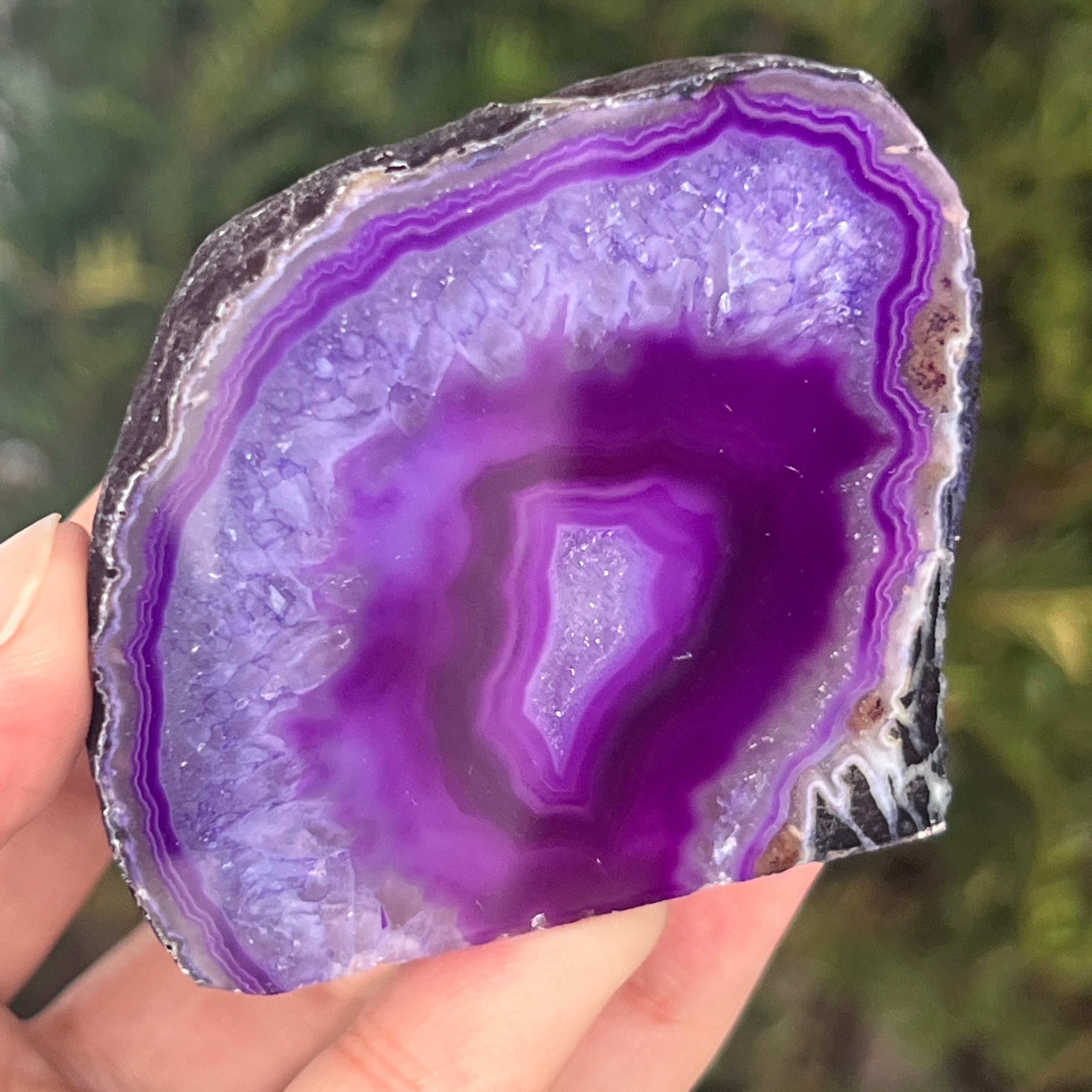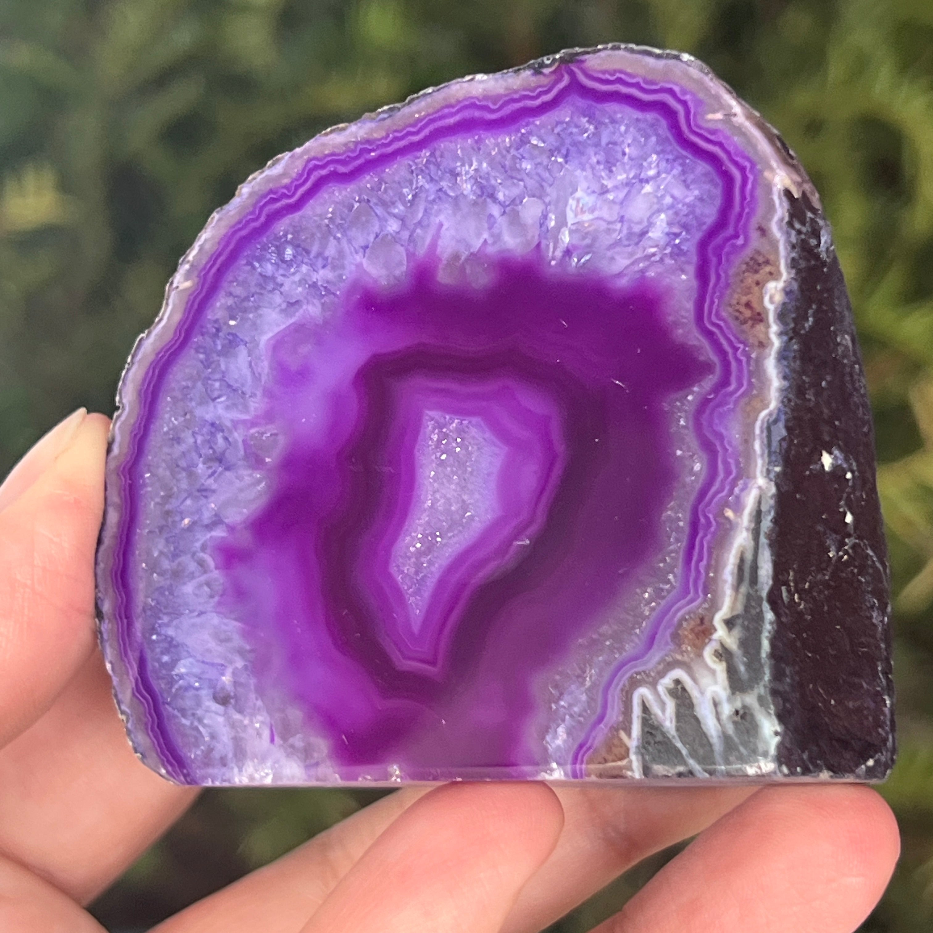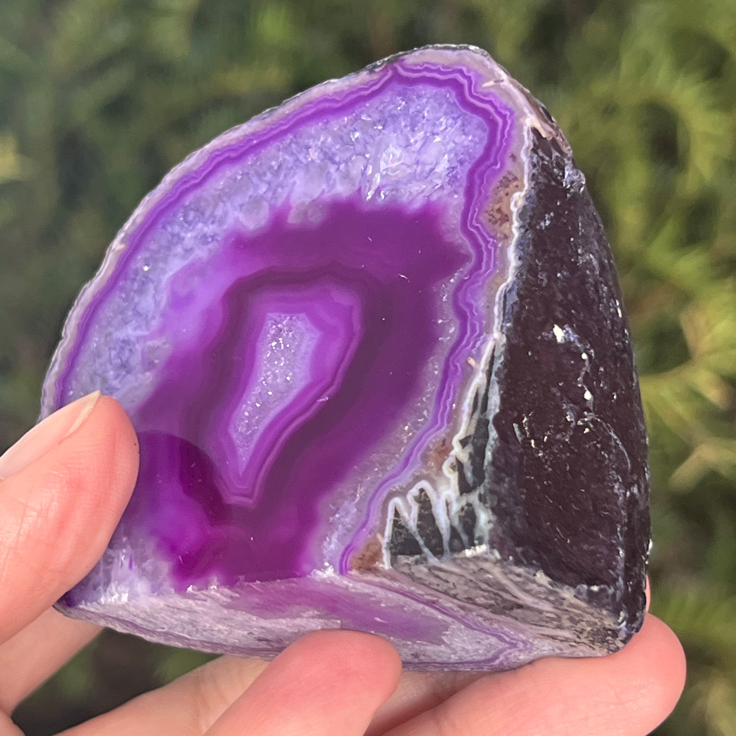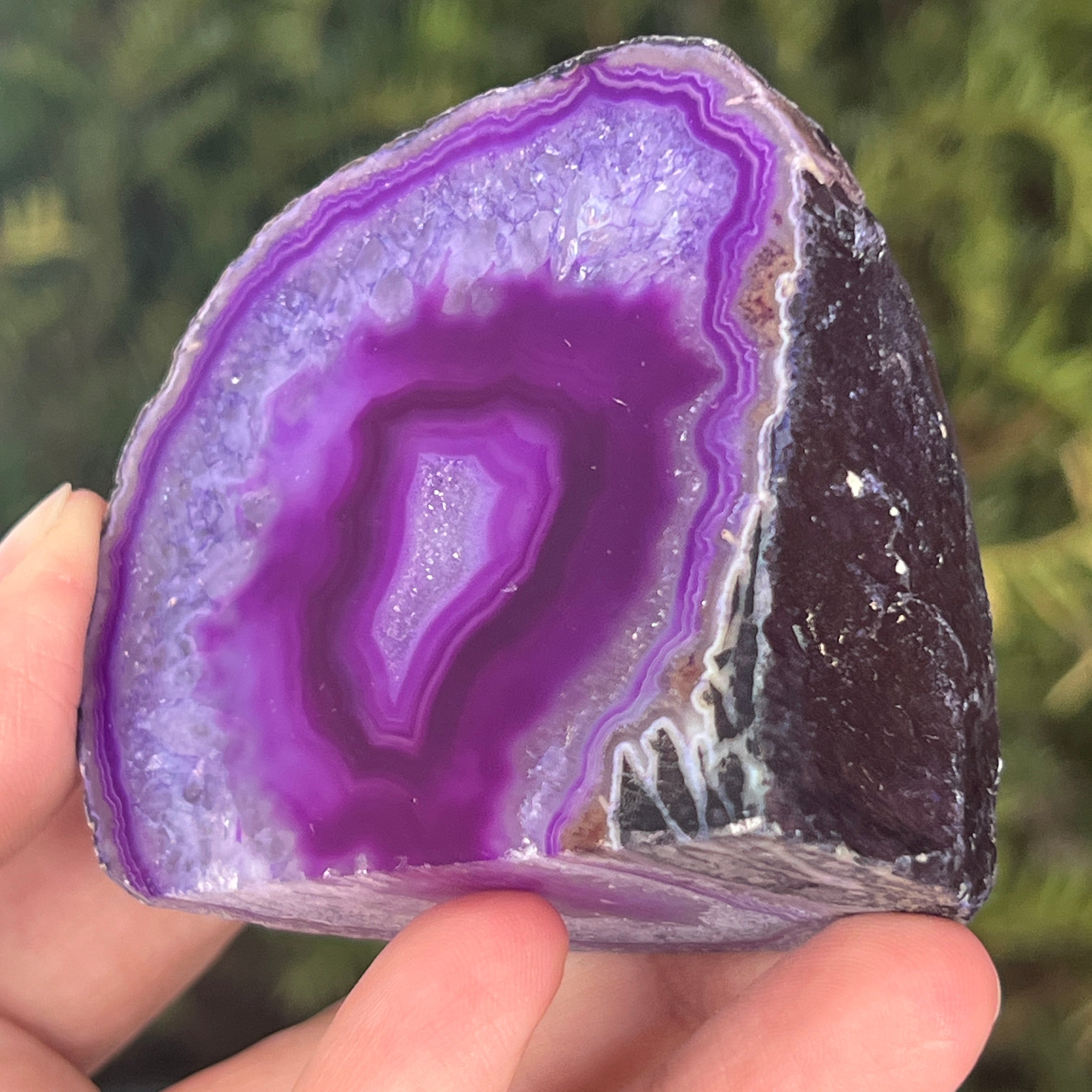 Purple agate is a variety of chalcedony, a microcrystalline form of quartz characterized by its layered structure formed in cavities of volcanic rocks. The purple color highlights the delicate bands of the mineral and creates spectacular contrasts. It is appreciated both for its unique aesthetics and for the symbolism related to calm, intuition, and mental clarity.