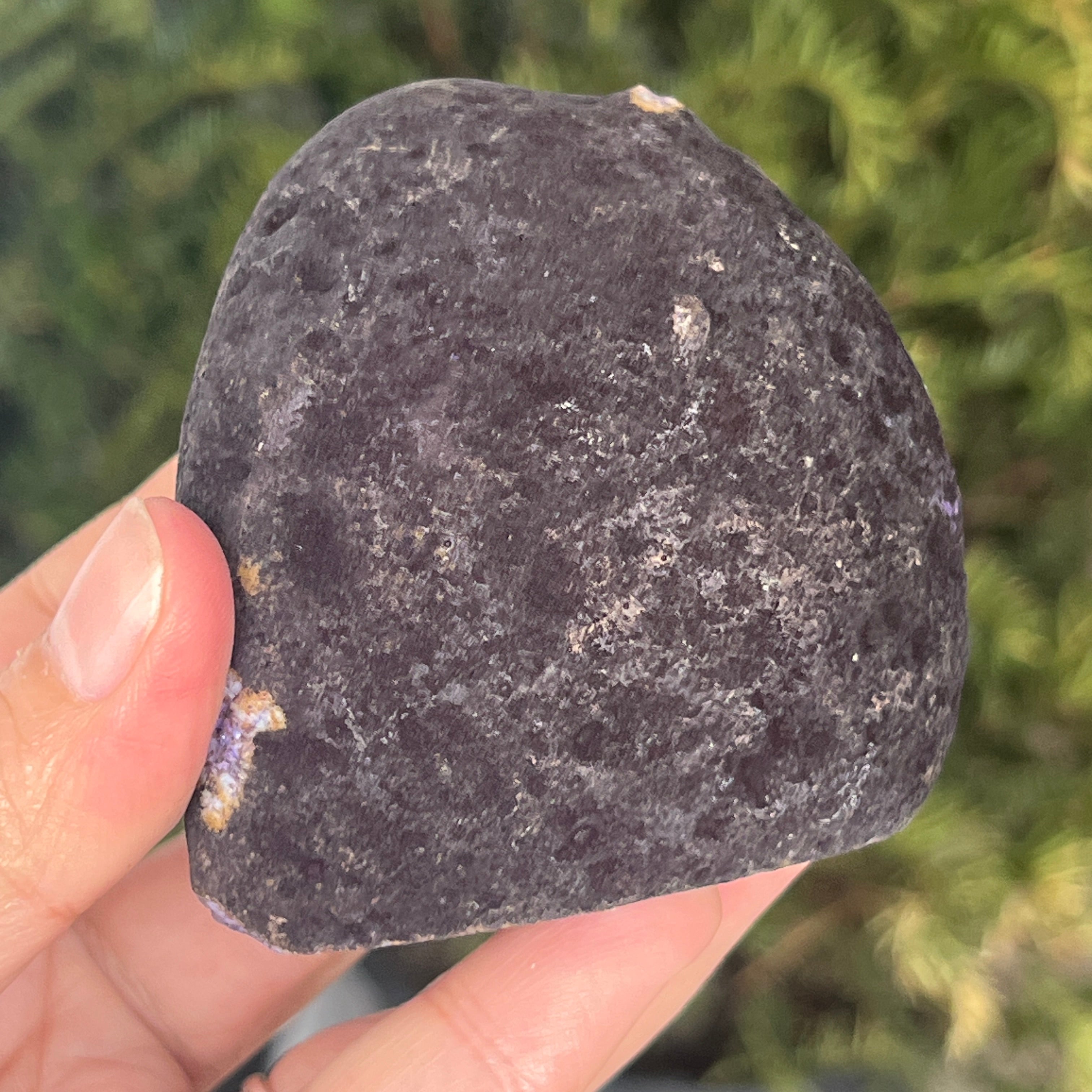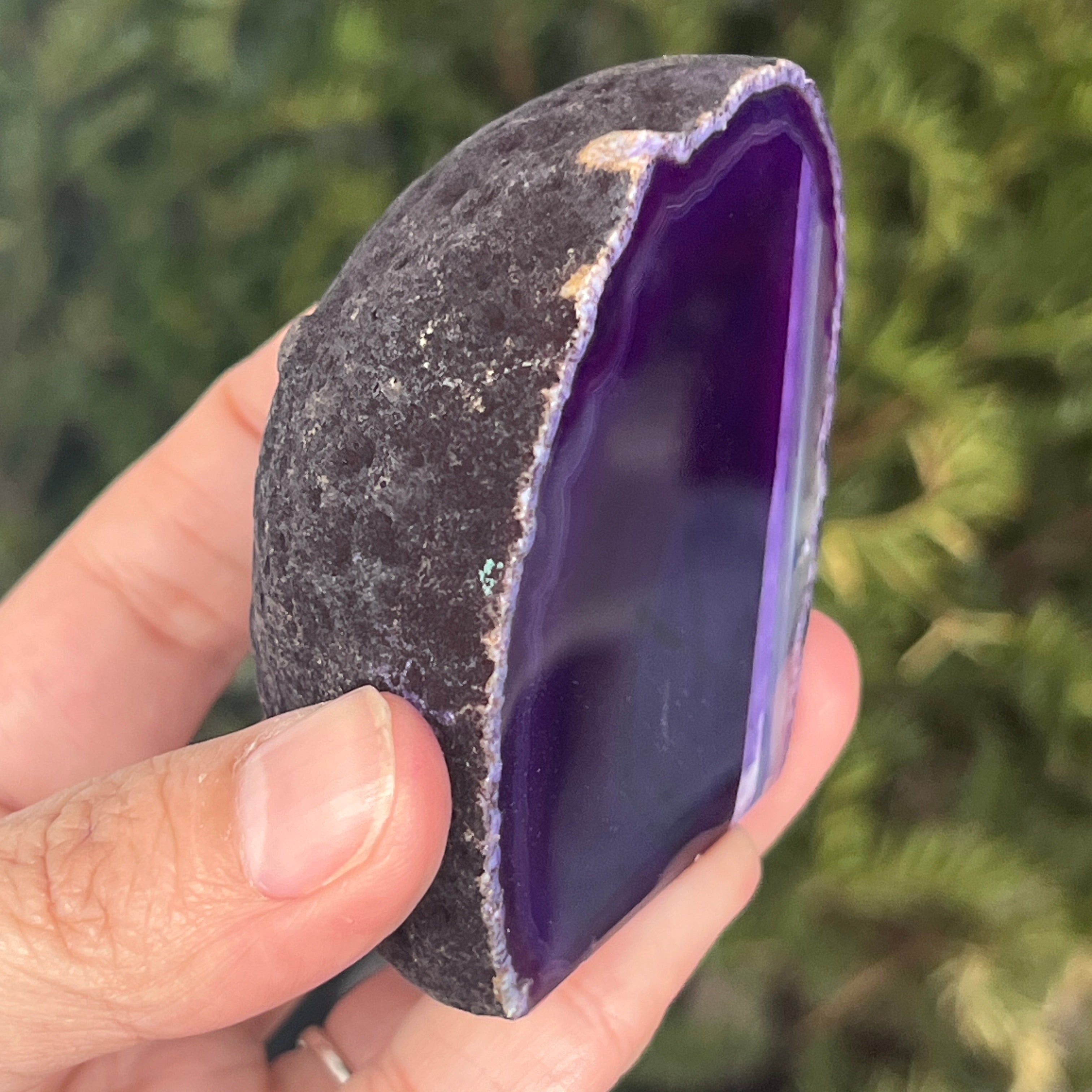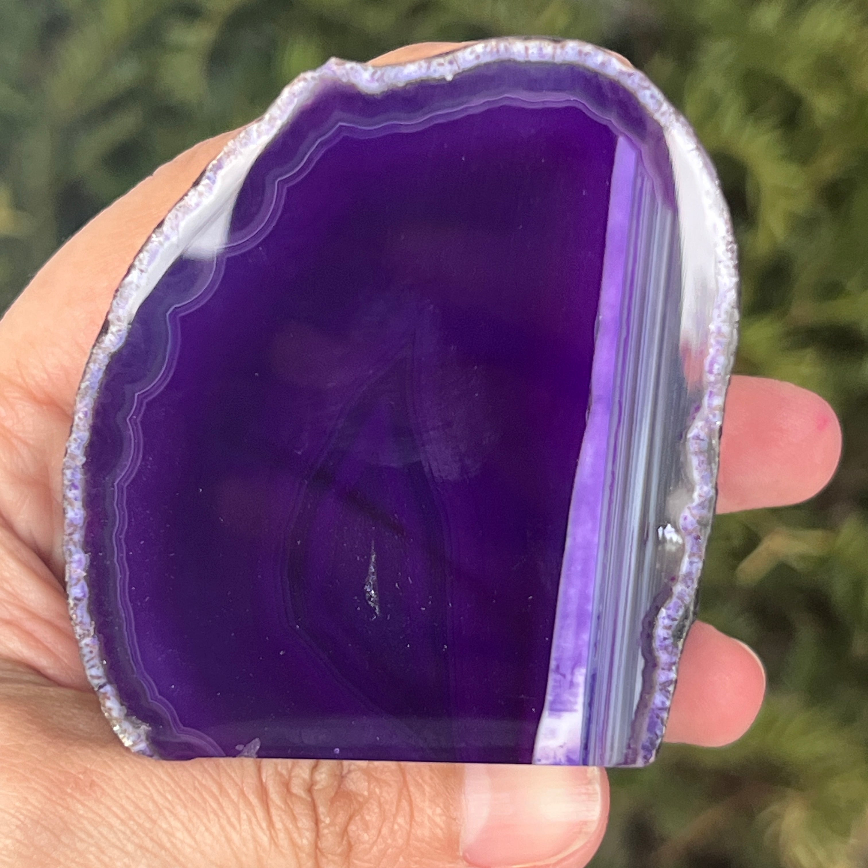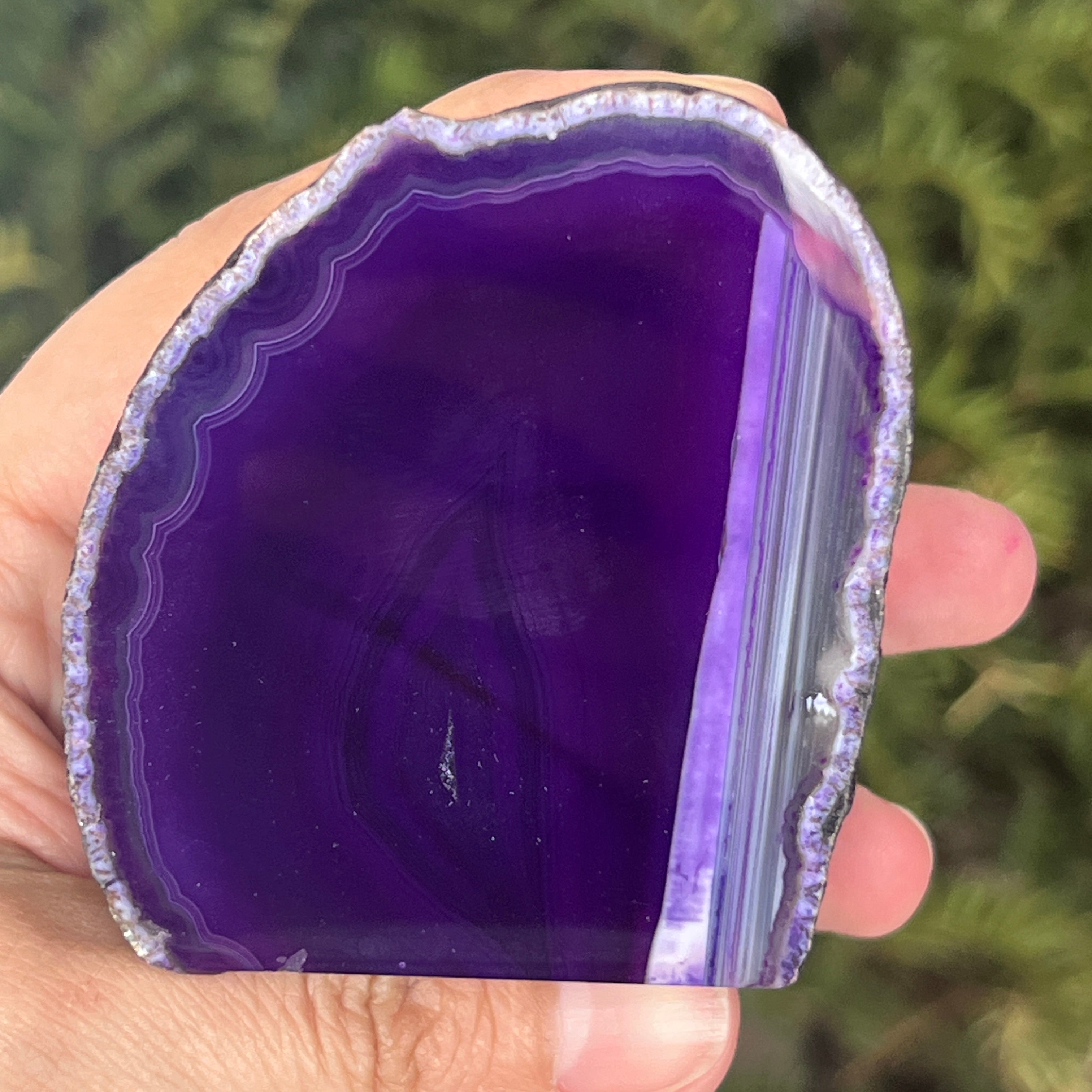 Purple agate is a variety of chalcedony, a microcrystalline form of quartz characterized by its layered structure formed in cavities of volcanic rocks. The purple color highlights the mineral's delicate bands and creates spectacular contrasts. It is valued both for its unique aesthetics and for the symbolism associated with calm, intuition, and mental clarity.