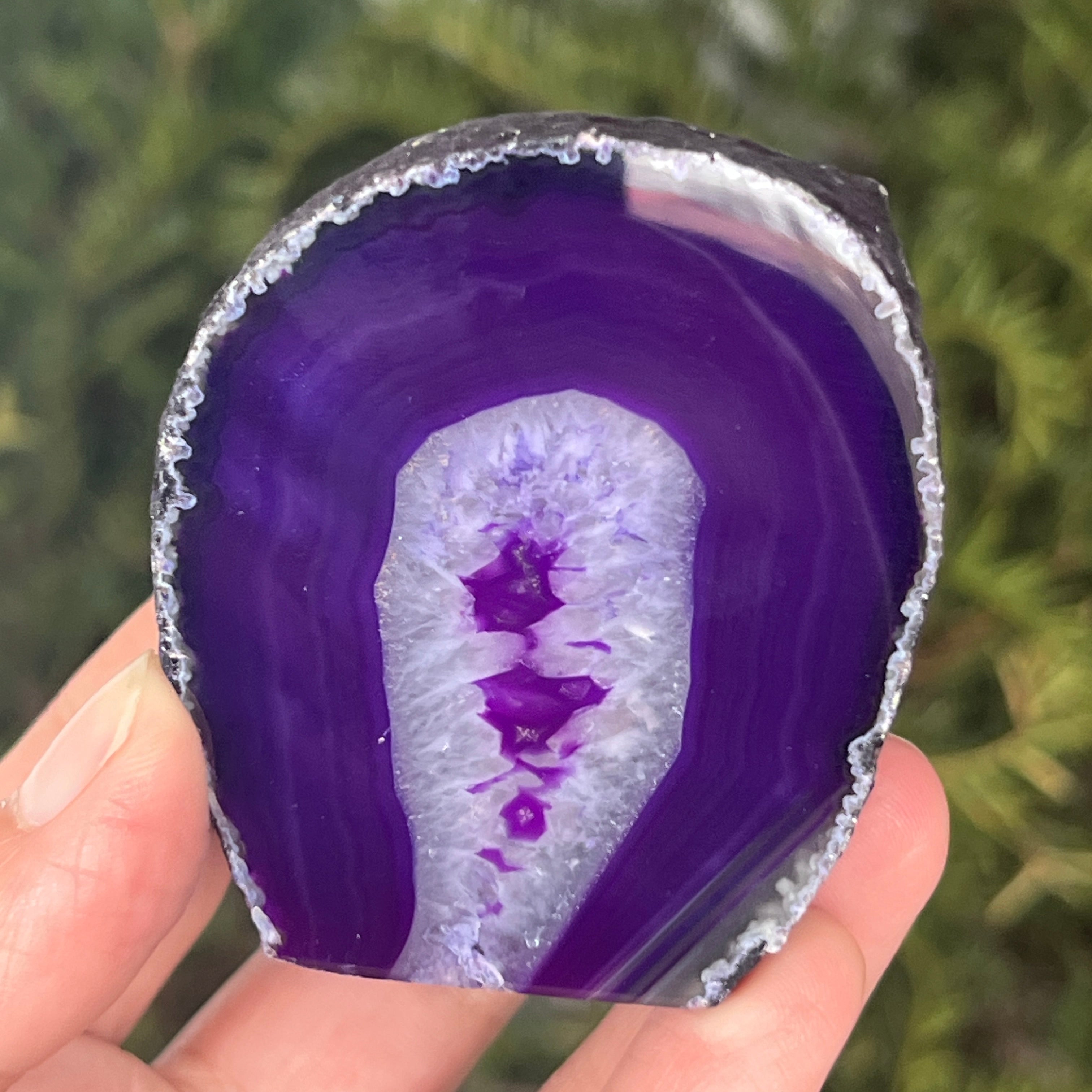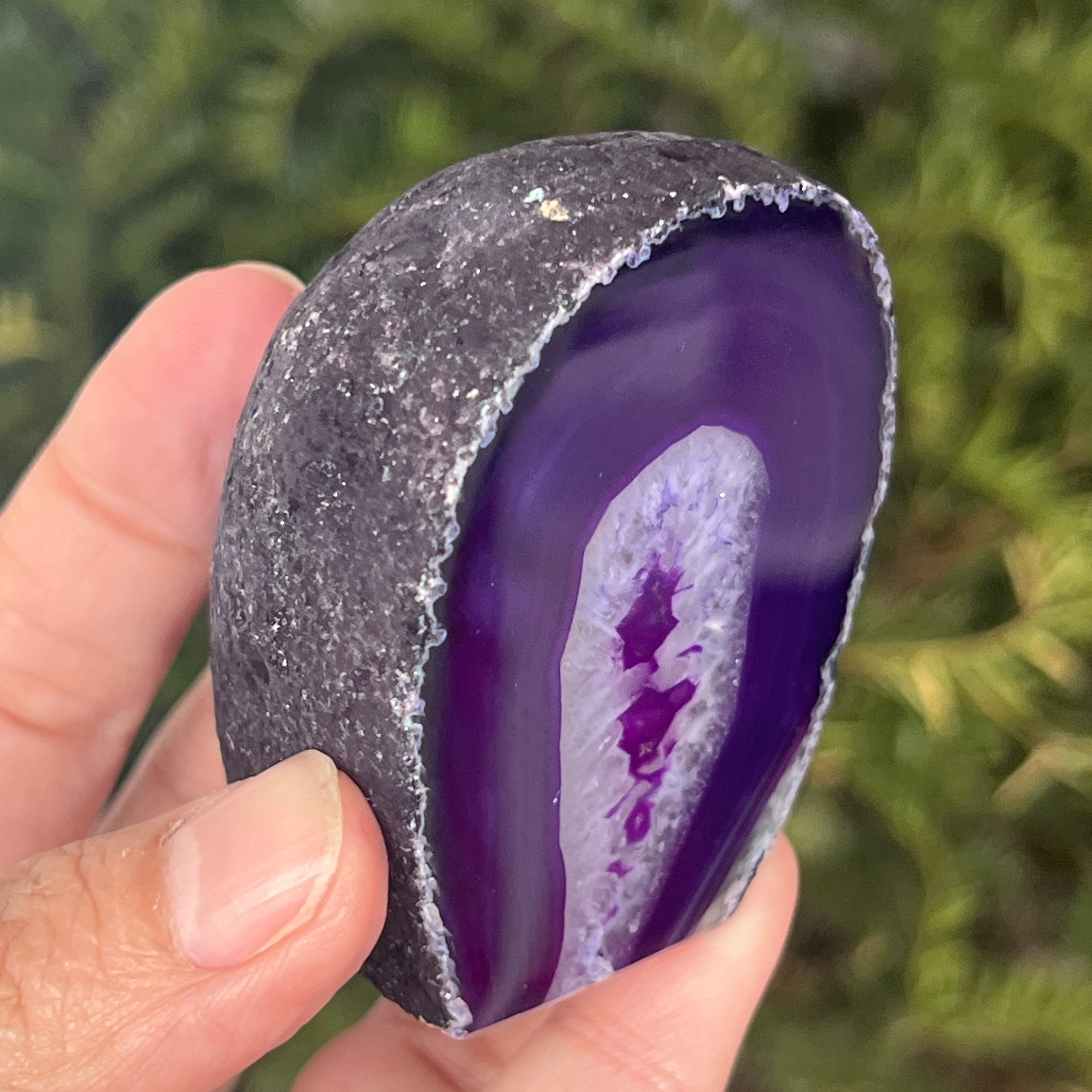 Purple agate is a variety of chalcedony, a microcrystalline form of quartz characterized by its layered structure formed in cavities of volcanic rocks. The purple color highlights the delicate bands of the mineral and creates spectacular contrasts. It is valued both for its unique aesthetics and for the symbolism related to calm, intuition, and mental clarity.