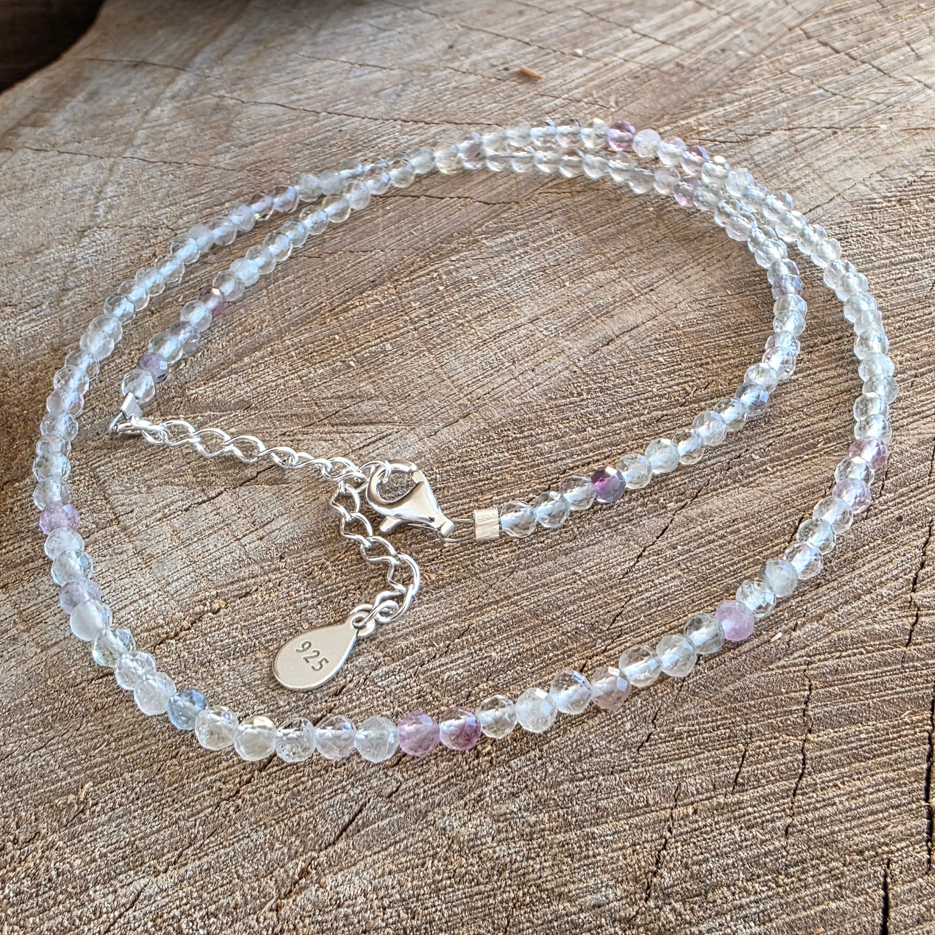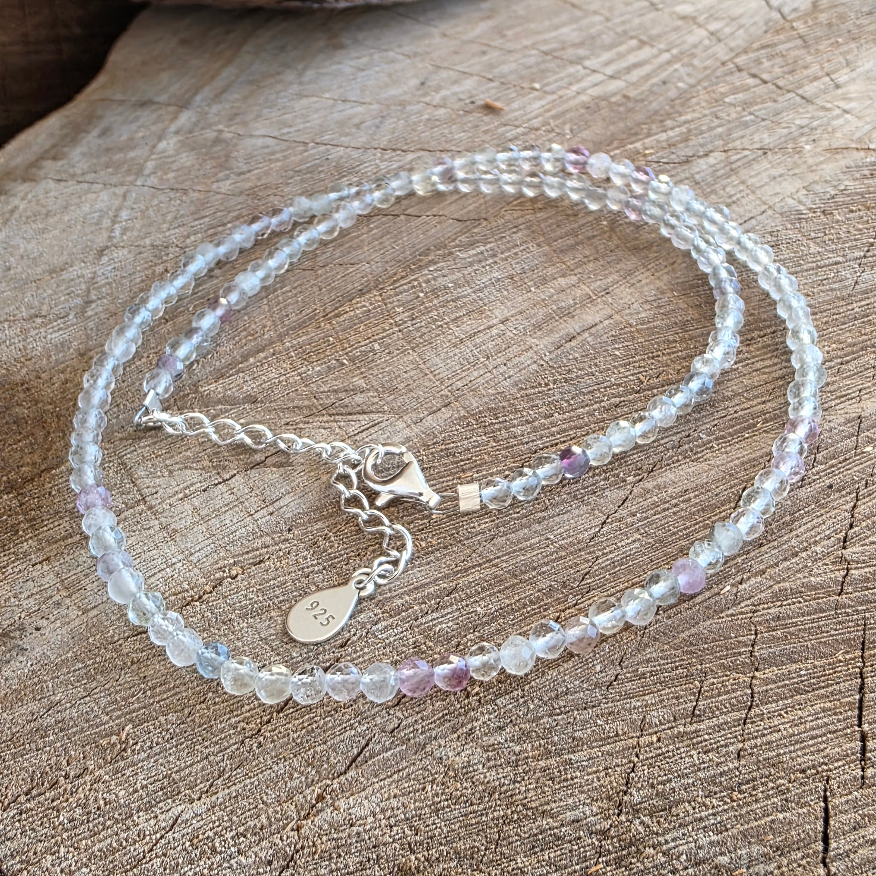 A necklace like a window open to light – lively, clear, playful, and deep at the same time. The 3 mm faceted rainbow fluorite beads shimmer in shades that dance between violet, green, blue, and pink, like a bridge between emotion and reason, between dream and clarity.