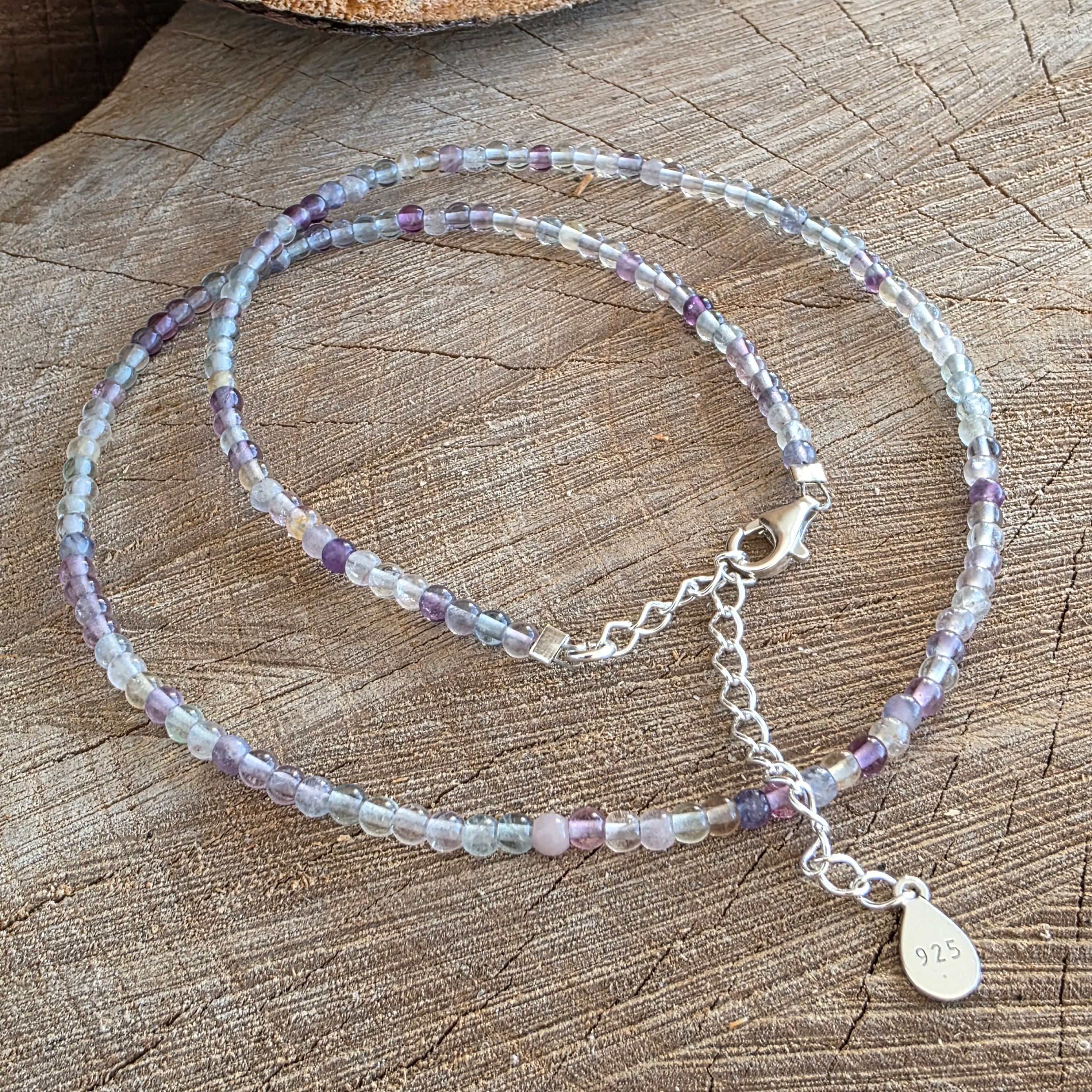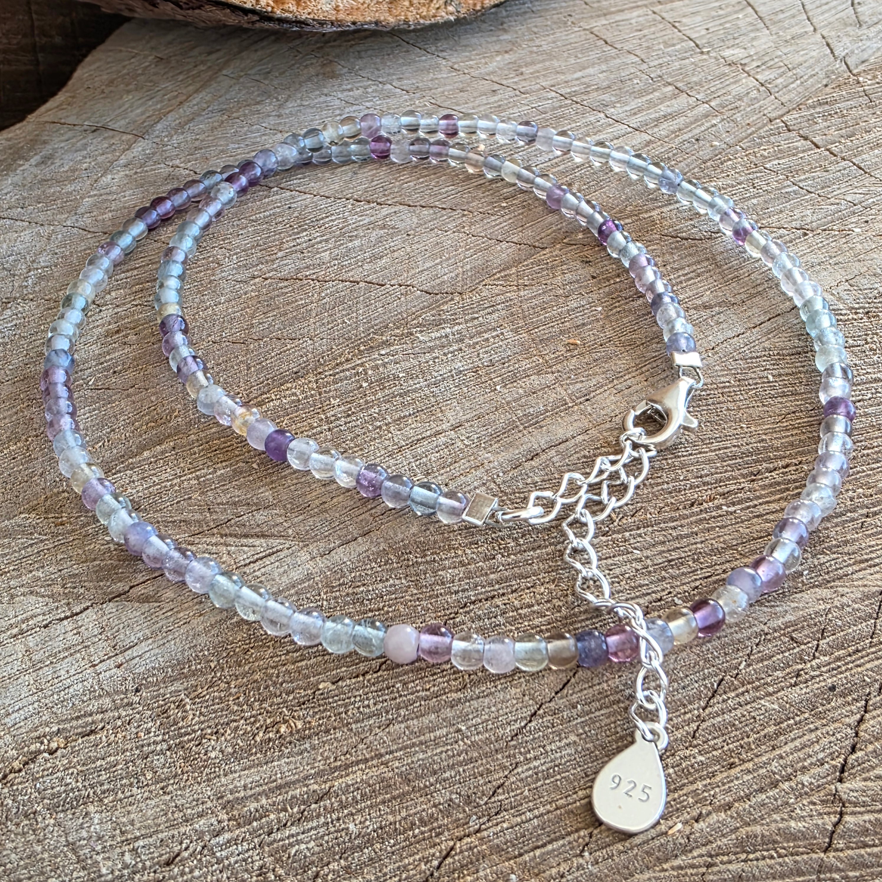 A necklace like a window open to the light – lively, clear, playful, and profound at the same time. The 3 mm faceted rainbow fluorite beads shine in shades that dance between violet, green, blue, and pink, like a bridge between emotion and reason, between dream and clarity.