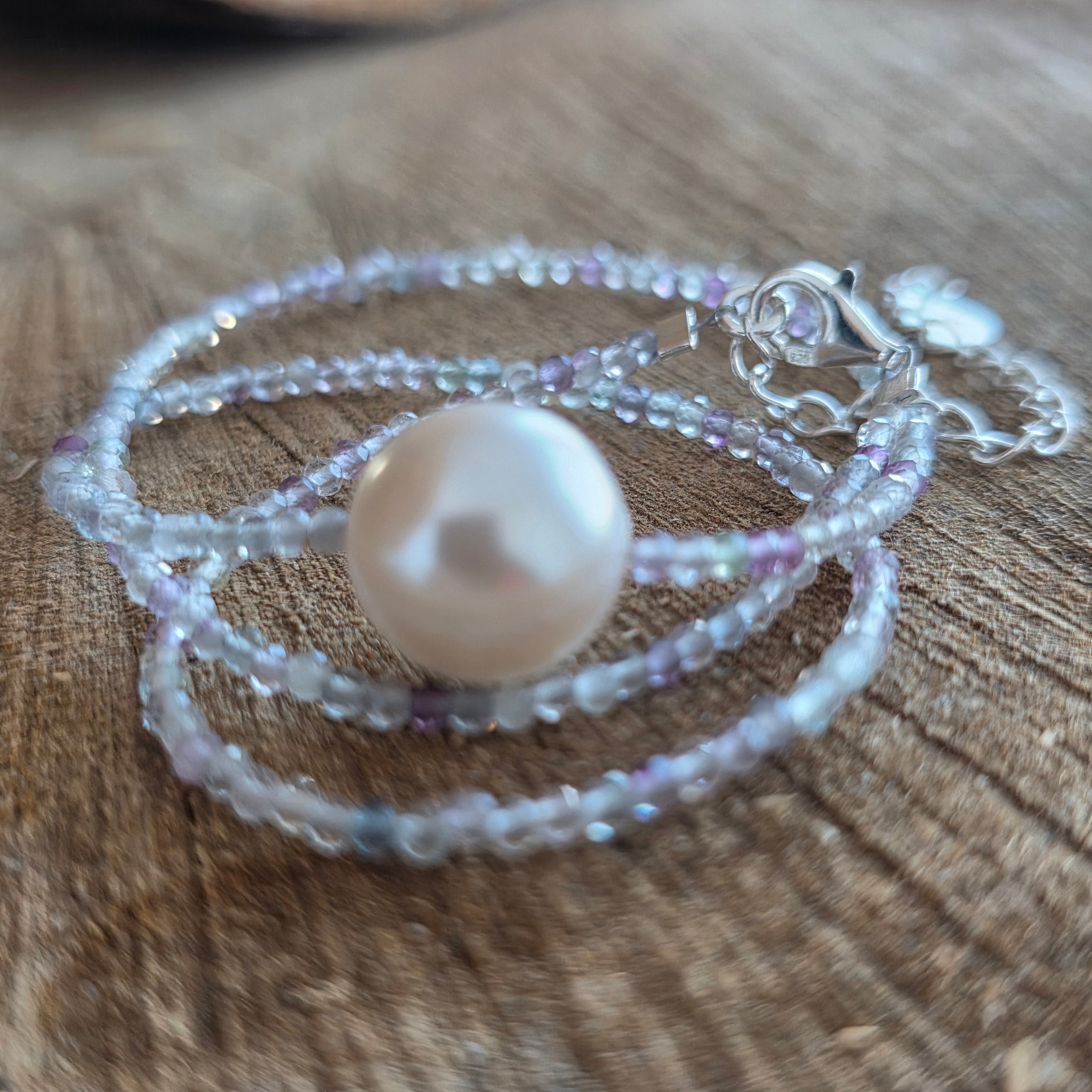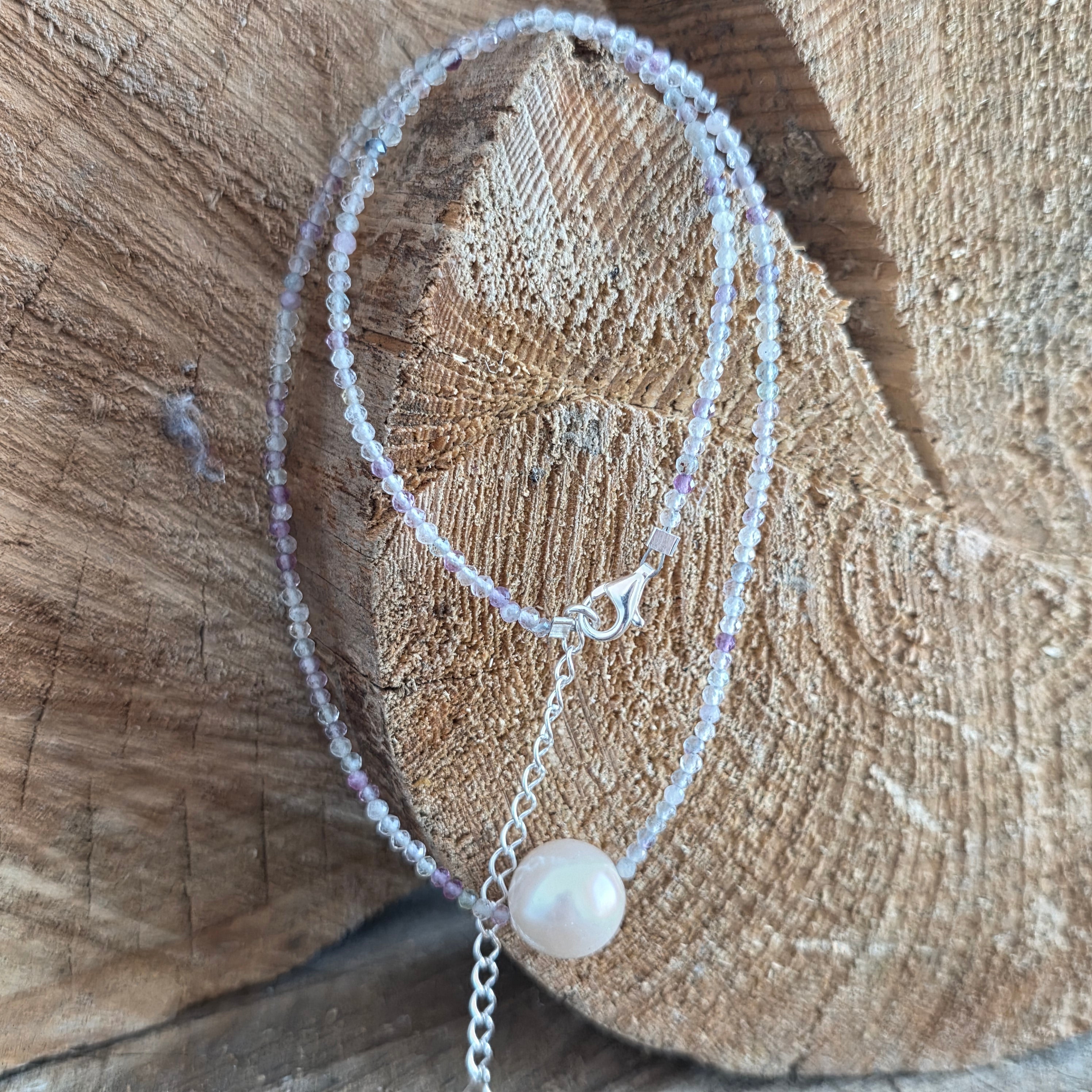 Materiale: fluorit curcubeu fatetat sfere 2 mm, argint 925, perla 1 cm