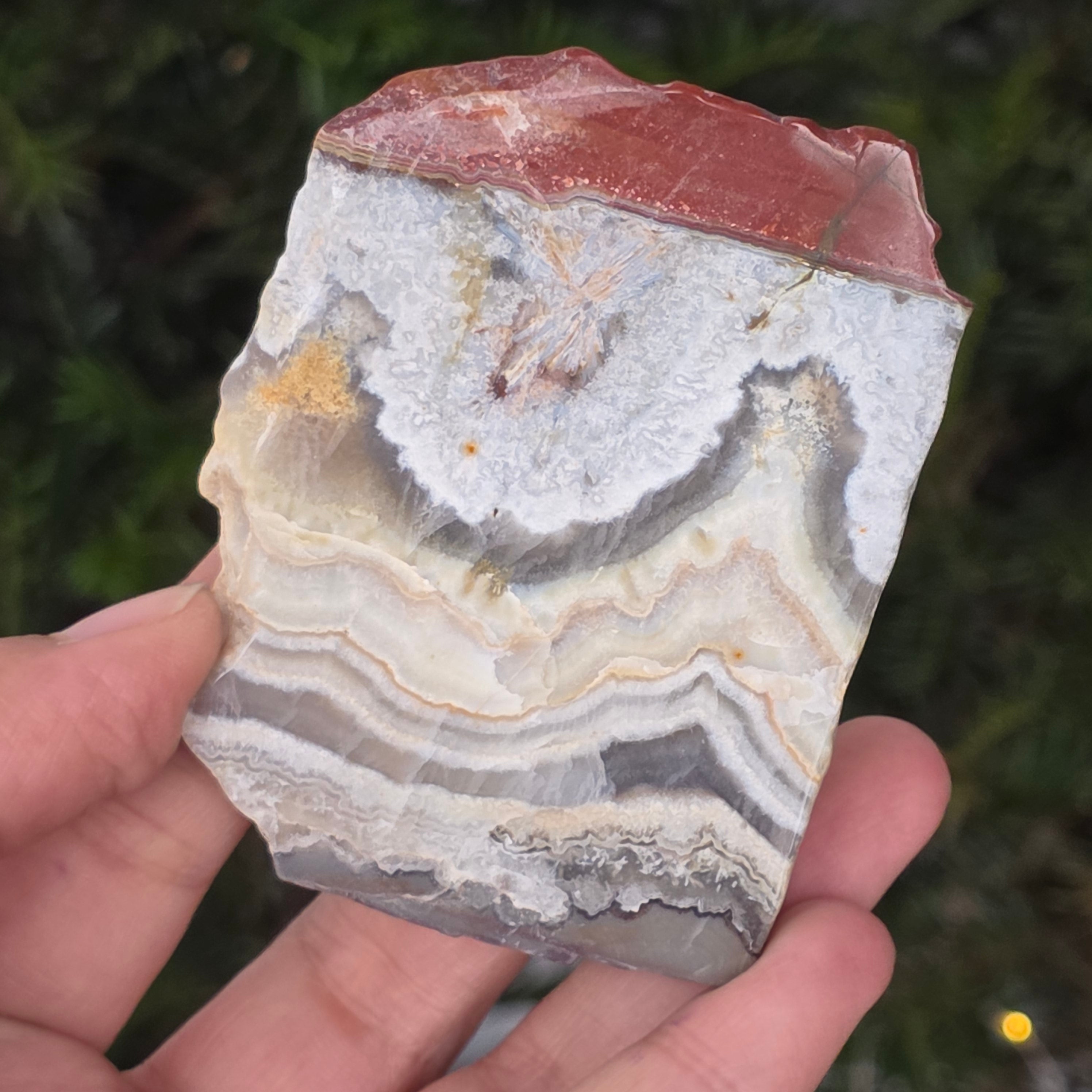 Mexican Crazy Agate is one of the most vibrant and spectacular varieties of agate, renowned for its wavy lines and wild color patterns that seem drawn by a free hand, without rules. In this natural slice, small but extremely expressive, the entire story of the stone is revealed: earthy layers, warm caramel tones, bright red, orange, gray and cream, blended in spiral patterns that seem to pulse with life.