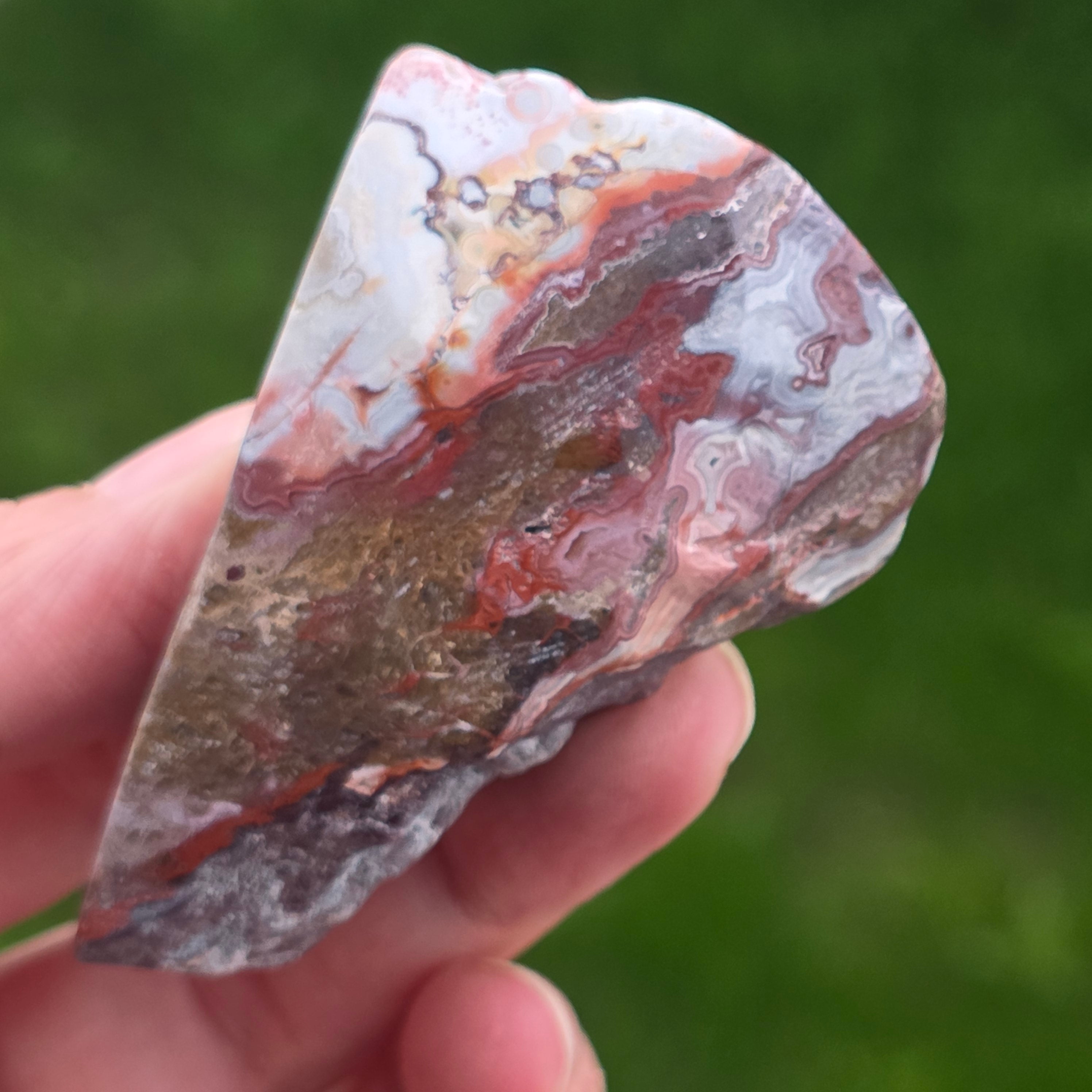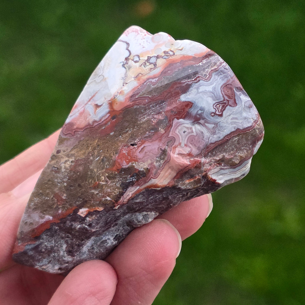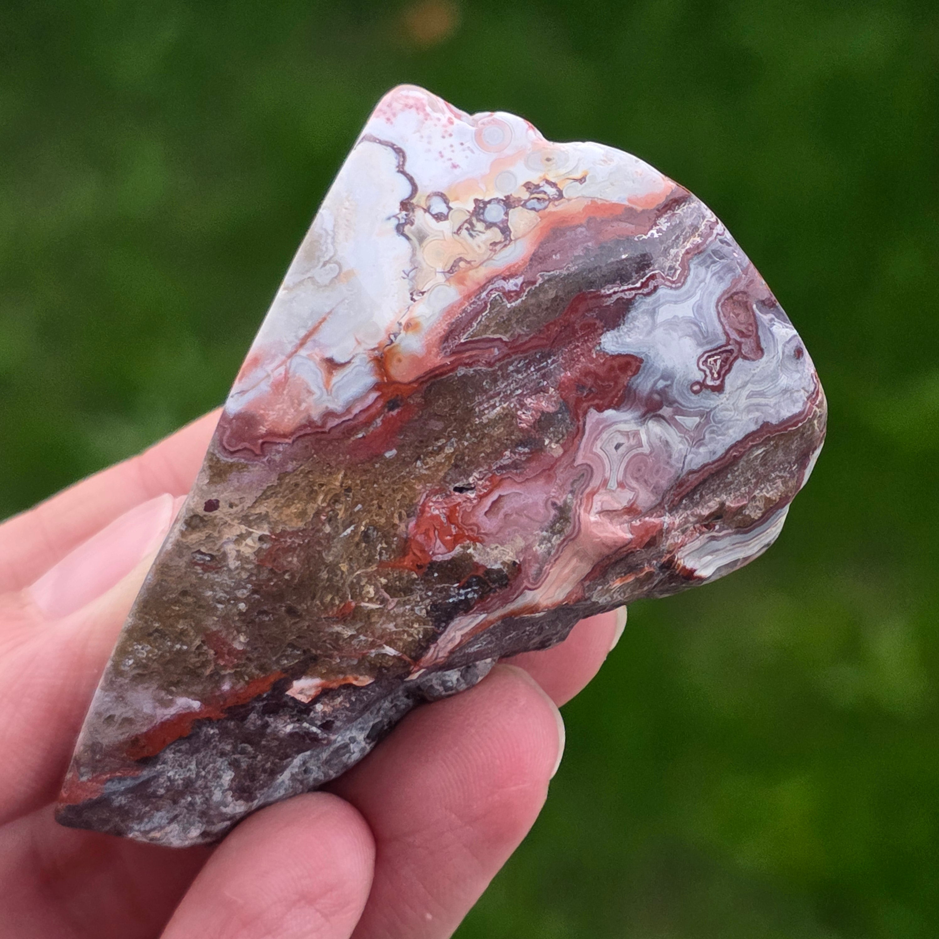 Crazy Agate from Mexico is one of the most vibrant and spectacular varieties of agate, famous for its wavy lines and wild color patterns that seem drawn by a free hand, without rules. In this natural slice, small but extremely expressive, the entire story of the stone is revealed: earthy layers, warm shades of caramel, bright red, orange, gray, and cream, mixed in spiral patterns that seem to pulse with life.