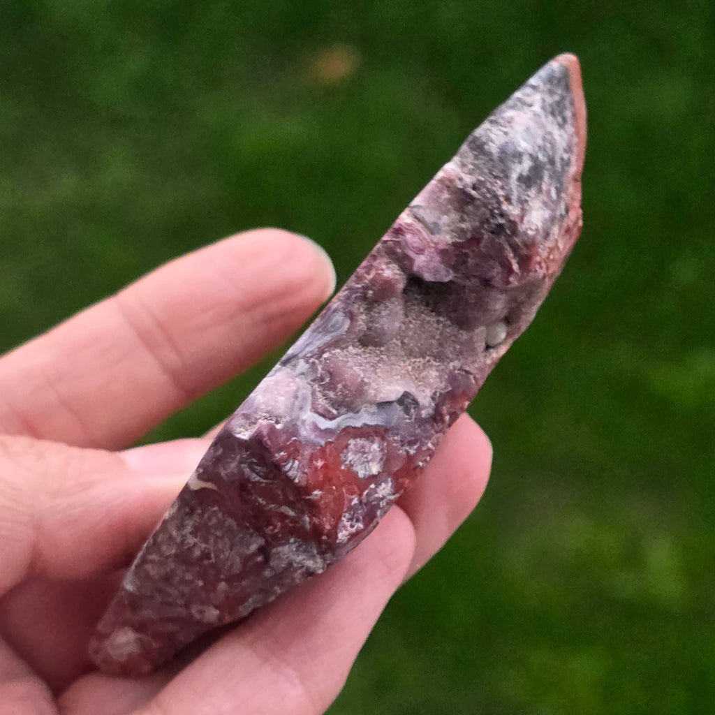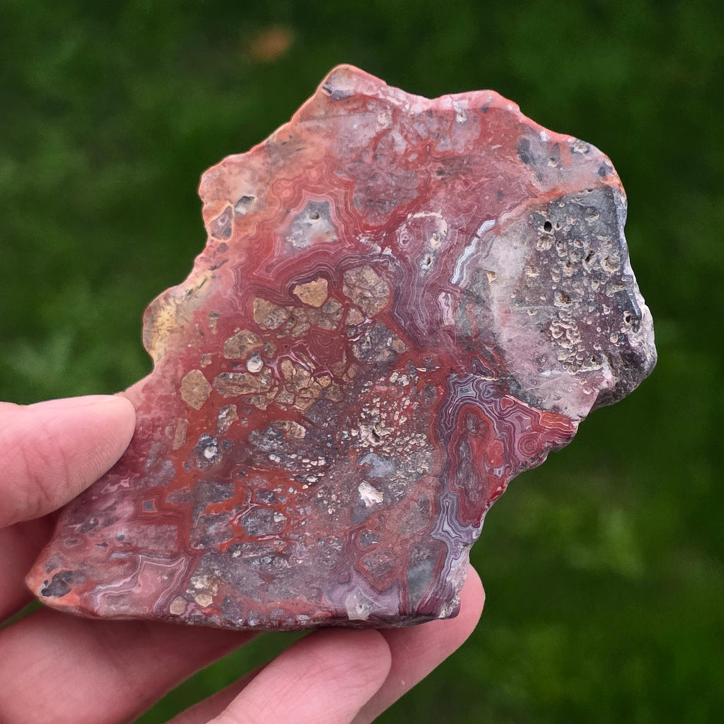Mexican Crazy Agate is one of the most vibrant and spectacular varieties of agate, famous for its wavy lines and wild color patterns that seem drawn by a free hand, without rules. In this natural slice, small but extremely expressive, the whole story of the stone is revealed: earthy layers, warm shades of caramel, bright red, orange, gray, and cream, mixed in spiral patterns that seem to pulse with life.