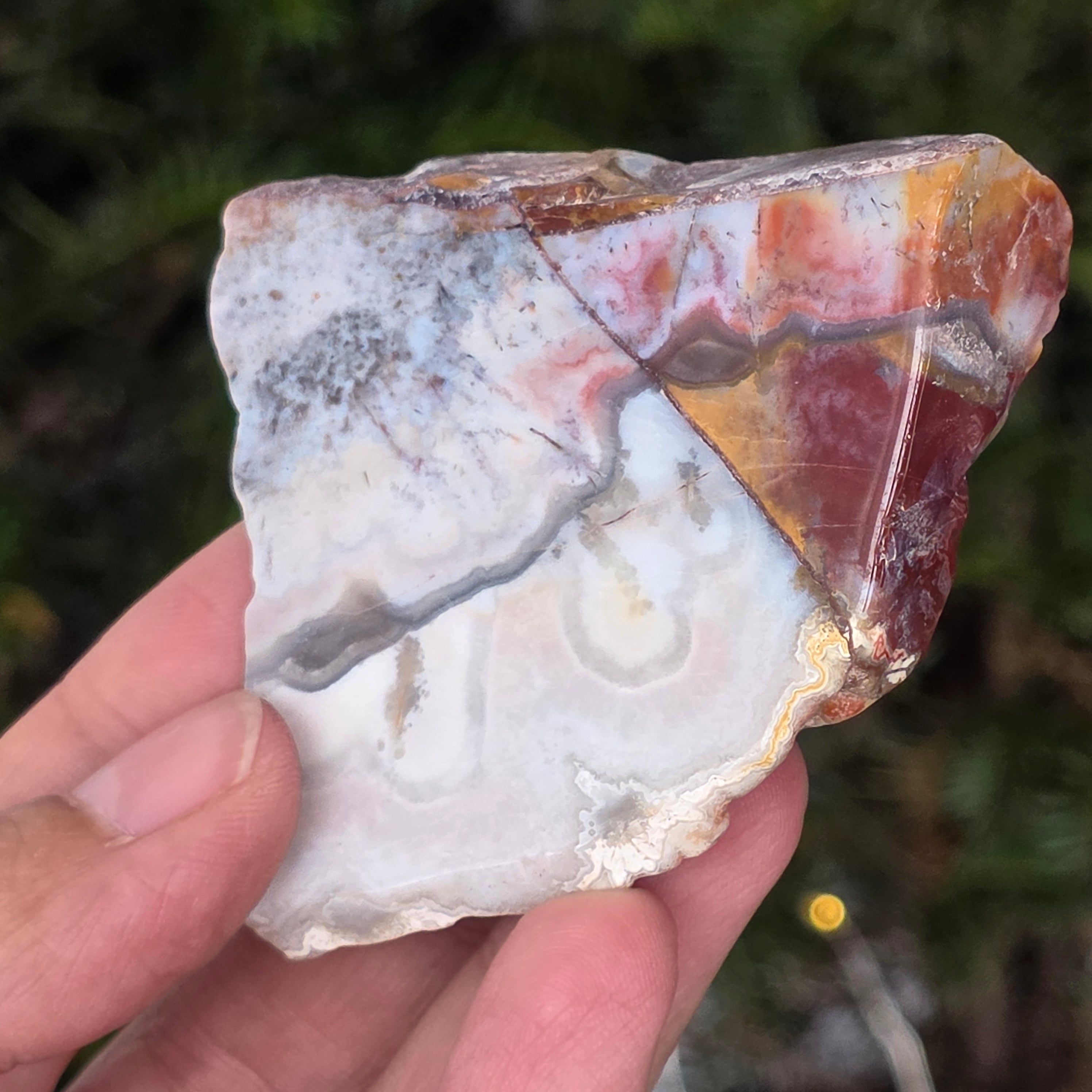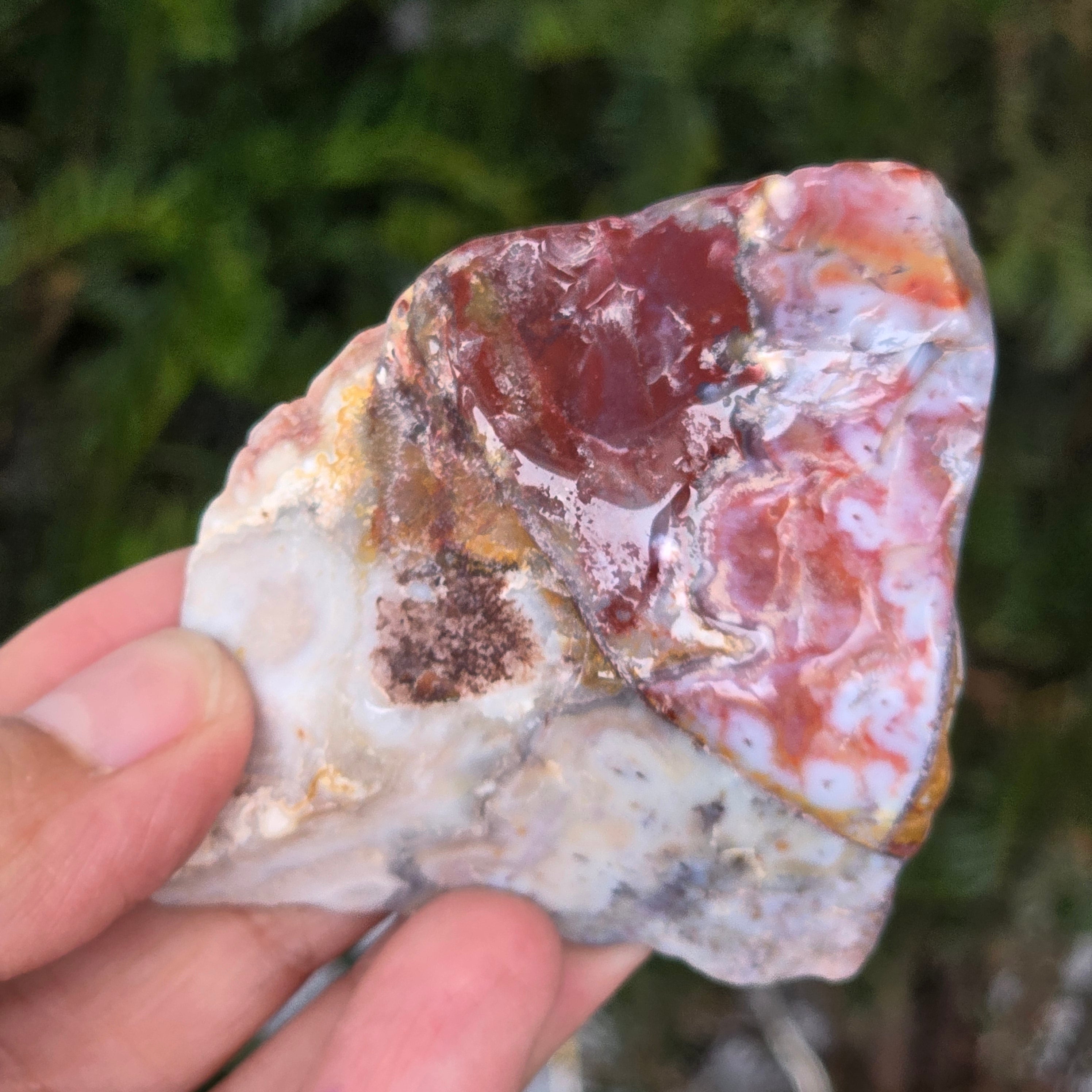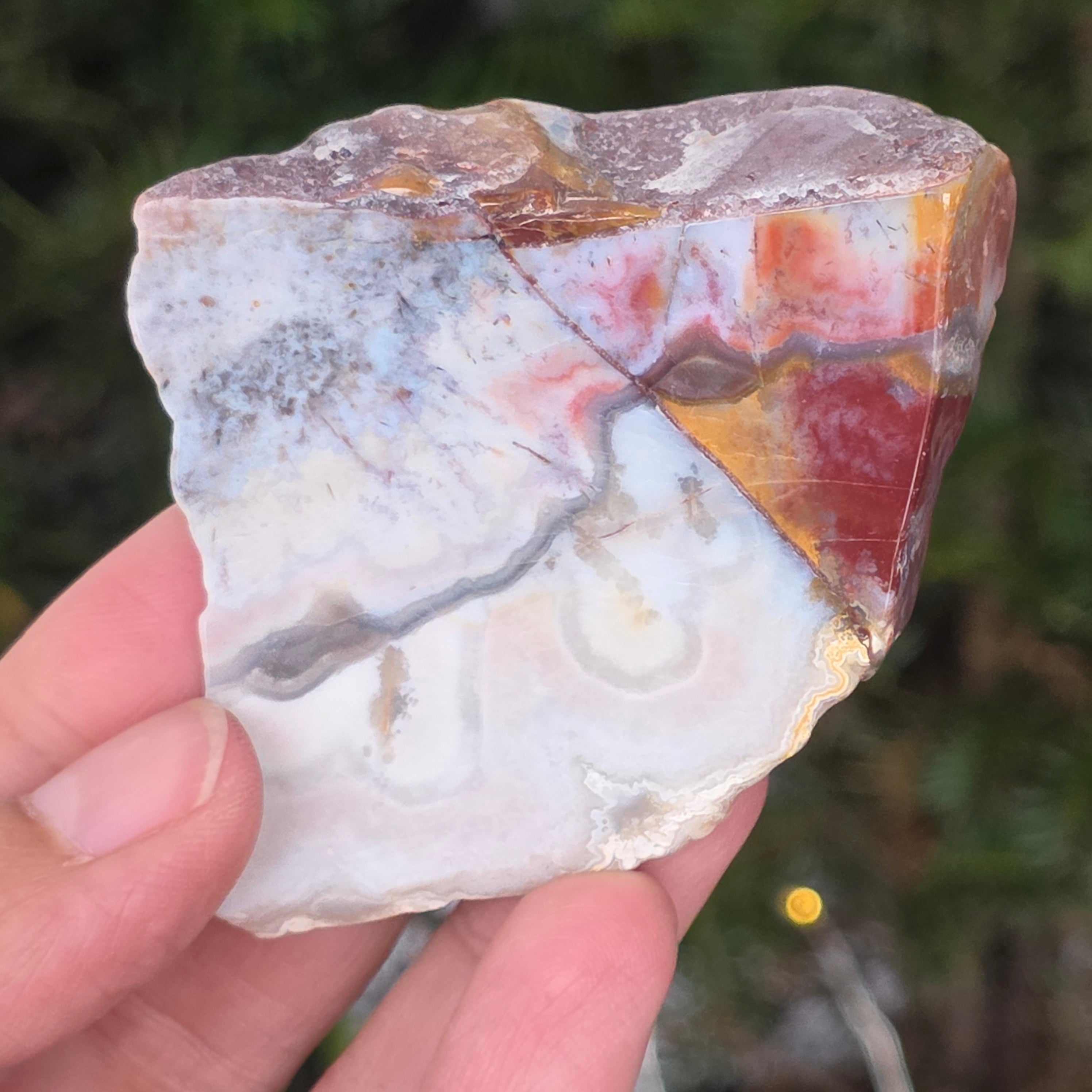 Mexican Crazy Agate is one of the most vibrant and spectacular varieties of agate, famous for its wavy lines and wild color patterns that seem drawn by a free hand, without rules. In this natural slice, small but extremely expressive, the entire story of the stone is revealed: earthy layers, warm shades of caramel, bright red, orange, gray, and cream, mixed in spiral patterns that seem to pulse with life.