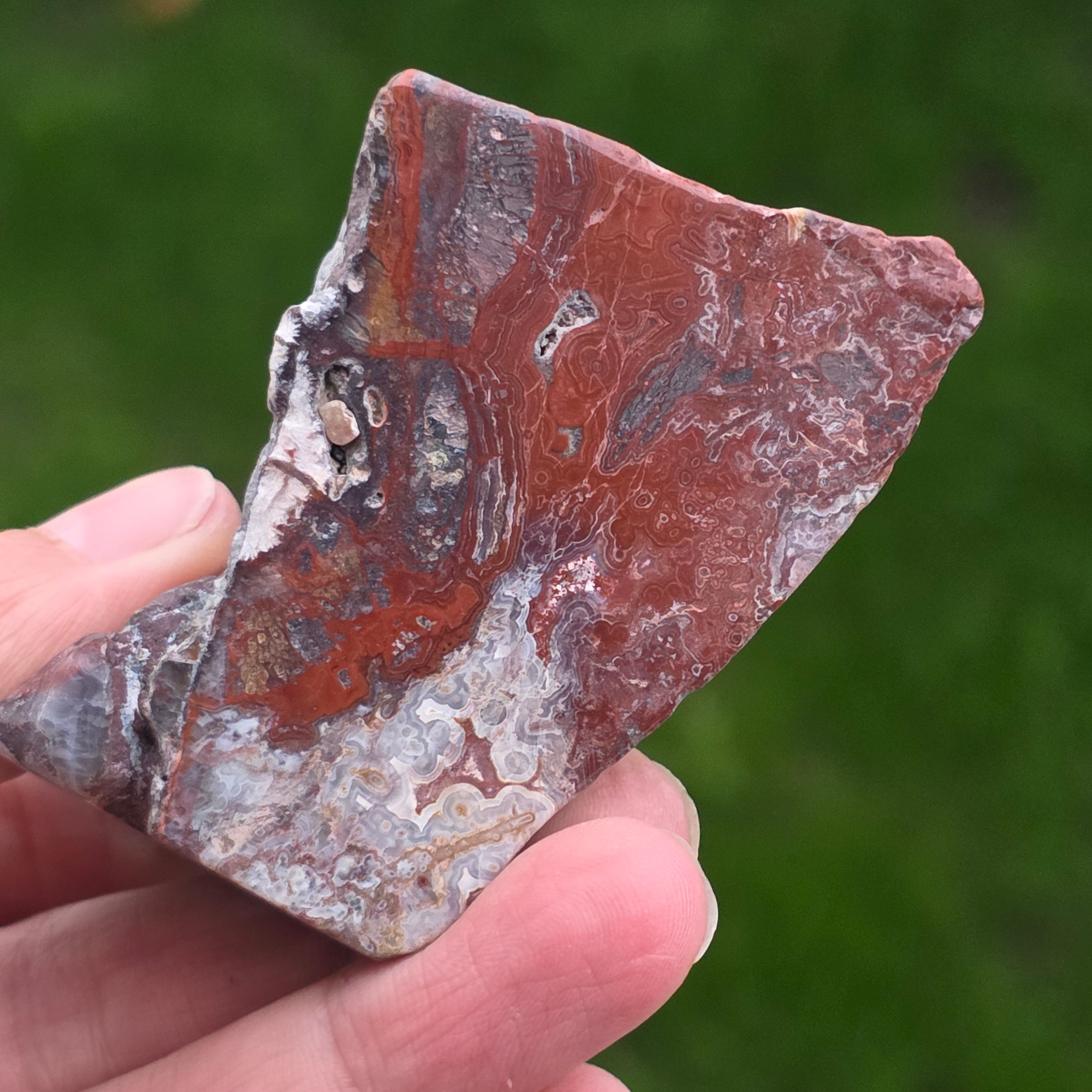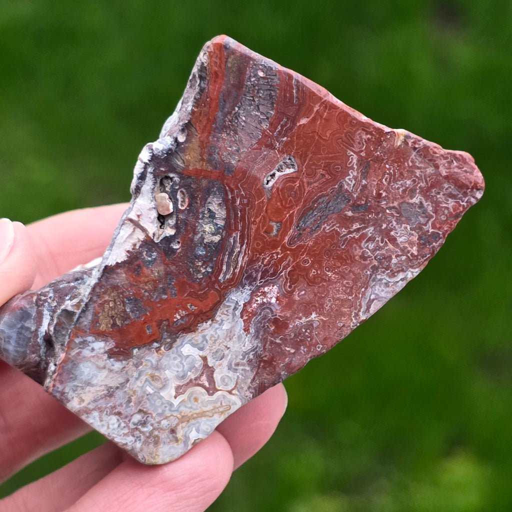 Crazy Agate from Mexico is one of the most vibrant and spectacular varieties of agate, famous for its wavy lines and wild color patterns that seem drawn by a free hand, without rules. In this natural slice, small but extremely expressive, the whole story of the stone is revealed: earthy layers, warm shades of caramel, bright red, orange, gray, and cream, mixed in spiral patterns that seem to pulse with life.