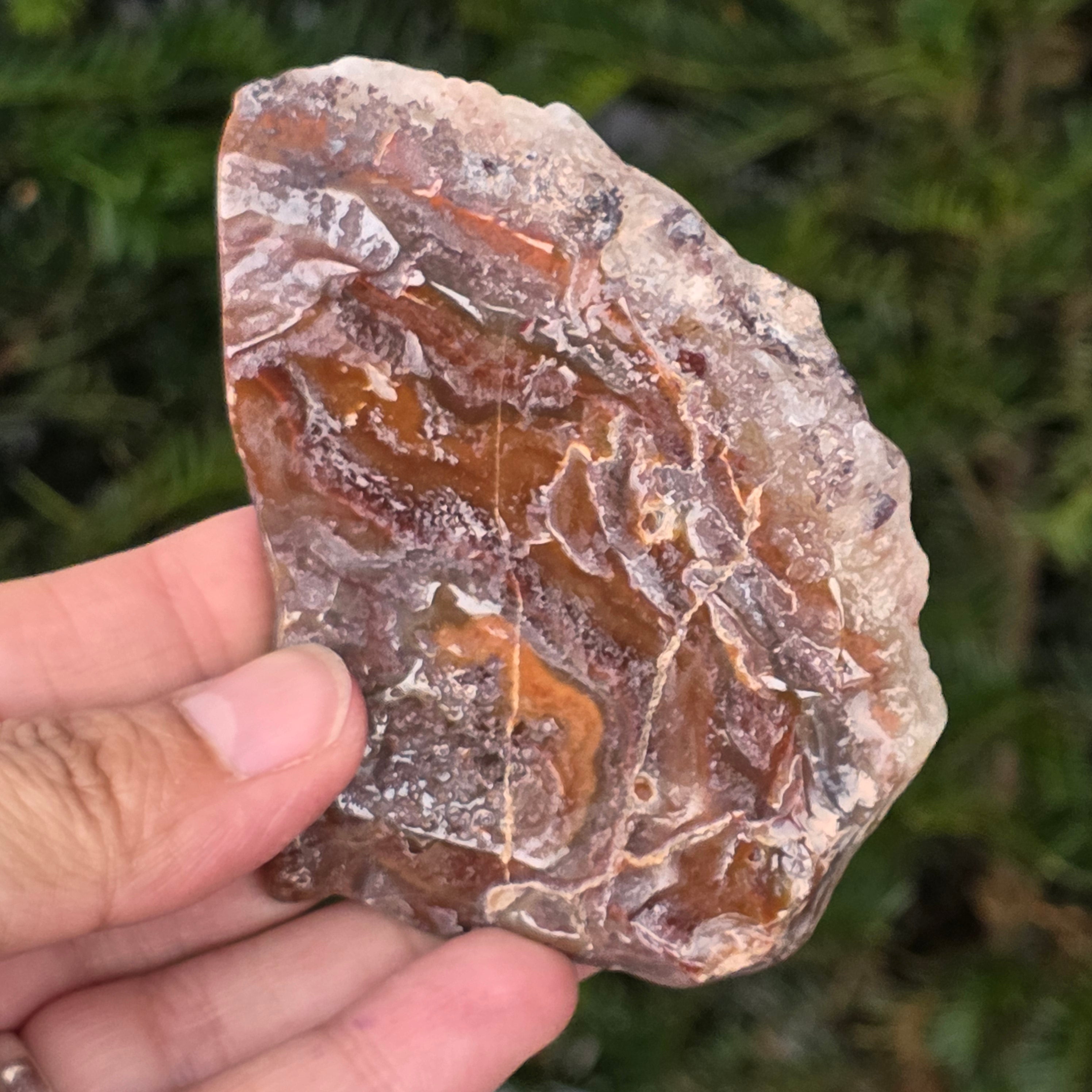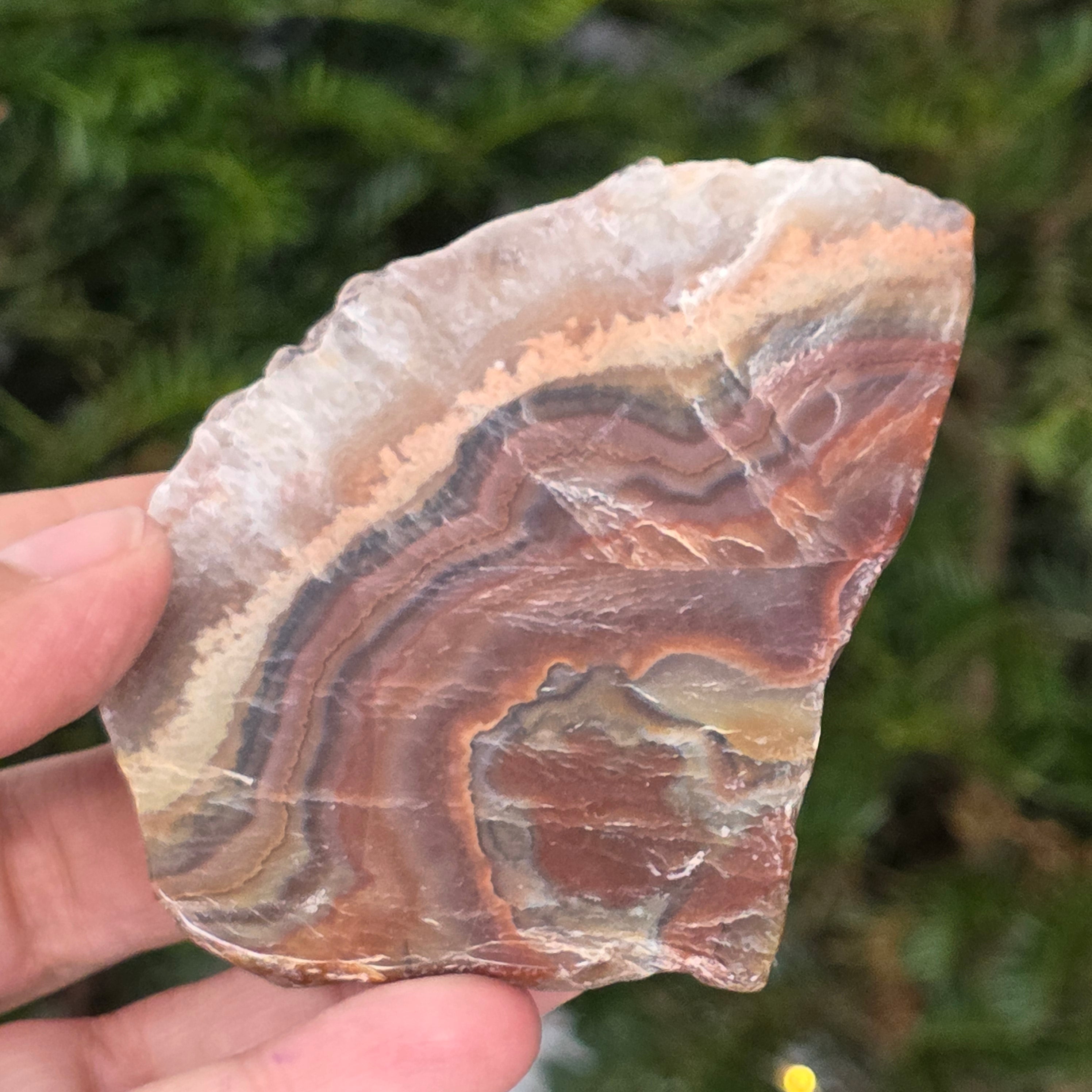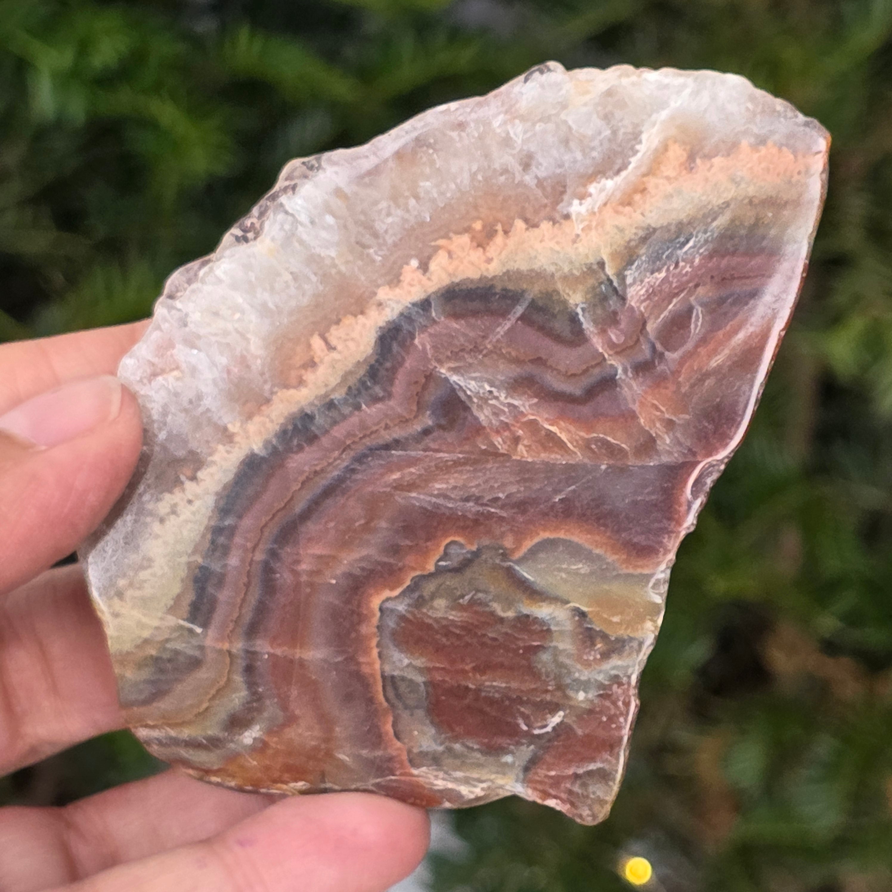 Mexican Crazy Agate is one of the most vibrant and spectacular varieties of agate, renowned for its wavy lines and wild color patterns that seem drawn by a free hand, without rules. In this natural slice, small but extremely expressive, the entire story of the stone is revealed: earthy layers, warm caramel tones, bright red, orange, gray and cream, blended in spiral patterns that seem to pulse with life.