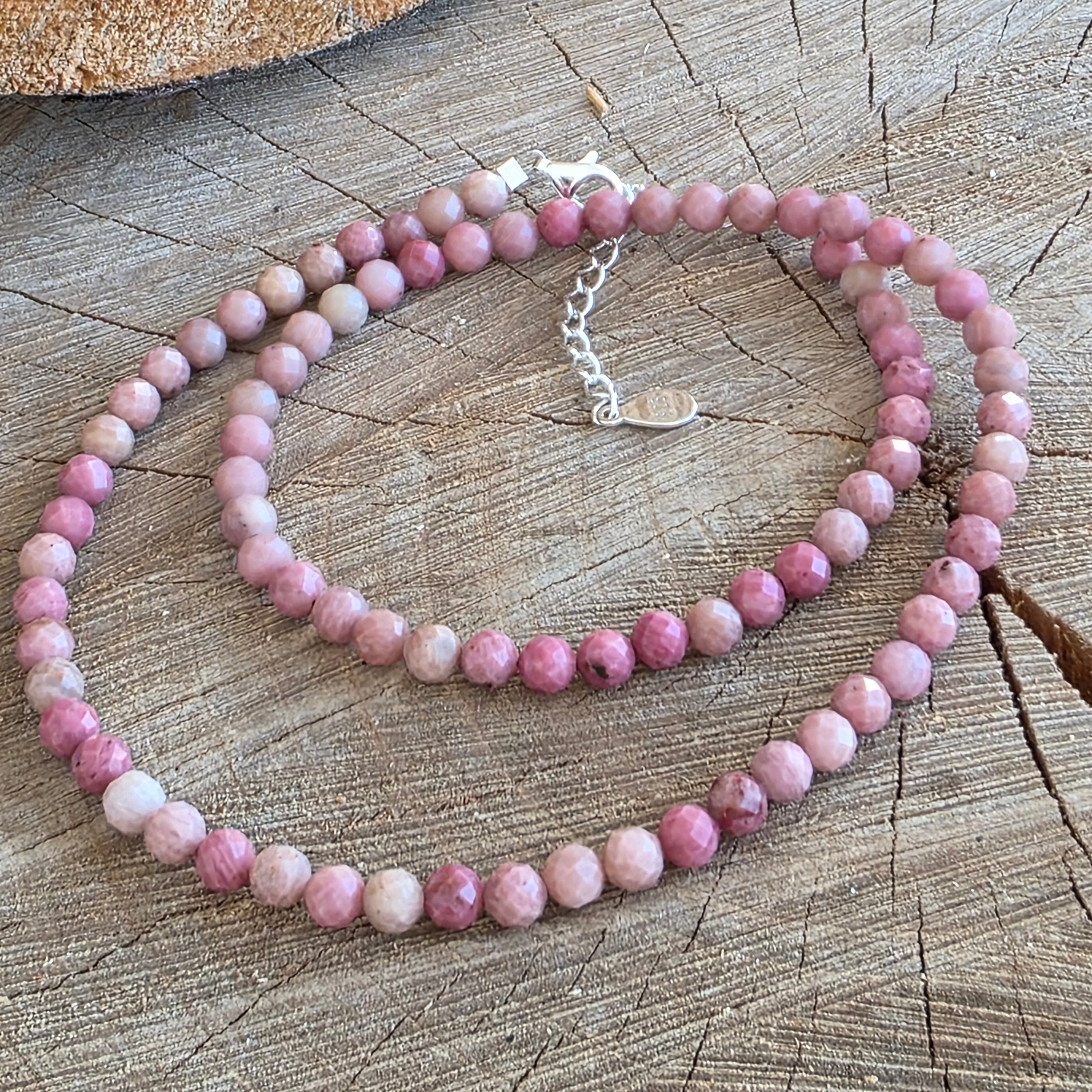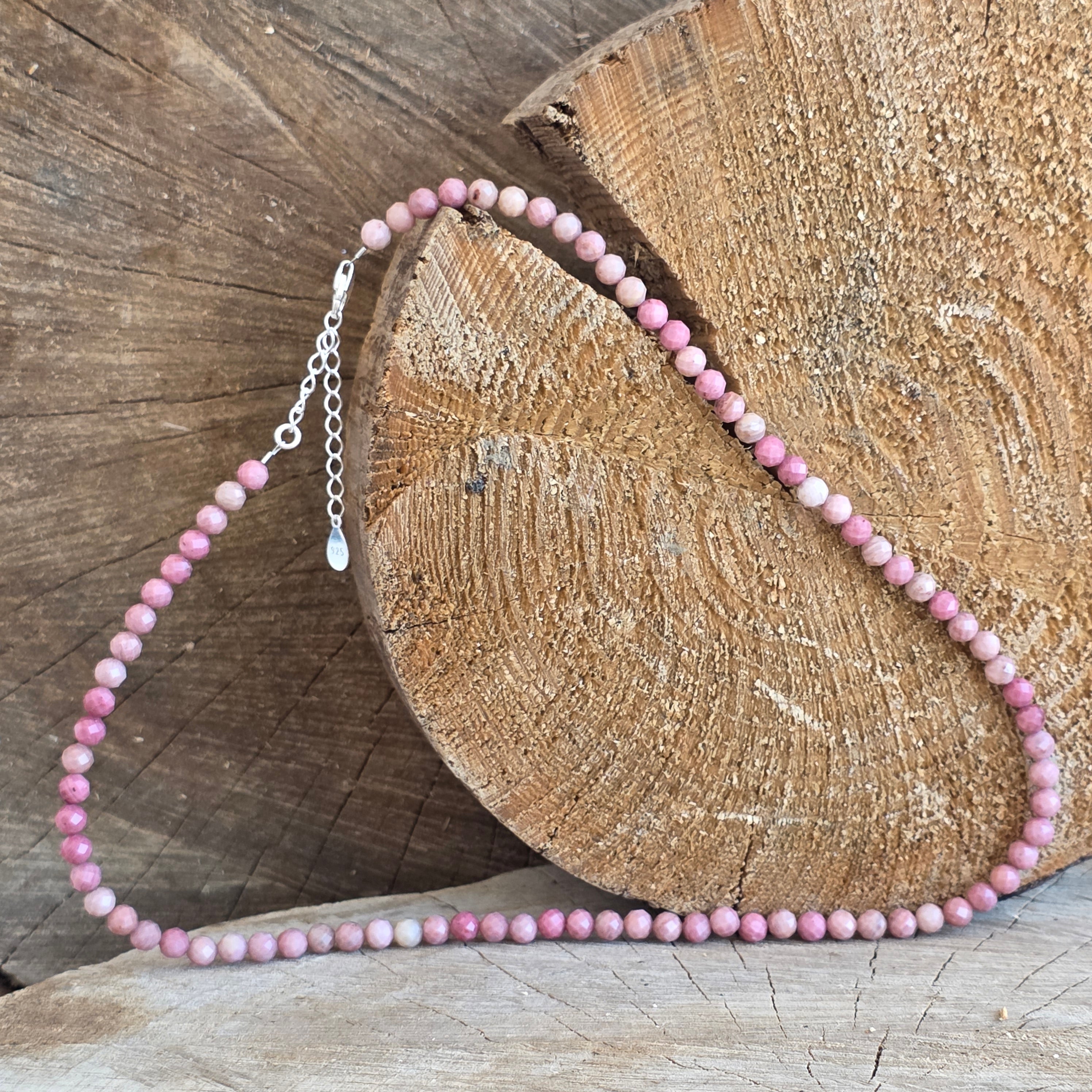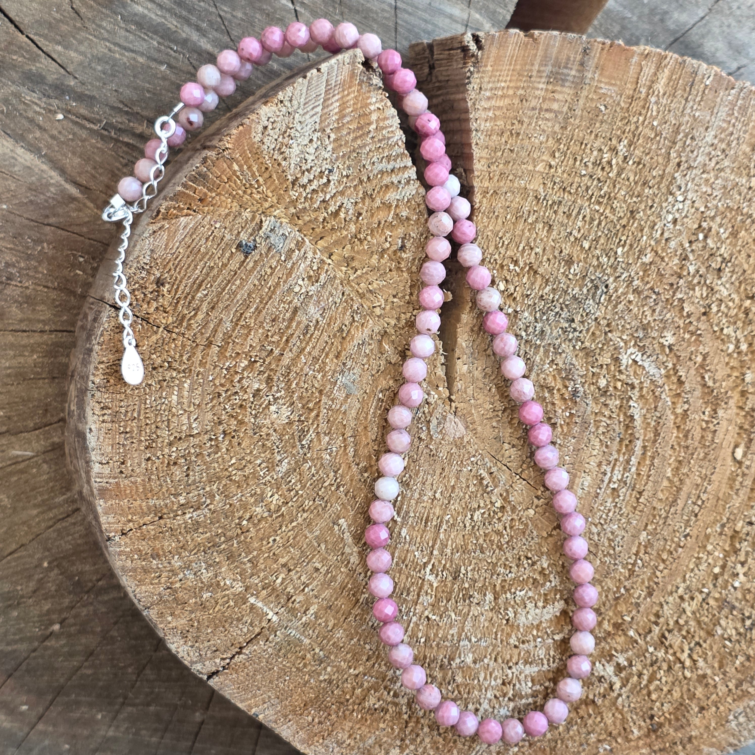 A delicate and luminous necklace, made from 3 mm faceted pink opal beads, forming a fine and harmonious line around the neck. The soft milky pink tones, with subtle reflections and a slightly translucent texture, give the jewelry a warm and refined feel. The subtle faceting adds depth and a gentle sparkle without overpowering, maintaining an elegant visual balance.