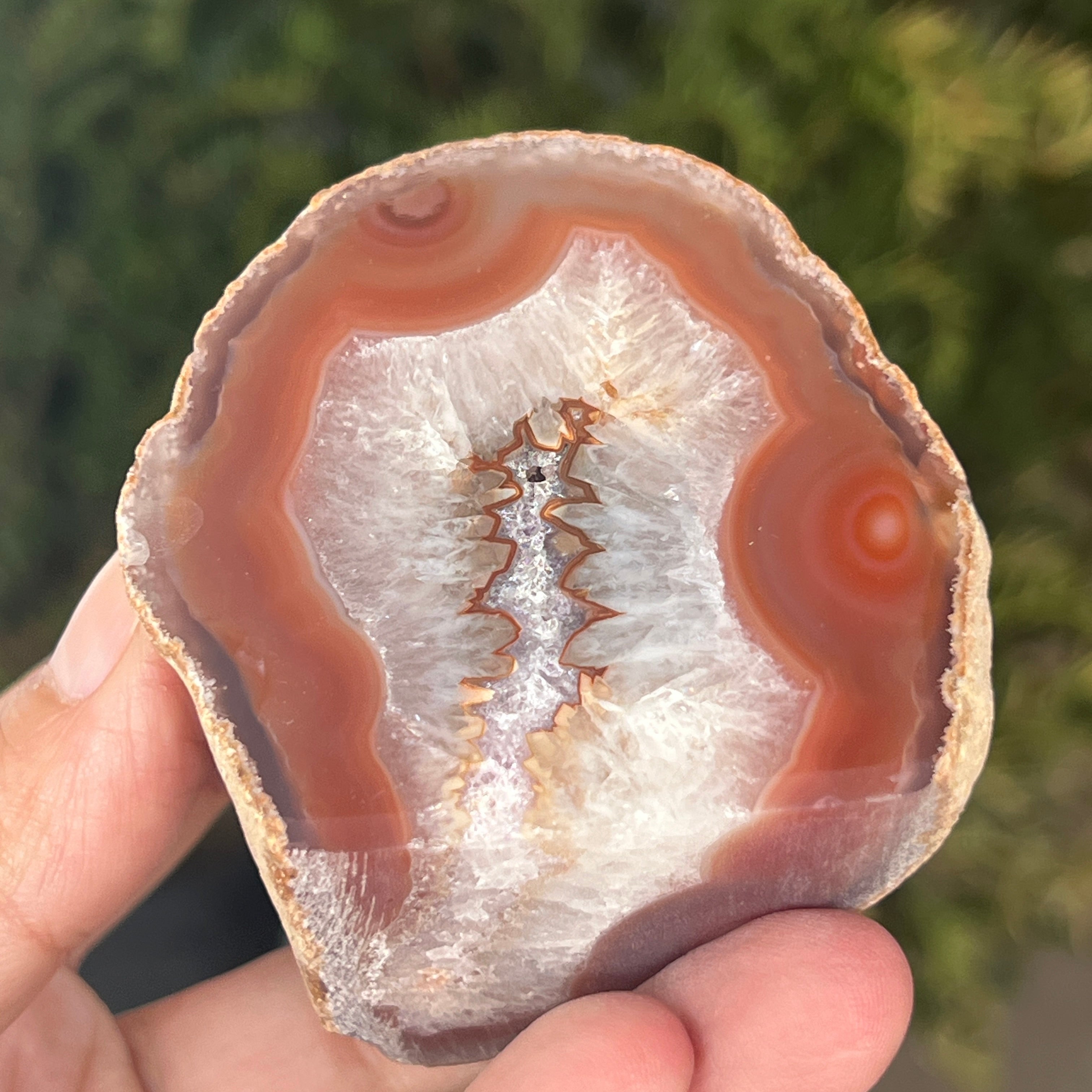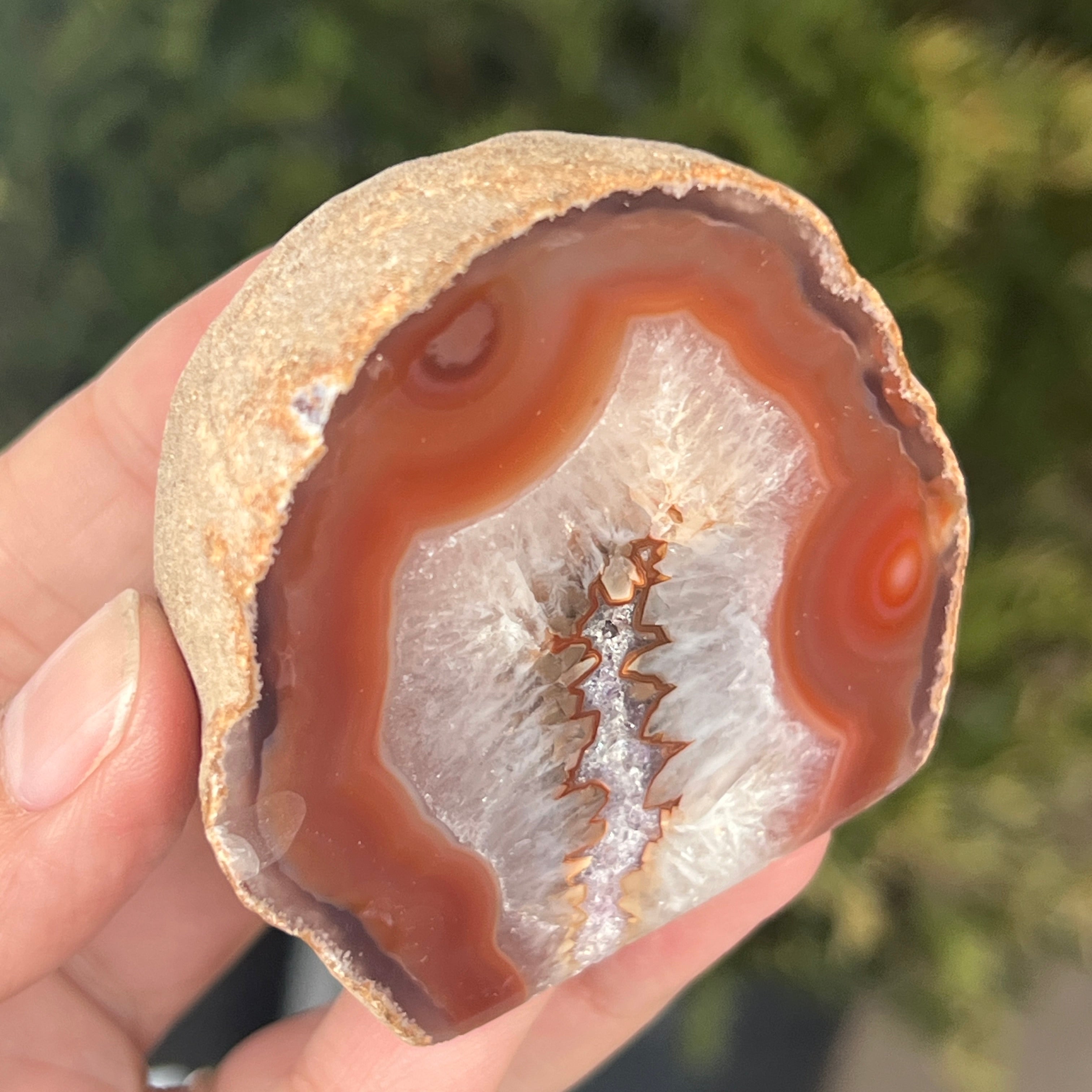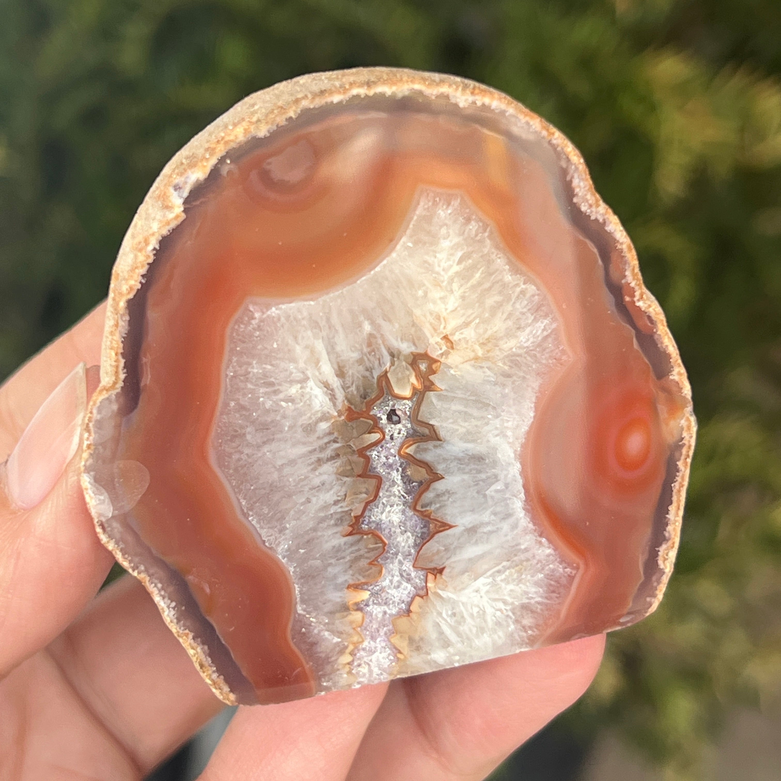 Red agate is a variety of microcrystalline quartz from the chalcedony family, formed through successive deposits of silica in volcanic cavities. Its warm shades are often influenced by the presence of iron oxides, which give it its intense color. It is a variety of agate appreciated both for the natural beauty of its bands and for the symbolism associated with vitality, courage, and emotional balance.
