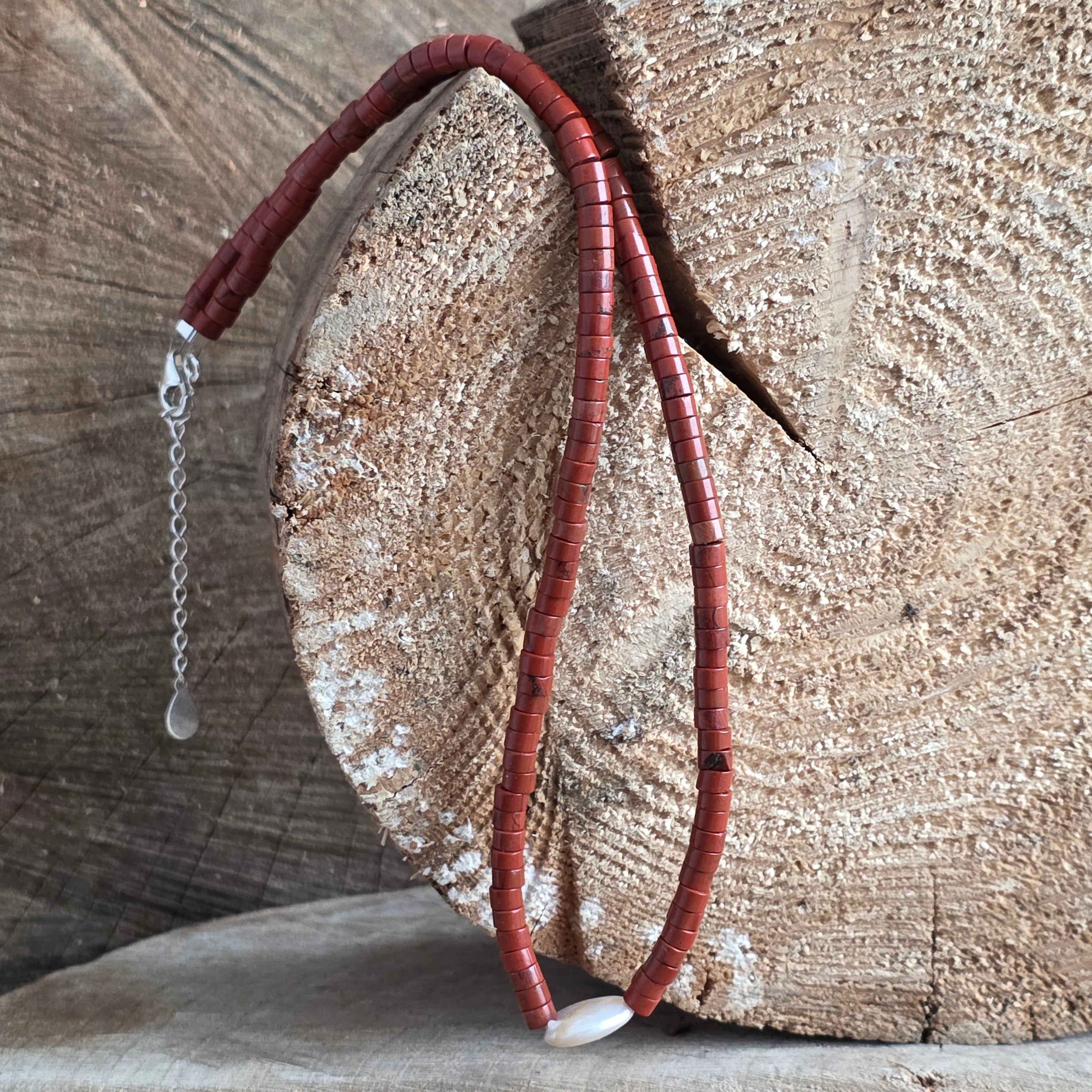 A necklace that carries the energy of the earth and the nobility of natural simplicity. Natural red jasper,cut into fine 4.5 × 2 mm discs, radiates strength and vitality, while the central 1 cm pearl adds a touch of light, like a drop of calm in the midst of vivid color. Together, they create a perfect balance between passion and serenity, between fire and water.