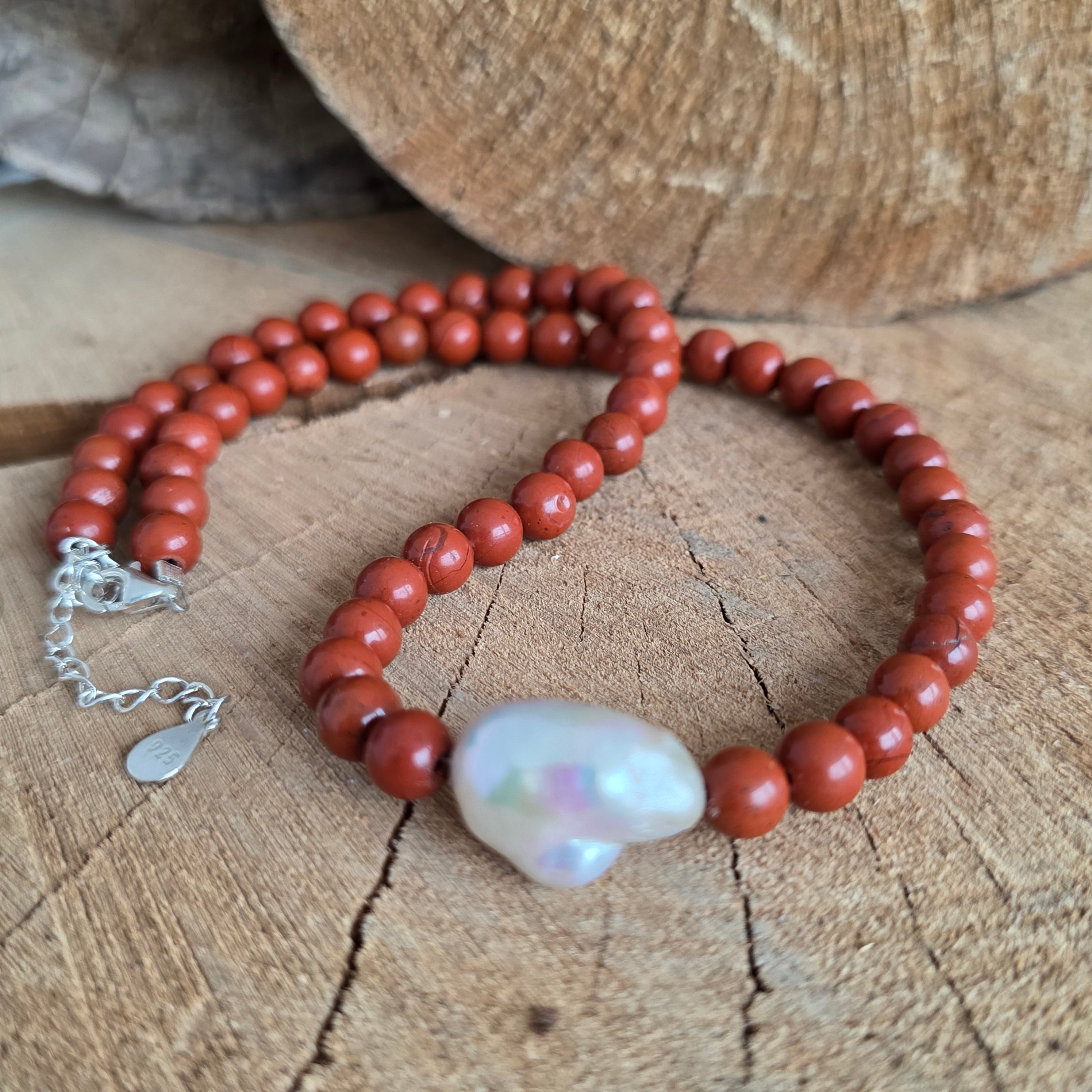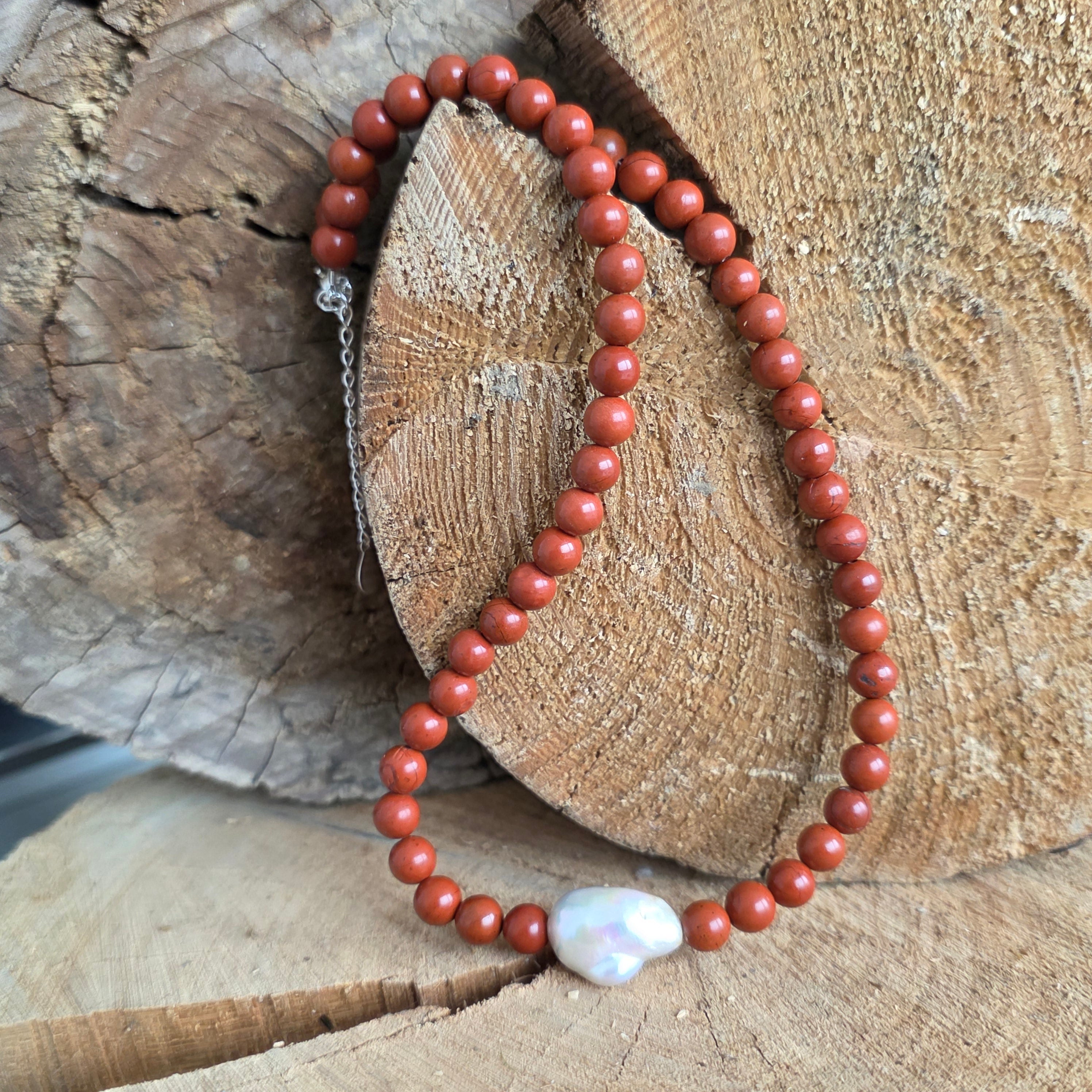 Red jasper is considered a stone of stability, courage, and vital energy. It is said to strengthen the connection to the Earth, providing confidence, security, and inner resilience. Combined with the pearl, a symbol of purity and femininity, the necklace becomes a subtle expression of harmony between strength and grace.