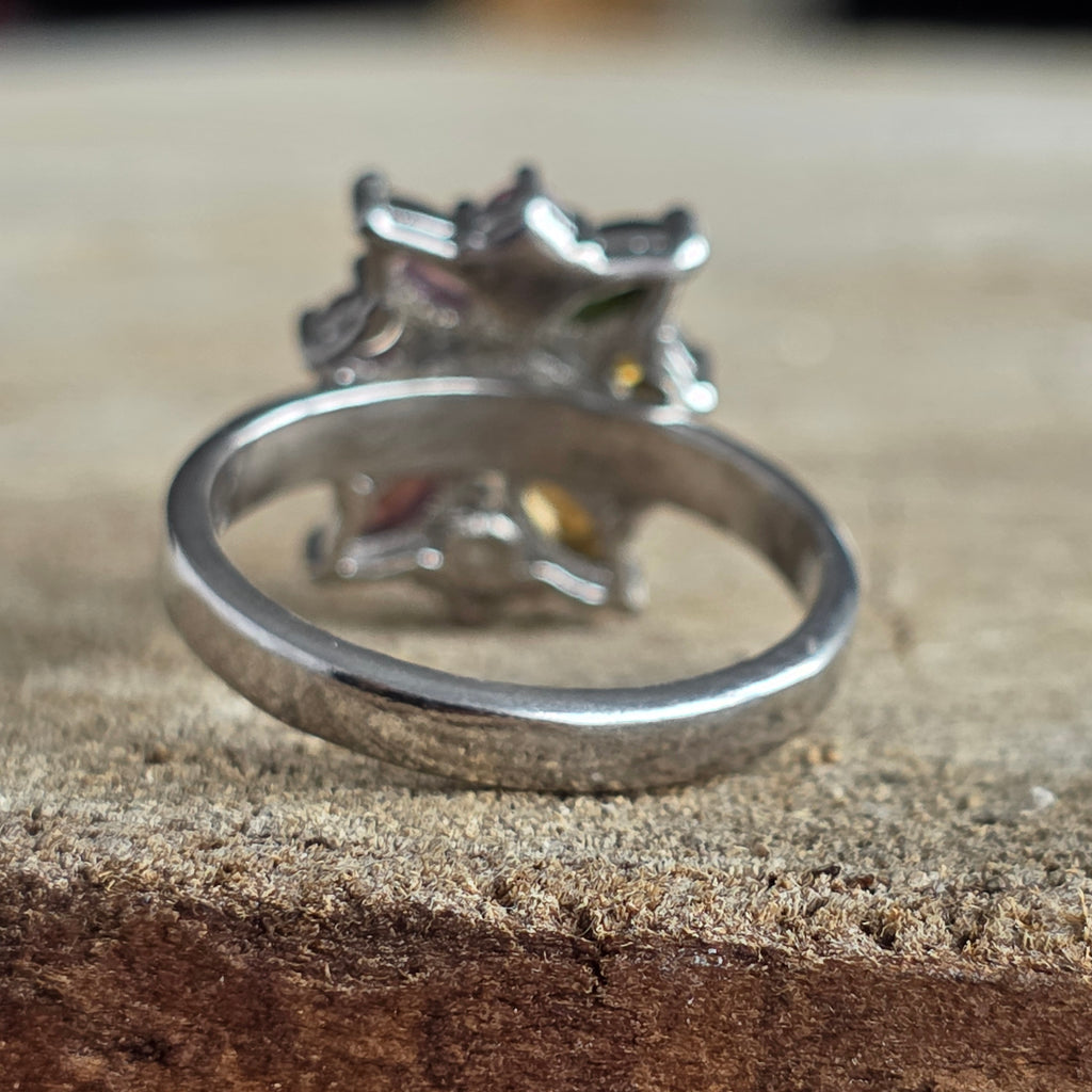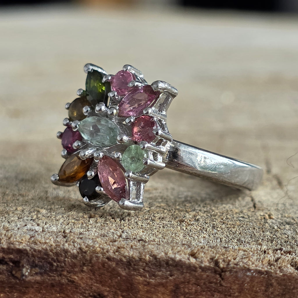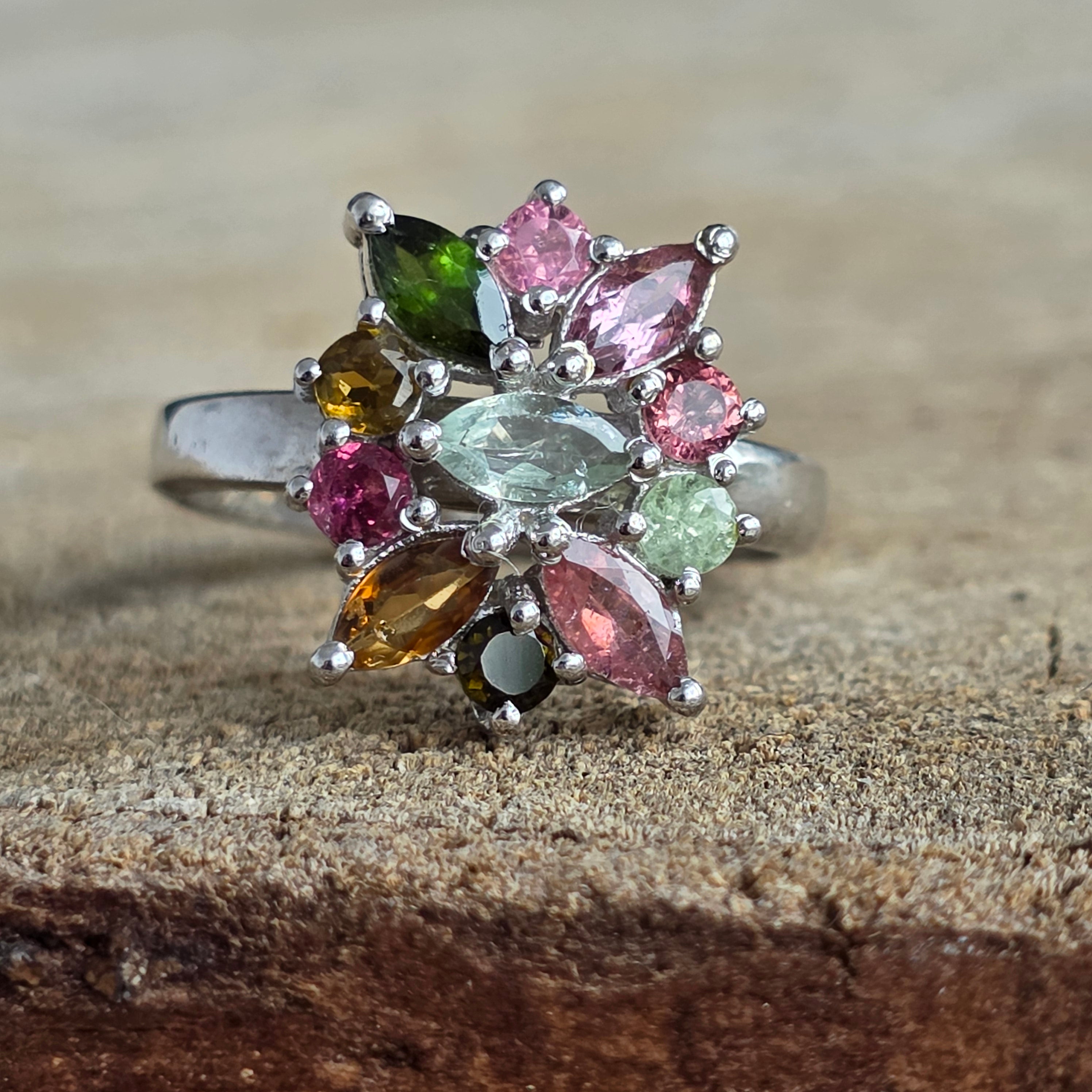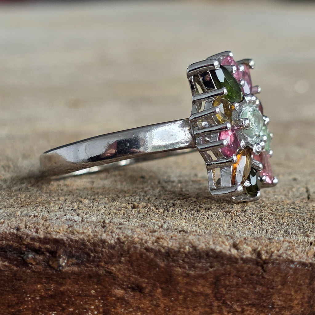 An explosion of color and sophistication – this one 925 silver ring plated with rhodium brings to life the vibrant spectrum of natural tourmalines, arranged in an elegant floral design.