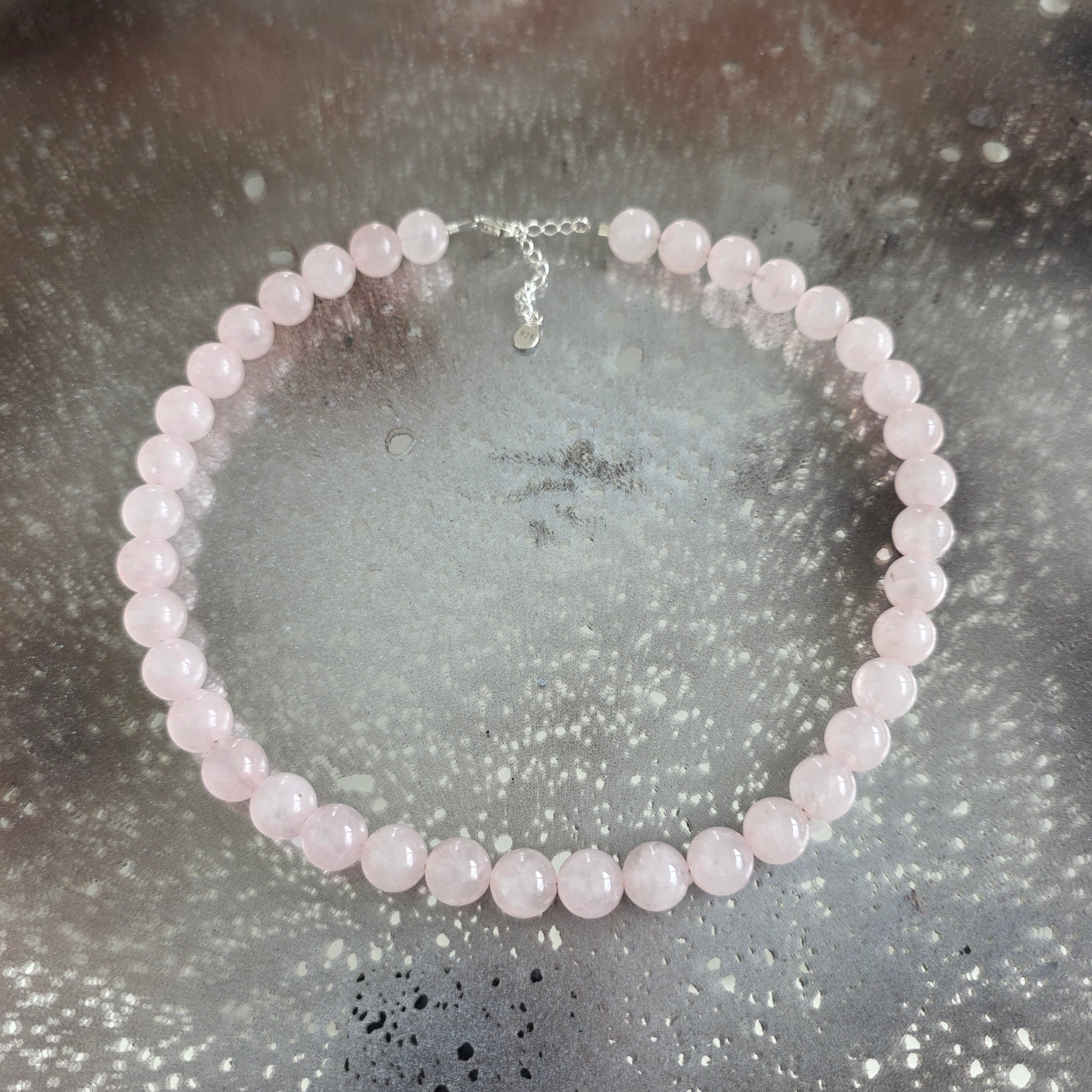 Made entirely of natural rose quartz spheres, the necklace brings to light the essence of gentleness and unconditional love. Each sphere of 10 mm, carefully chosen and polished, keeps in it a warm silence, like a heart that beats in harmony with the universe.