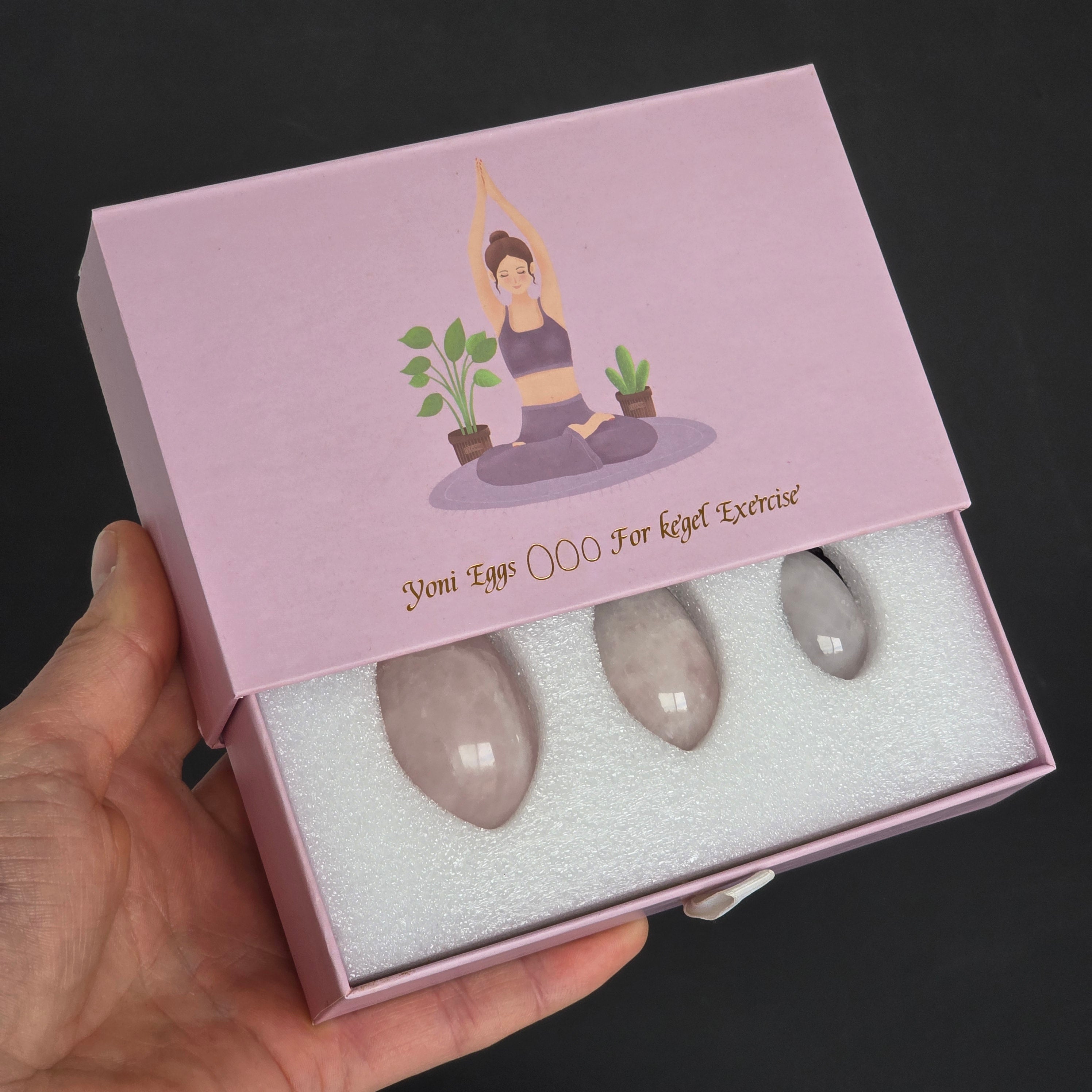 Yoni Pink Quartz Eggs - Set of 3 pieces packaged in a natural gift box.