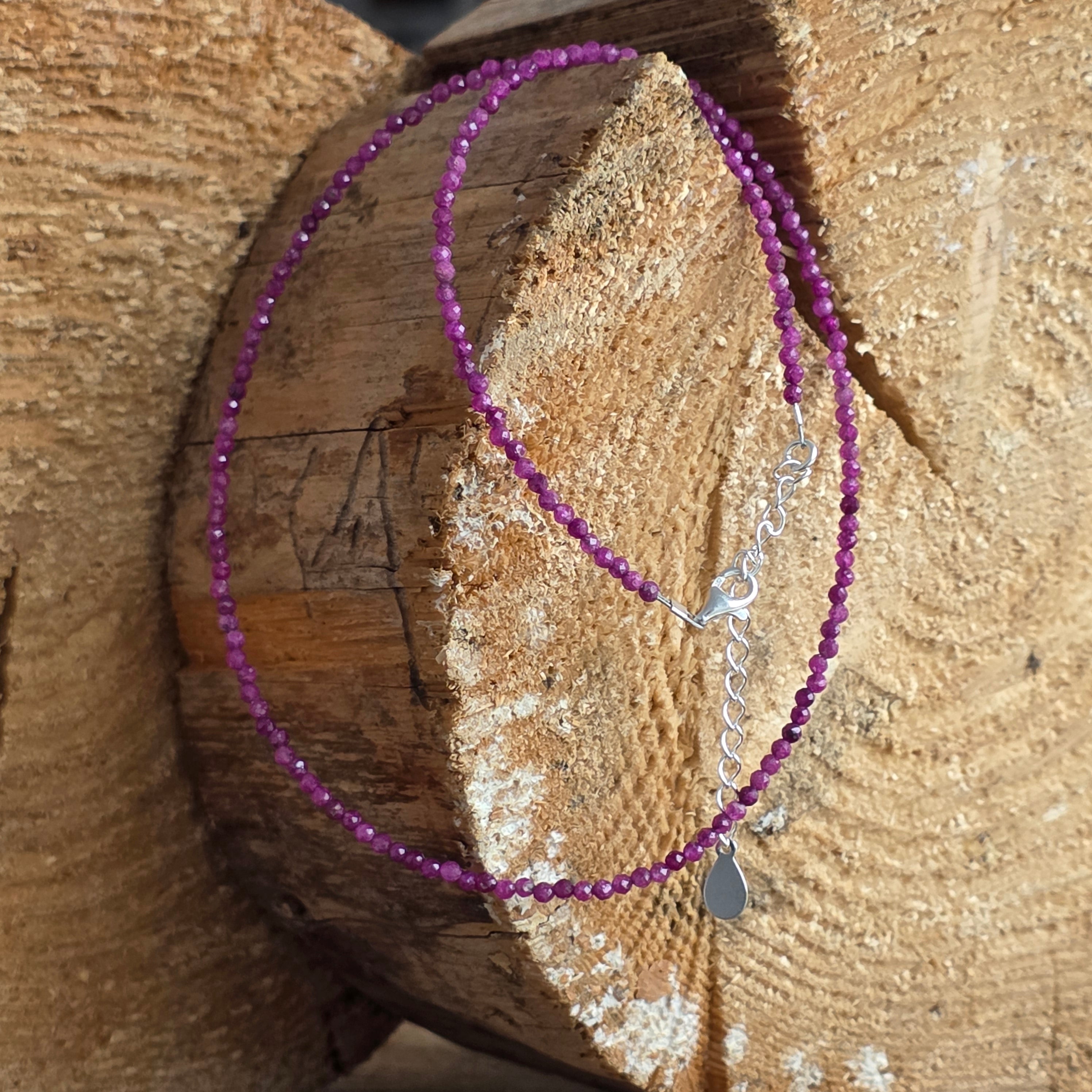 A delicate yet striking necklace, made from 2.5 mm faceted natural ruby beadsin a deep intense cherry-redshade, with warm, almost royal reflections. Each small, quiet bead subtly reflects the light, like a whisper of passion, intention, and inner nobility.