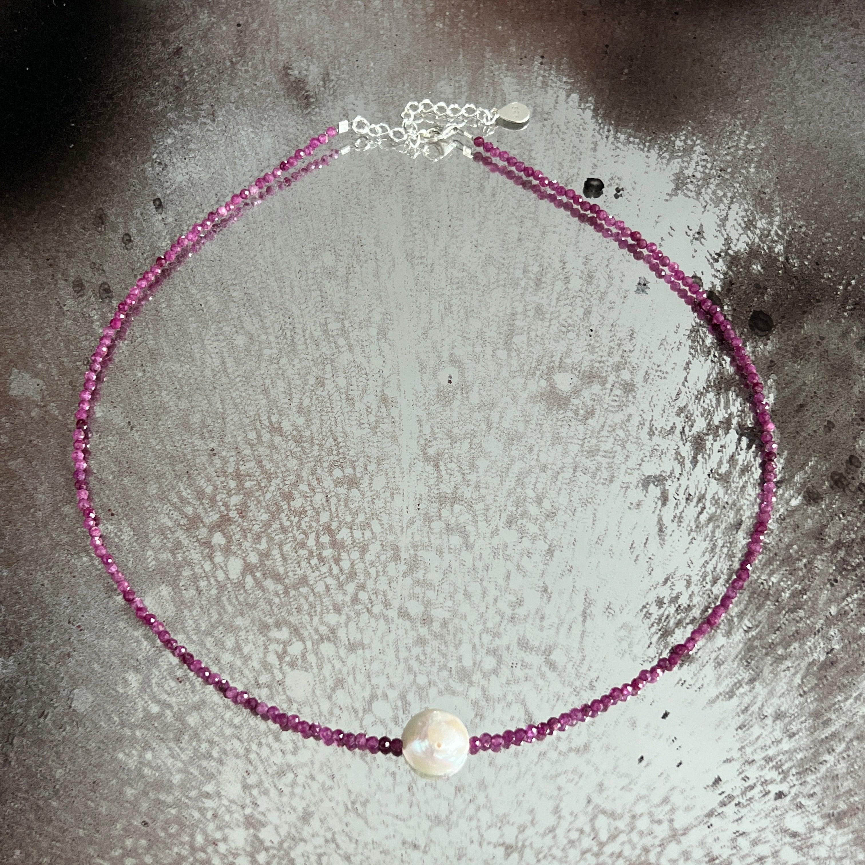 A delicate necklace, yet with presence, made from 2.5 mm natural faceted ruby beads, in a deep intense burgundyshade, with warm and almost regal reflections. Each small and silent pearl reflects light subtly, like a whisper of passion, intention, and inner nobility.