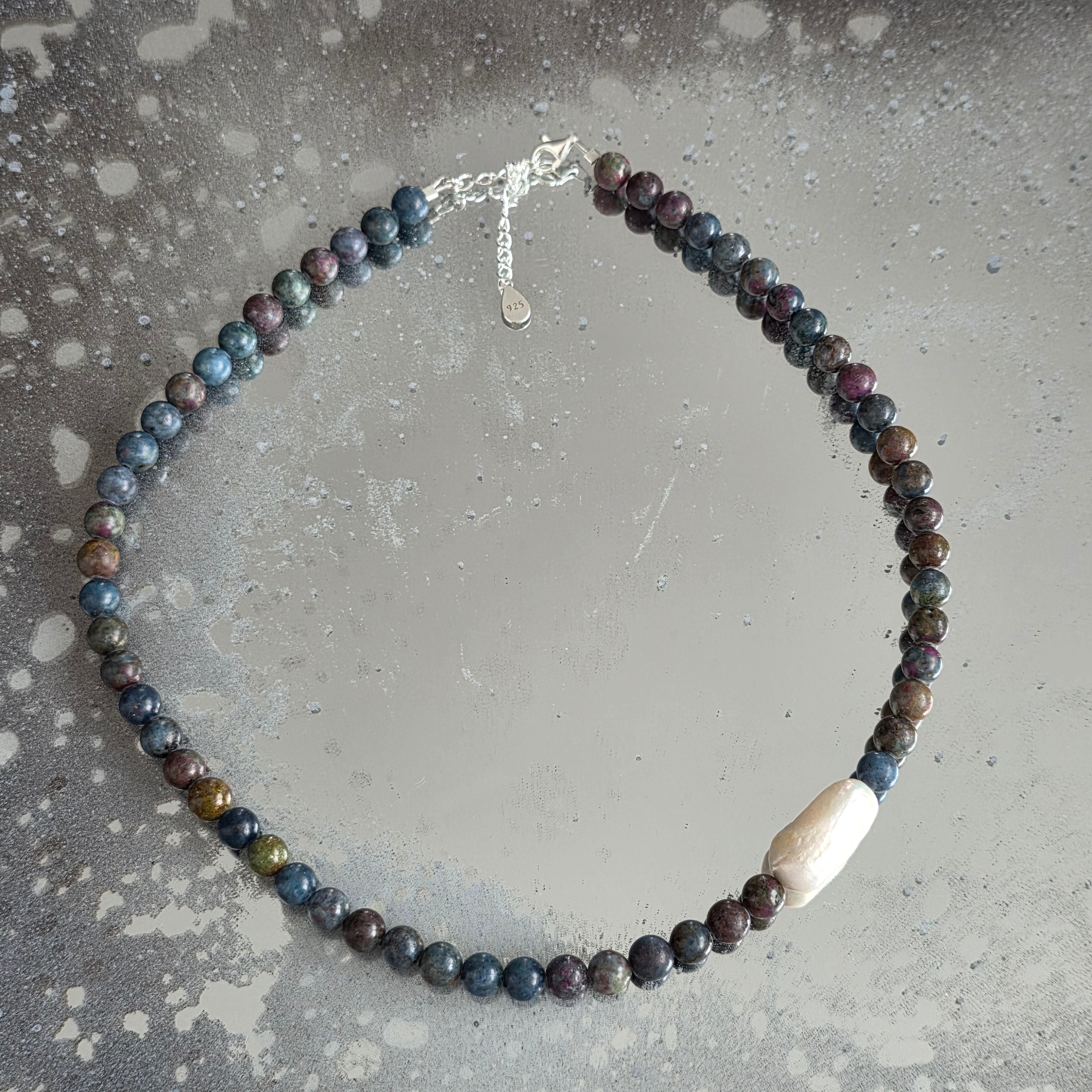 A necklace with noble elegance, where the intensity of sapphire and the warmth of ruby meet in a subtle play of contrast and refinement. Accented with a baroque pearl placed slightly to the side, as an unexpected detail, this jewelry piece gains a unique, imperfect, and memorable personality.