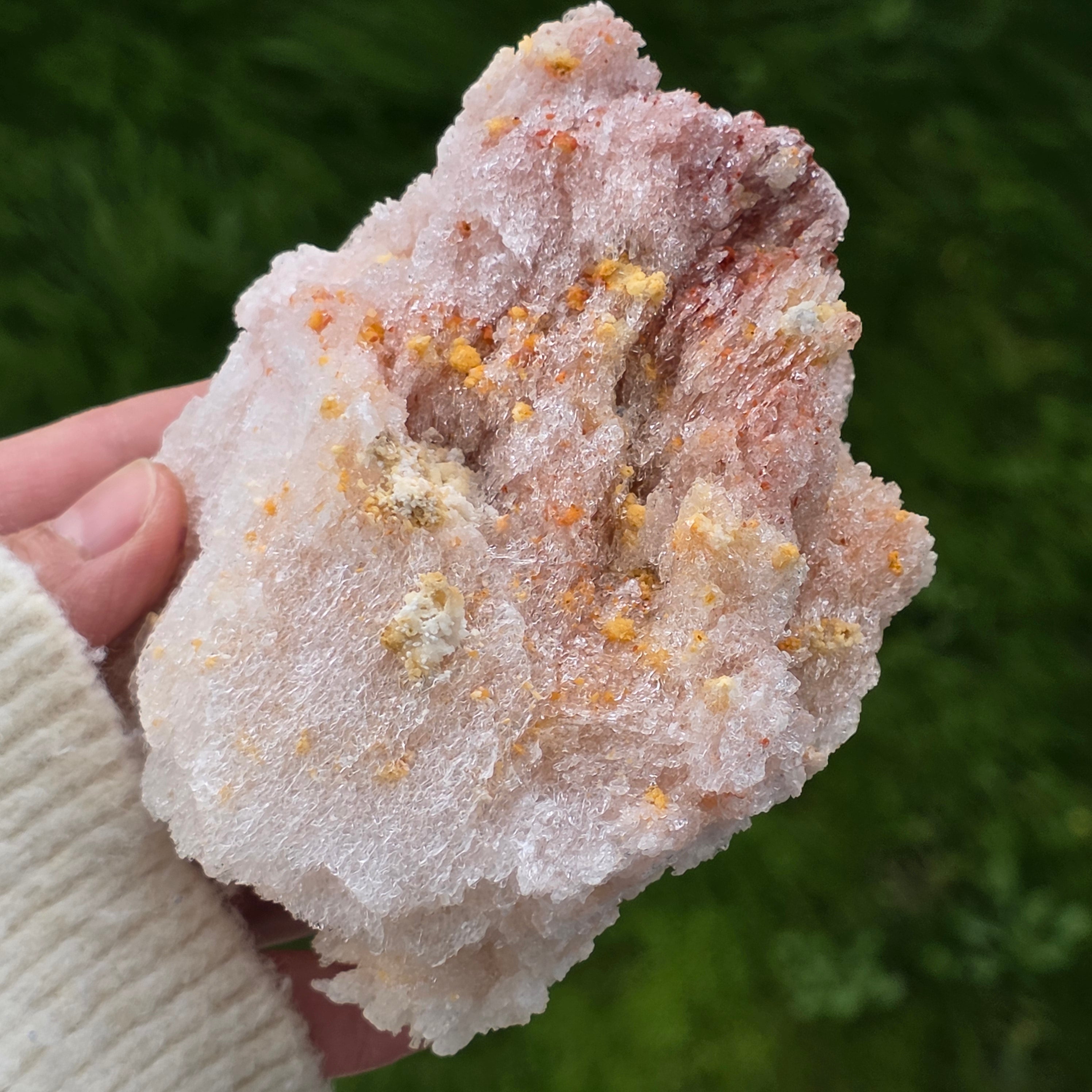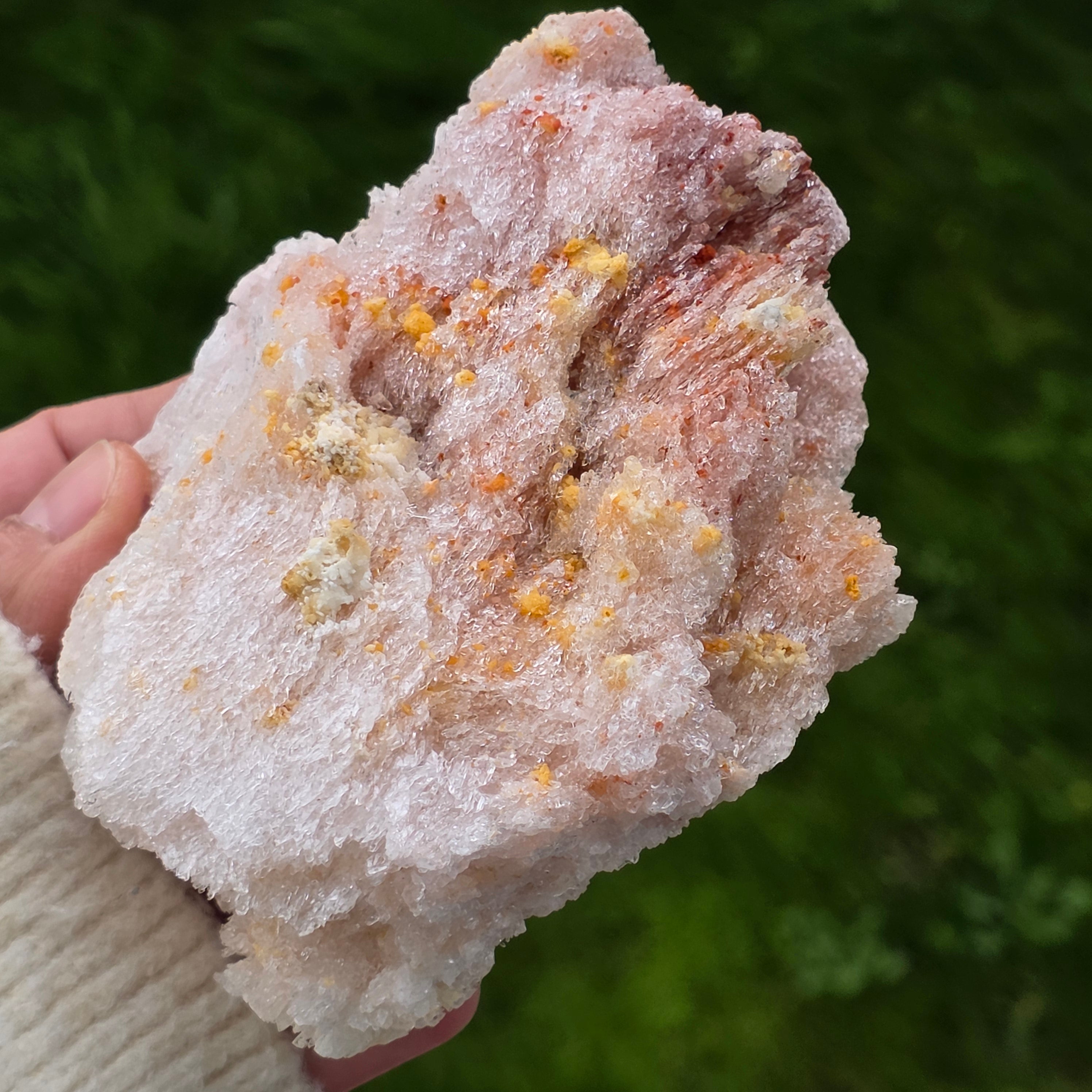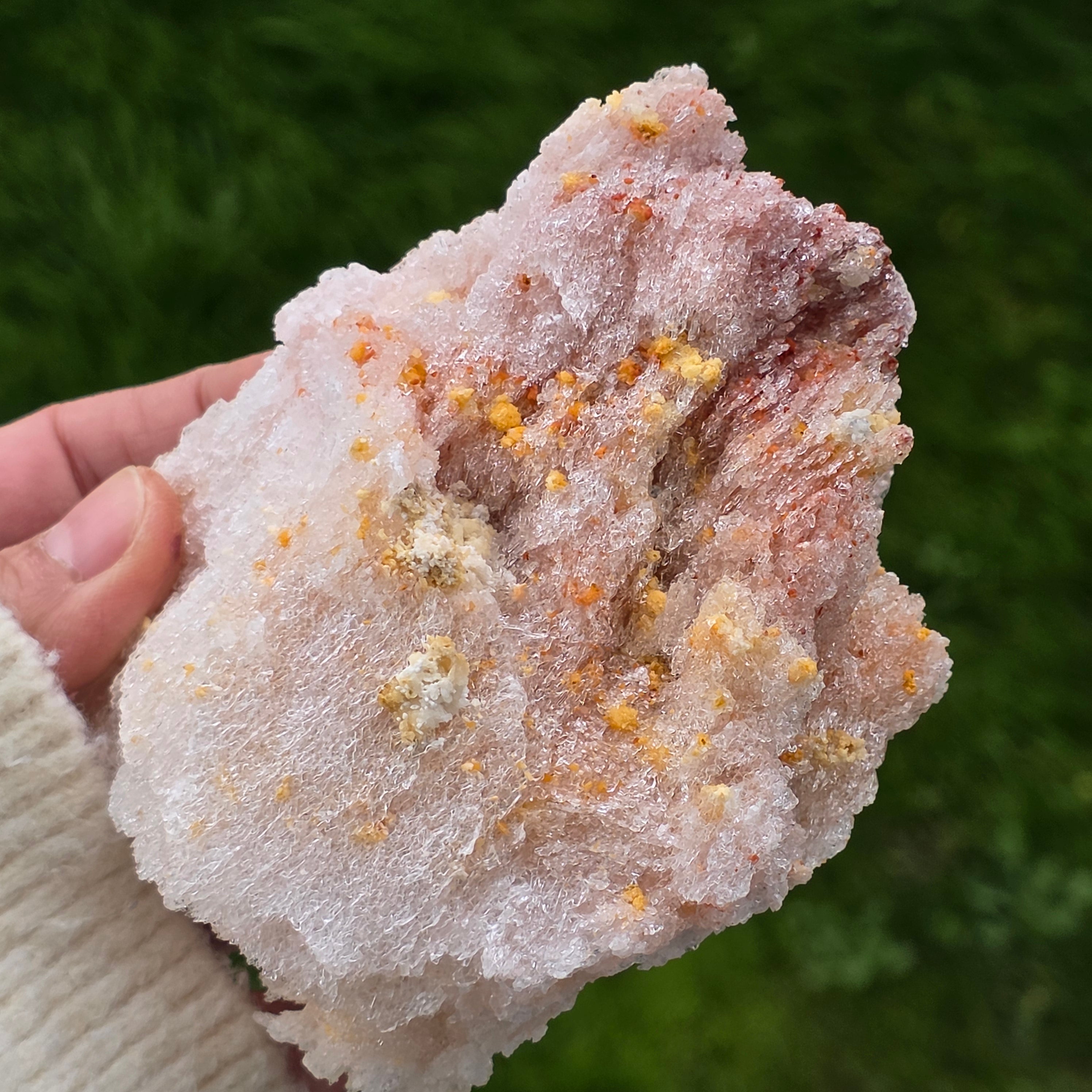 Rezultatul este o asociere mineralogică coerentă, în care matricea alb-translucidă de selenit este traversată sau punctată de incluziuni roșii de cinabar, fără delimitări artificiale. Cele două minerale sunt intim legate structural și vizual, cinabarul accentuând forma și transparența selenitului, iar selenitul punând în evidență culoarea intensă a cinabarului.