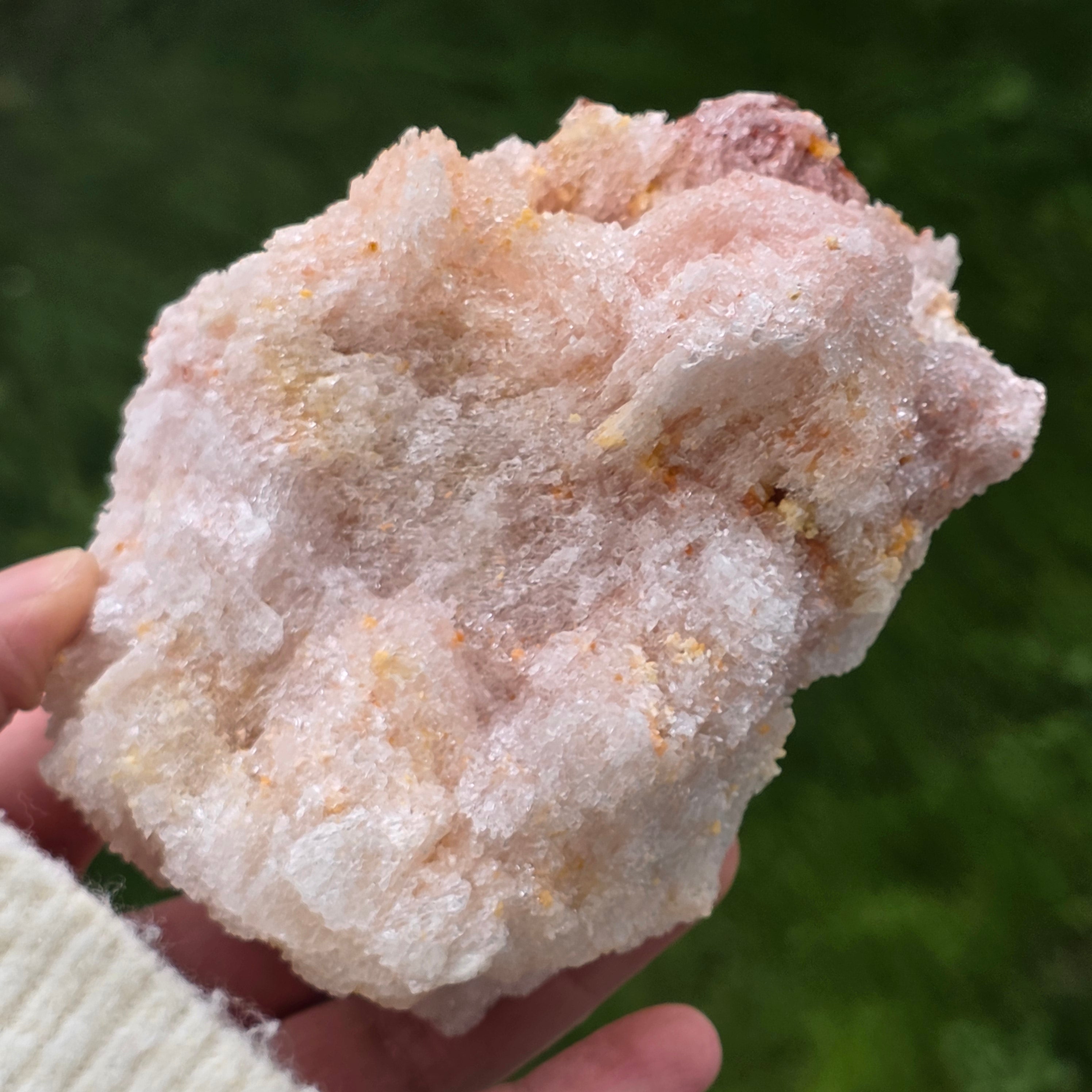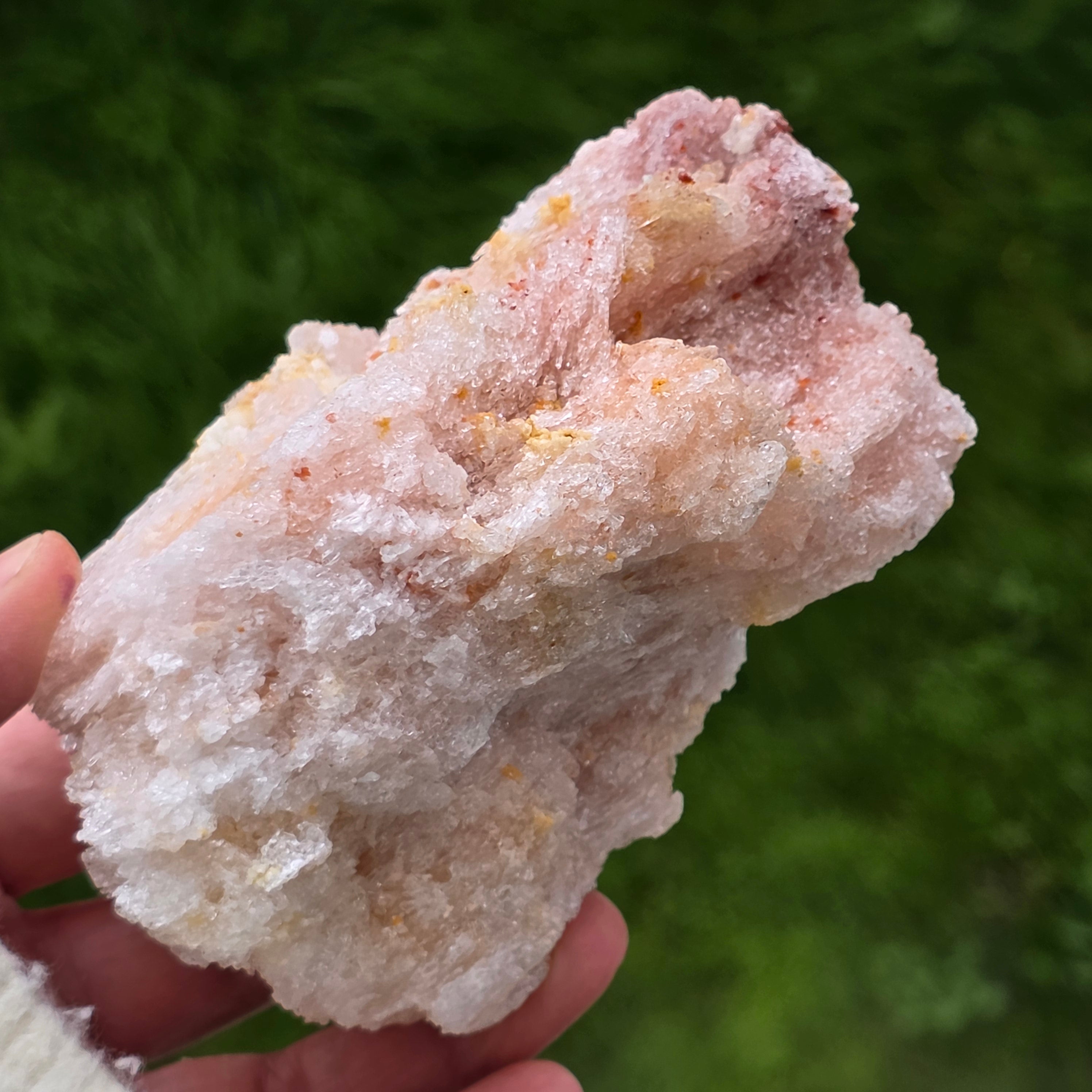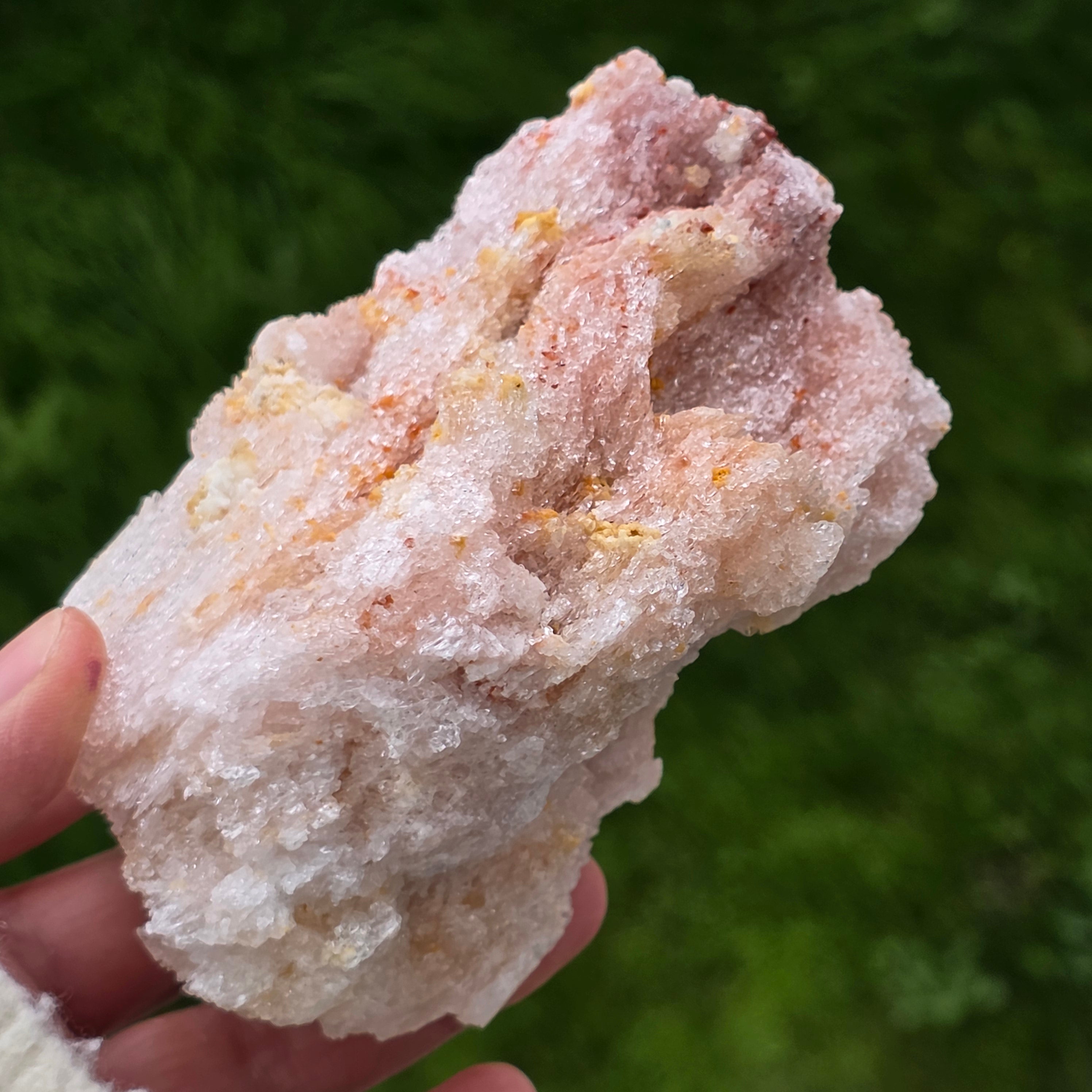 Rezultatul este o asociere mineralogică coerentă, în care matricea alb-translucidă de selenit este traversată sau punctată de incluziuni roșii de cinabar, fără delimitări artificiale. Cele două minerale sunt intim legate structural și vizual, cinabarul accentuând forma și transparența selenitului, iar selenitul punând în evidență culoarea intensă a cinabarului.