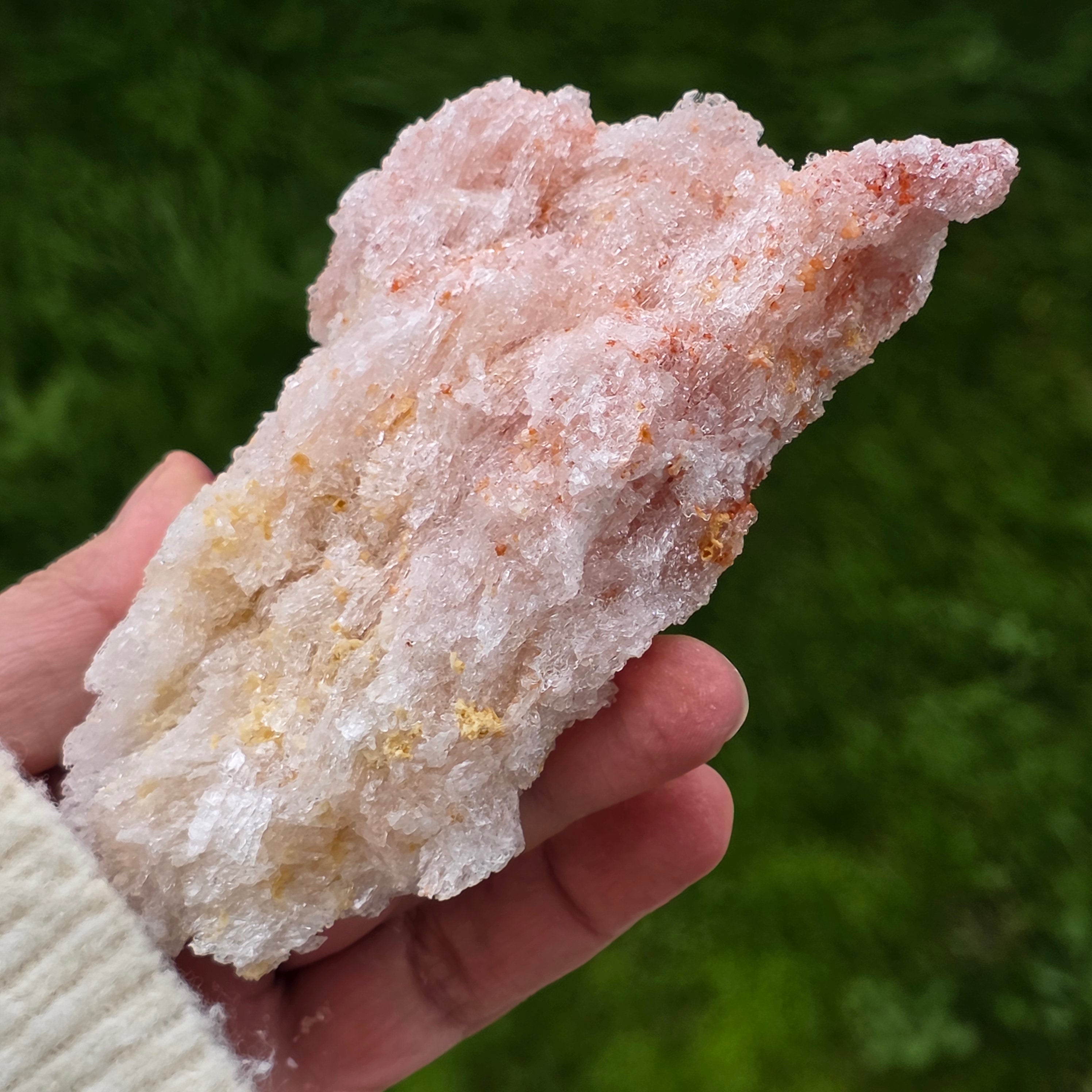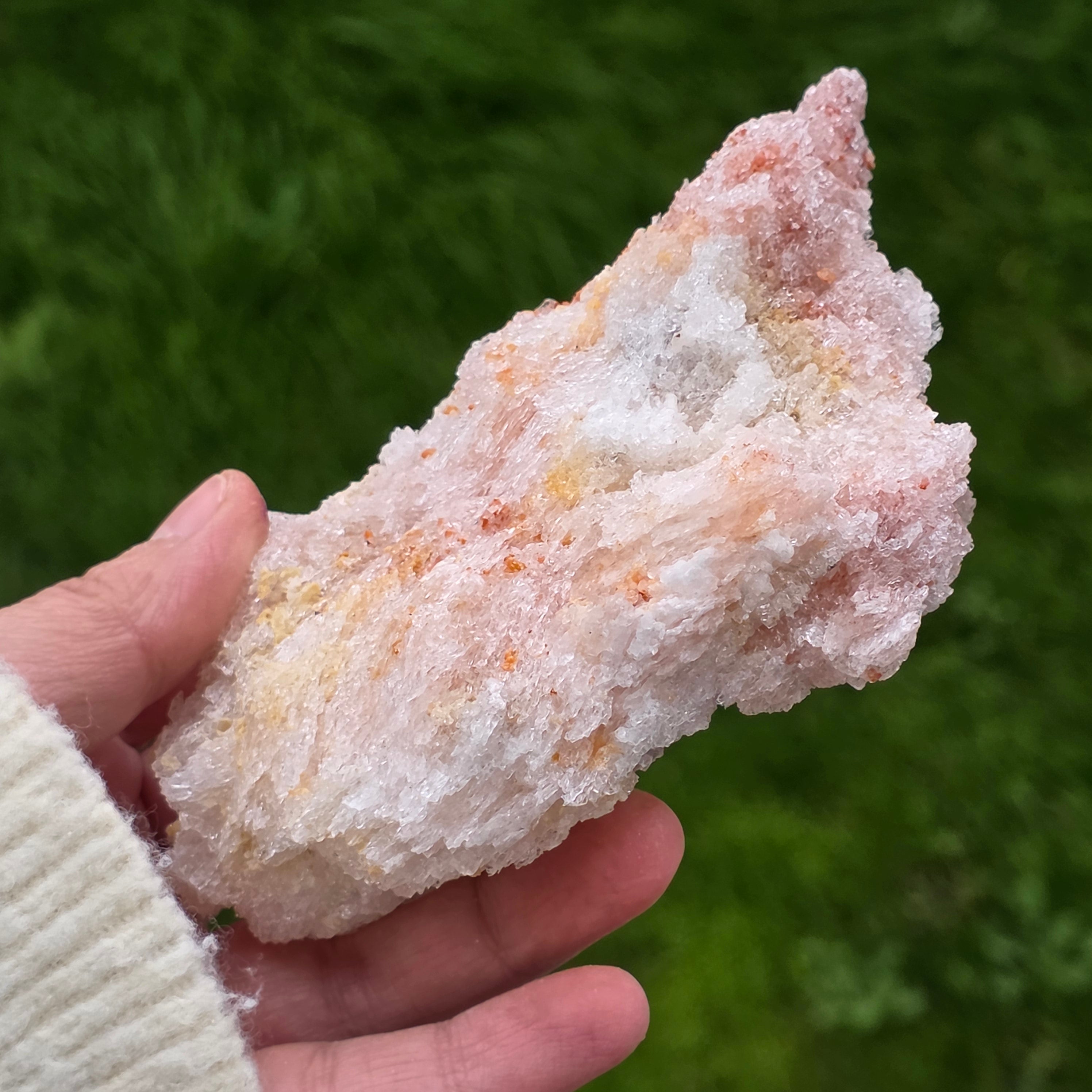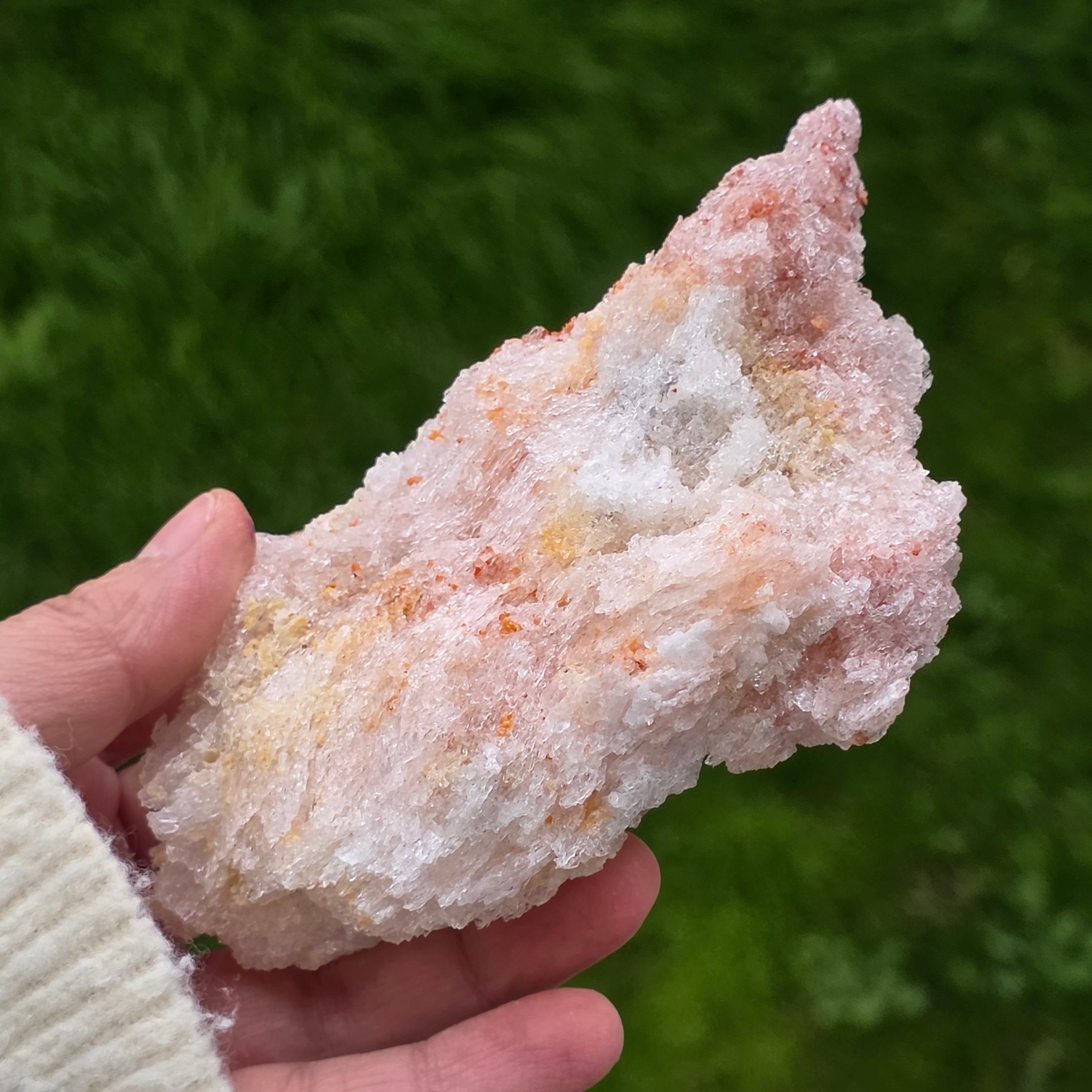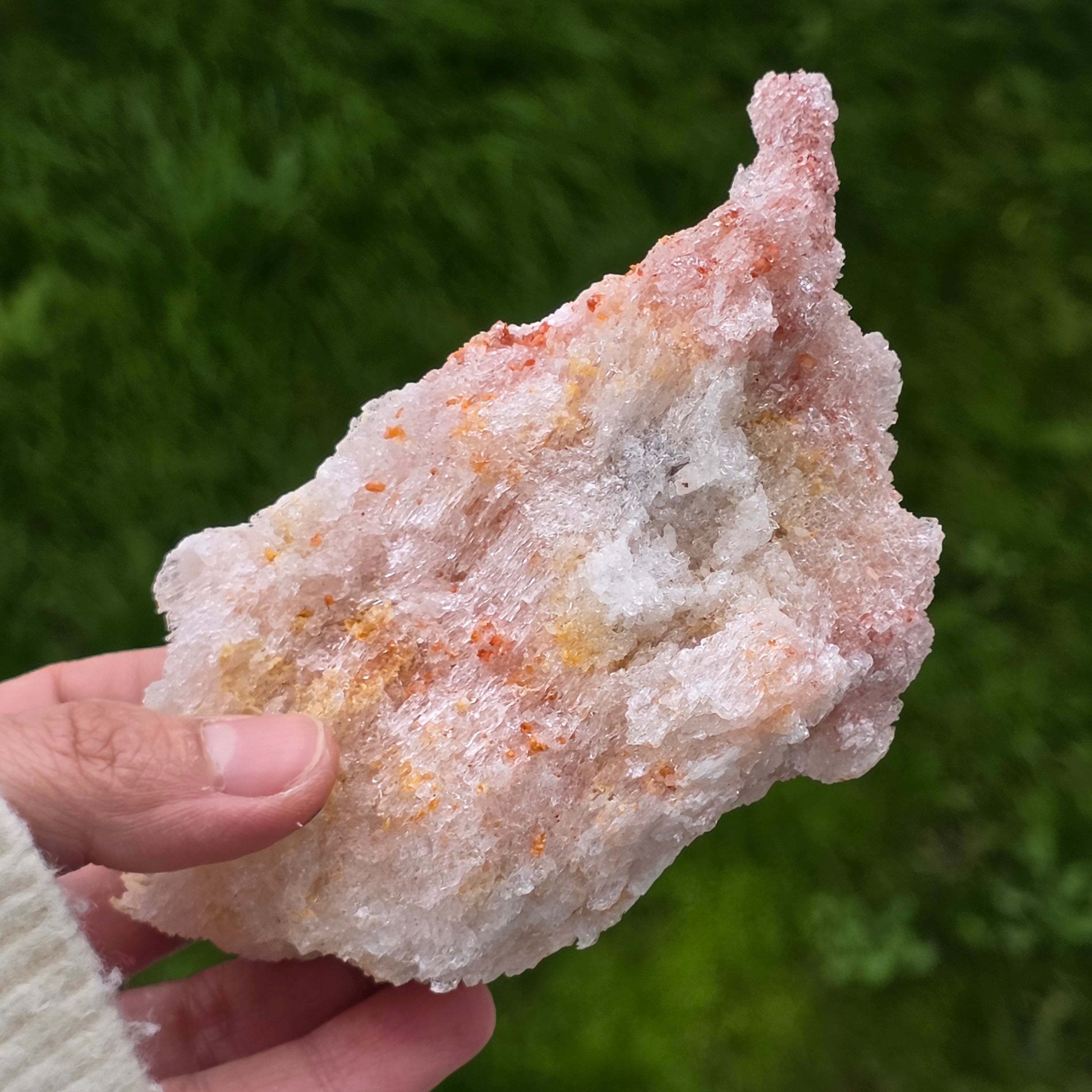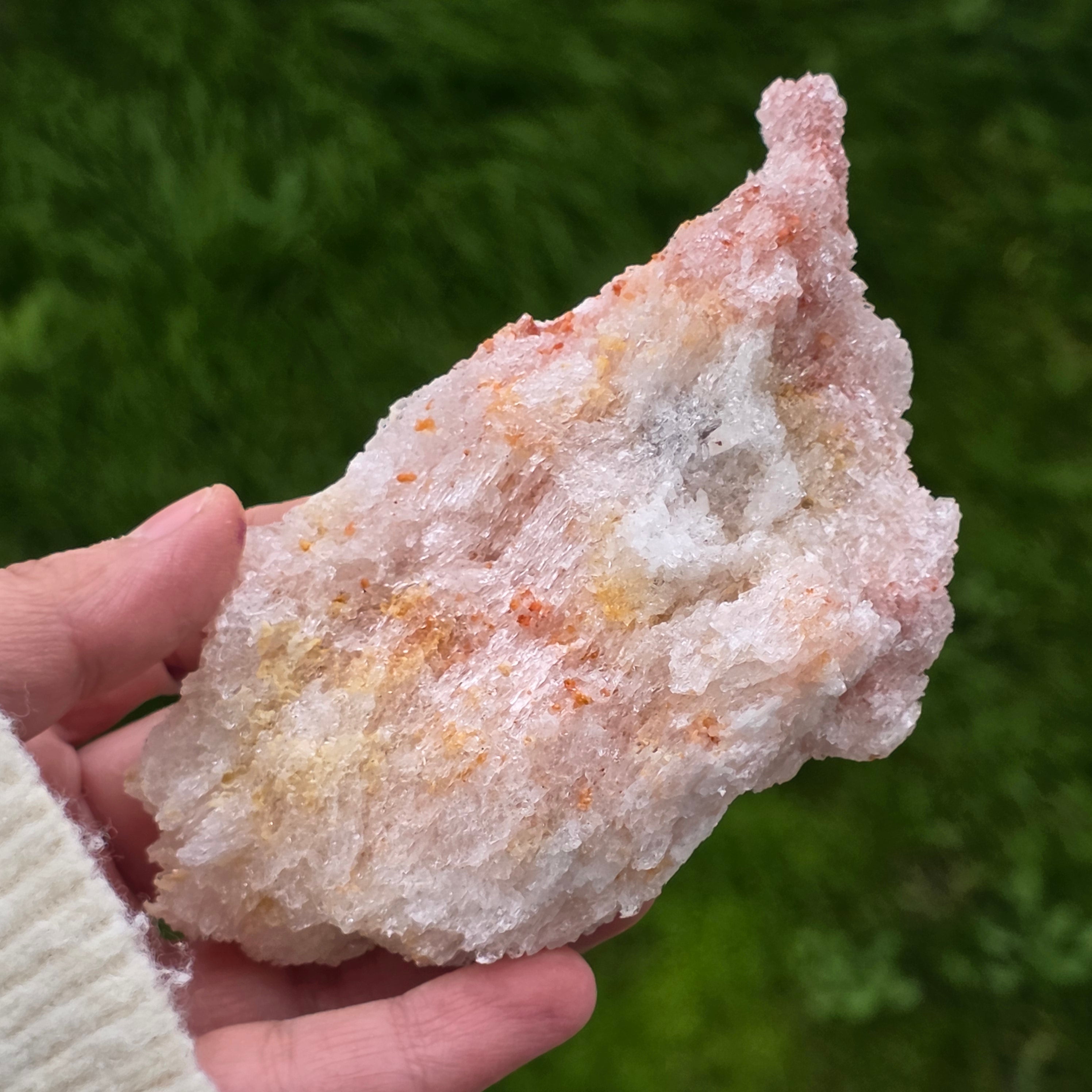 Rezultatul este o asociere mineralogică coerentă, în care matricea alb-translucidă de selenit este traversată sau punctată de incluziuni roșii de cinabar, fără delimitări artificiale. Cele două minerale sunt intim legate structural și vizual, cinabarul accentuând forma și transparența selenitului, iar selenitul punând în evidență culoarea intensă a cinabarului.