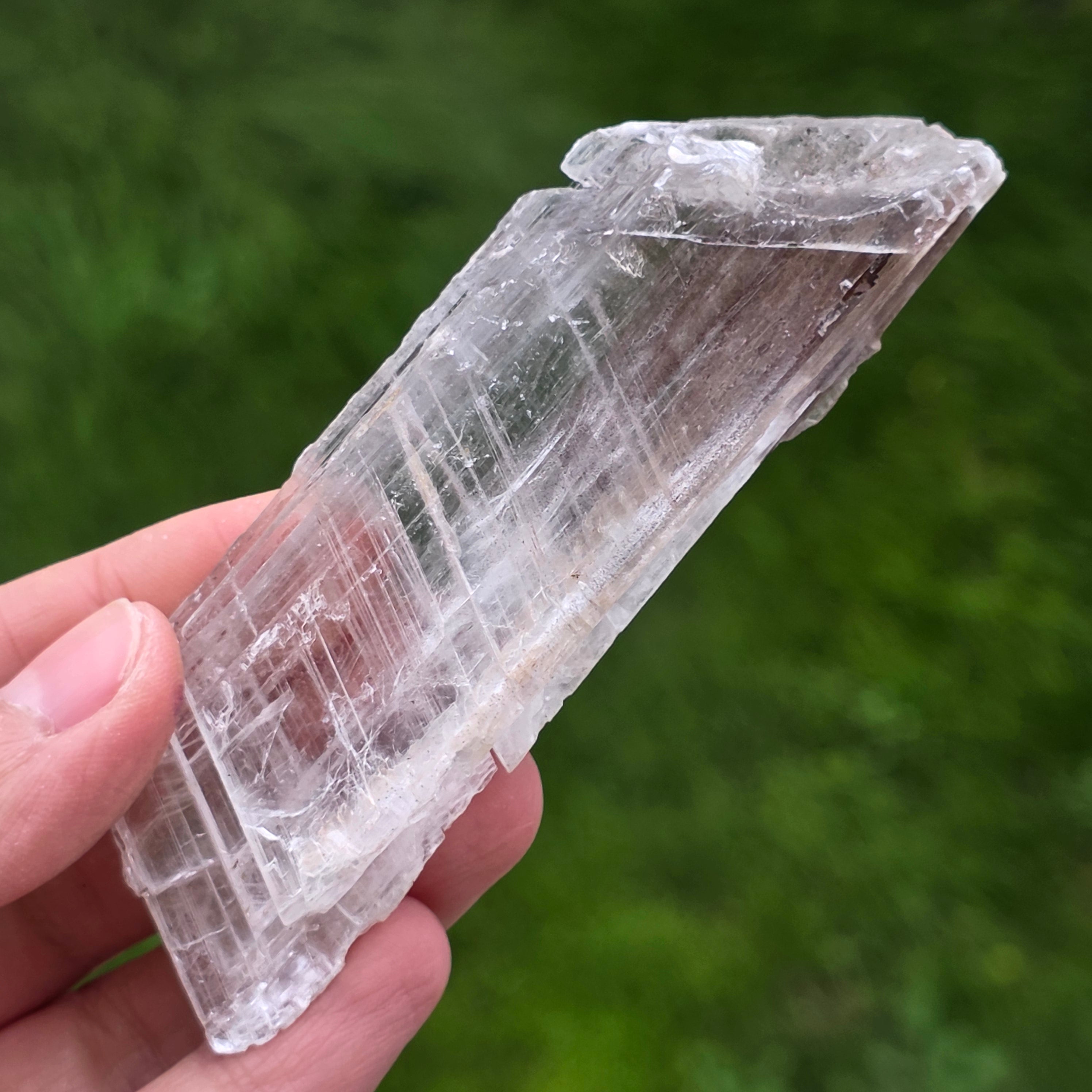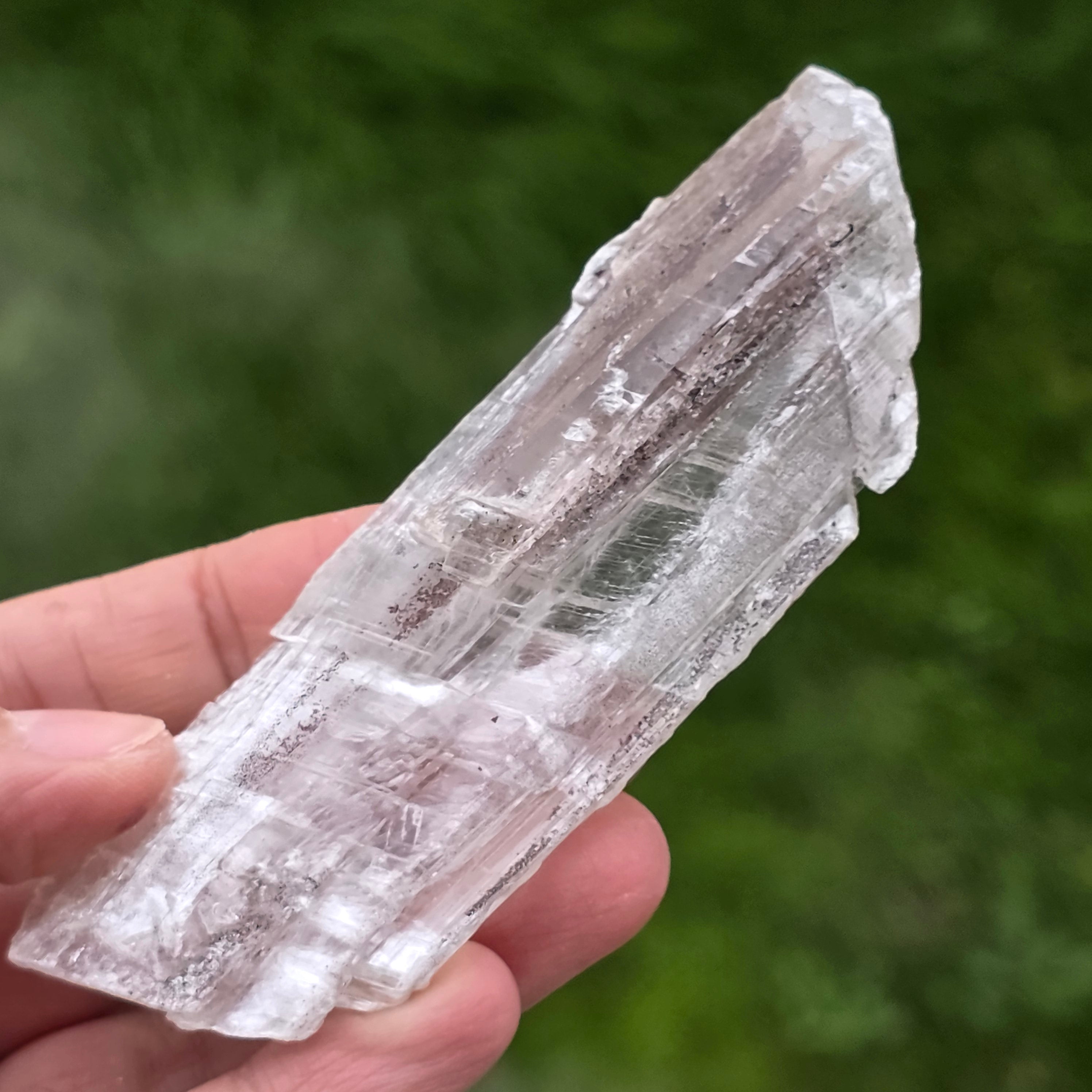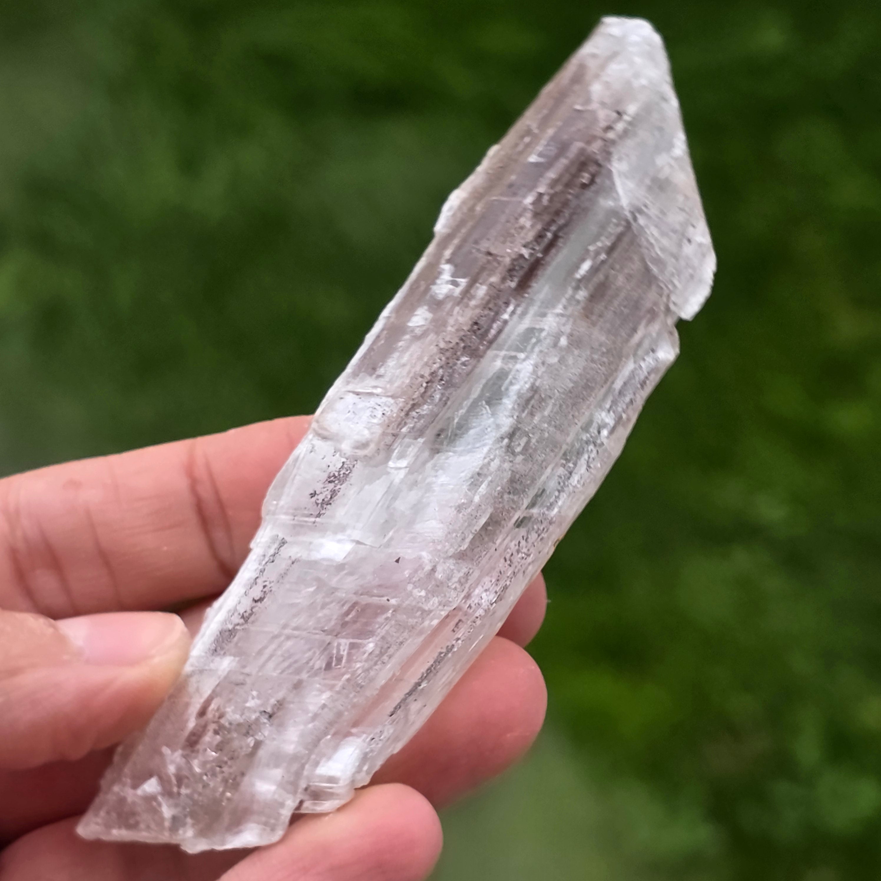 Selenitul apare sub formă de cristale alungite sau plăci translucide, cu luciu mătăsos și textură fină, în timp ce hematitul este prezent sub formă de incluziuni, pelicule sau depuneri naturale, care accentuează structura cristalului și îi conferă profunzime vizuală.