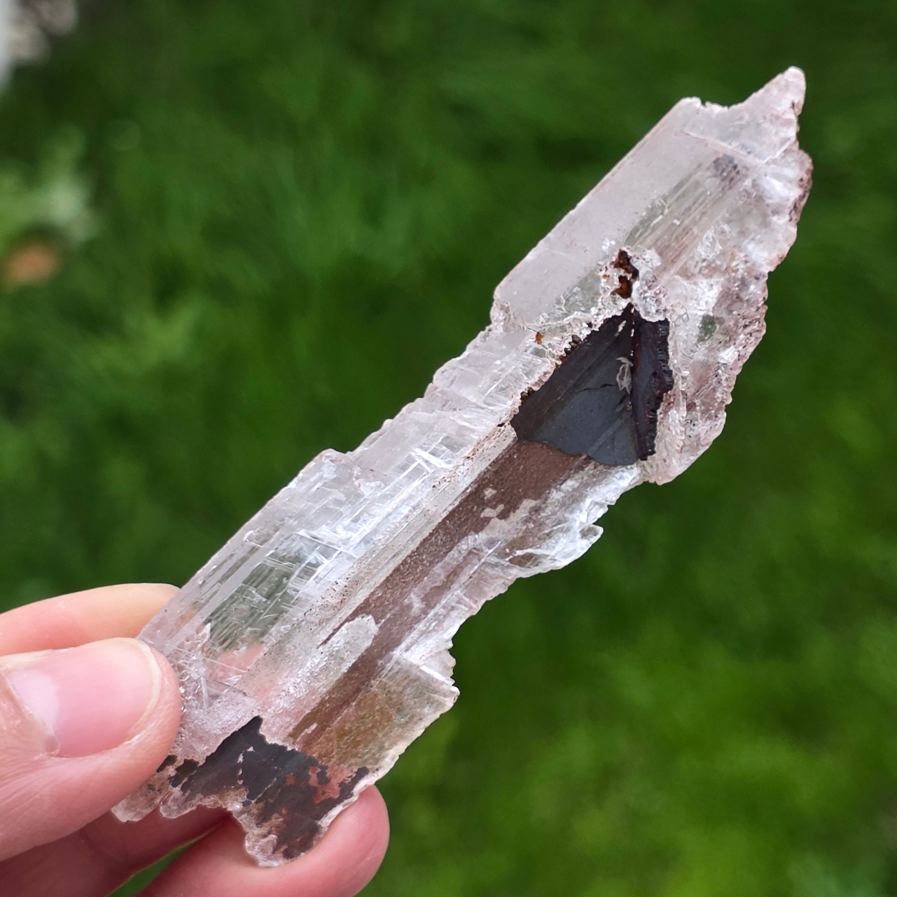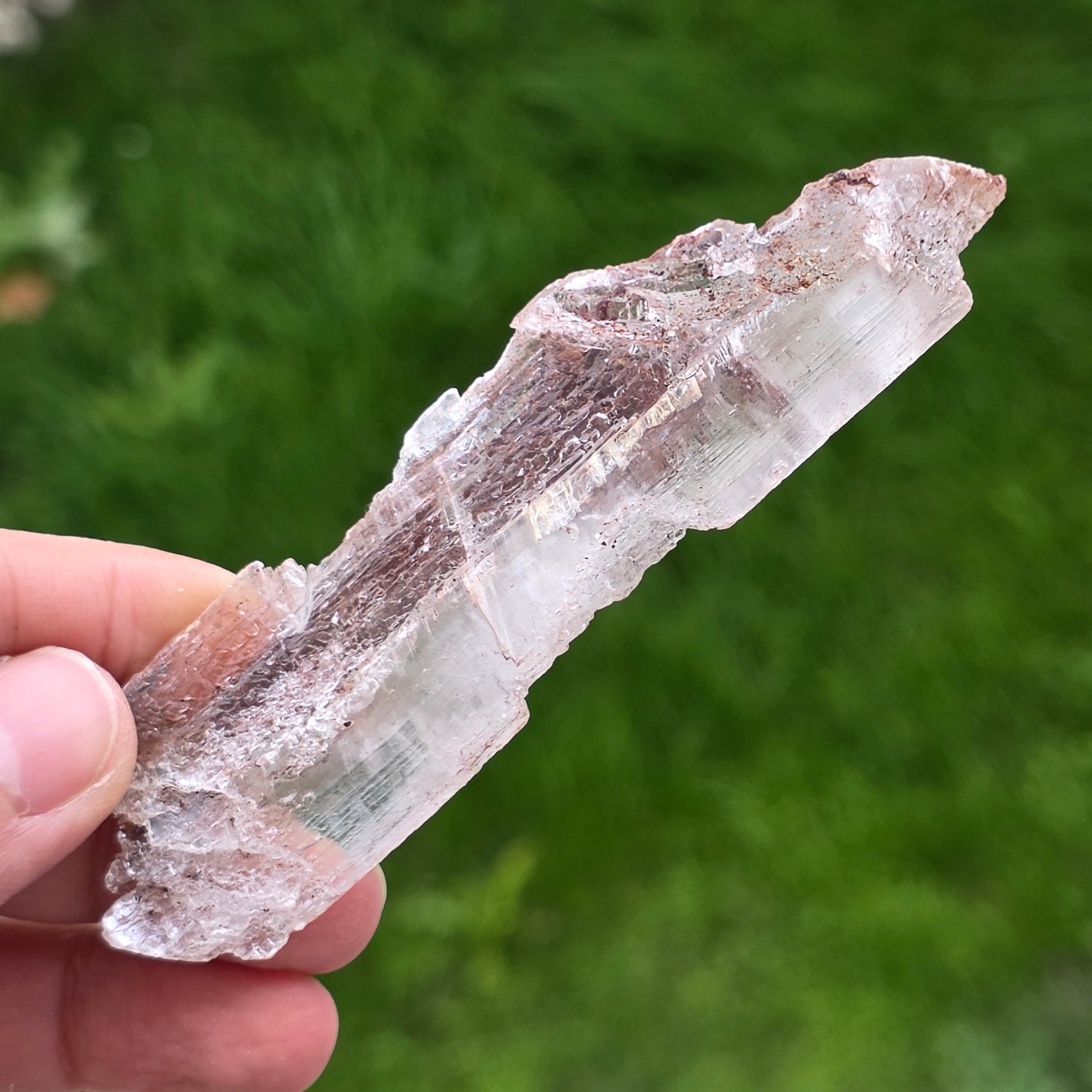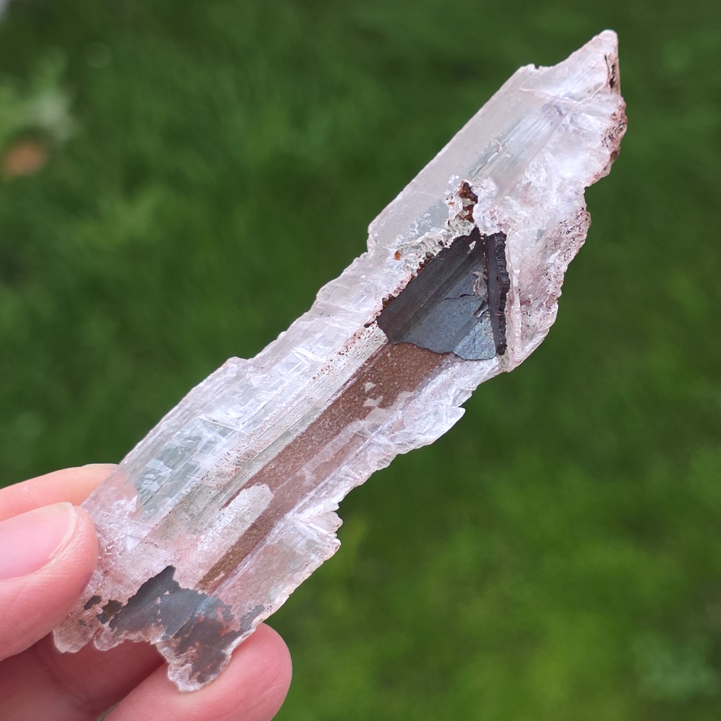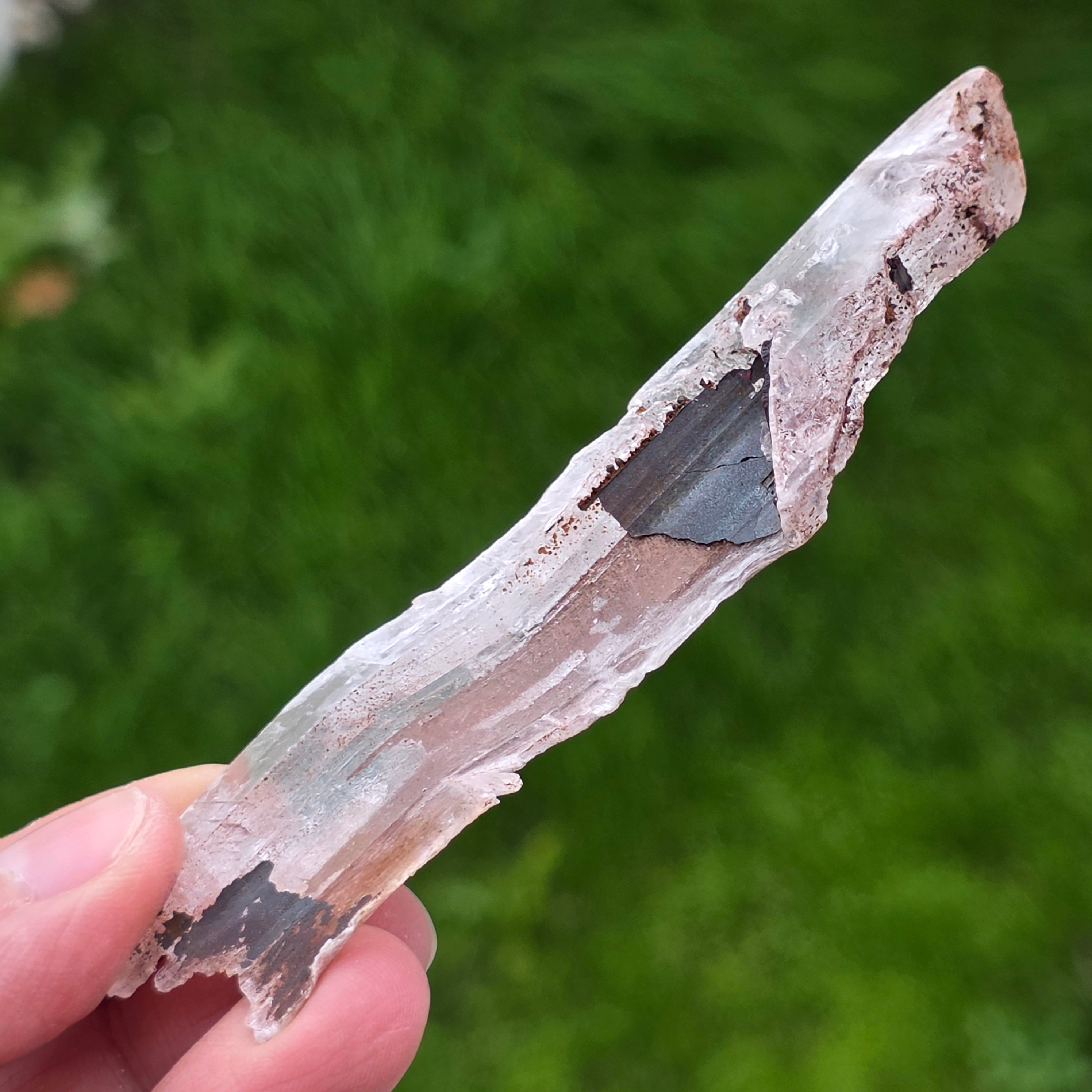 Selenitul apare sub formă de cristale alungite sau plăci translucide, cu luciu mătăsos și textură fină, în timp ce hematitul este prezent sub formă de incluziuni, pelicule sau depuneri naturale, care accentuează structura cristalului și îi conferă profunzime vizuală.